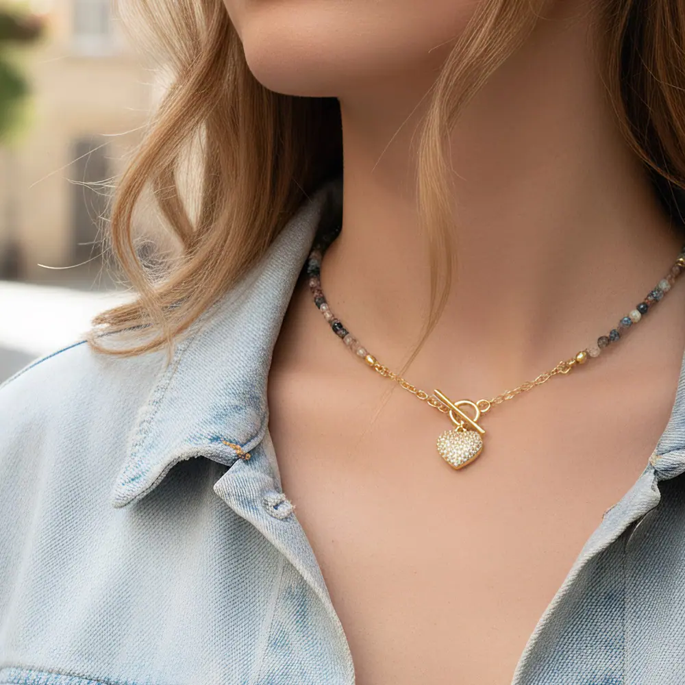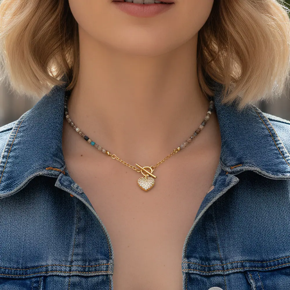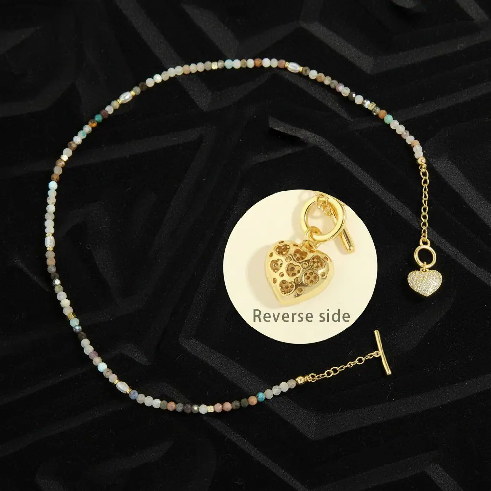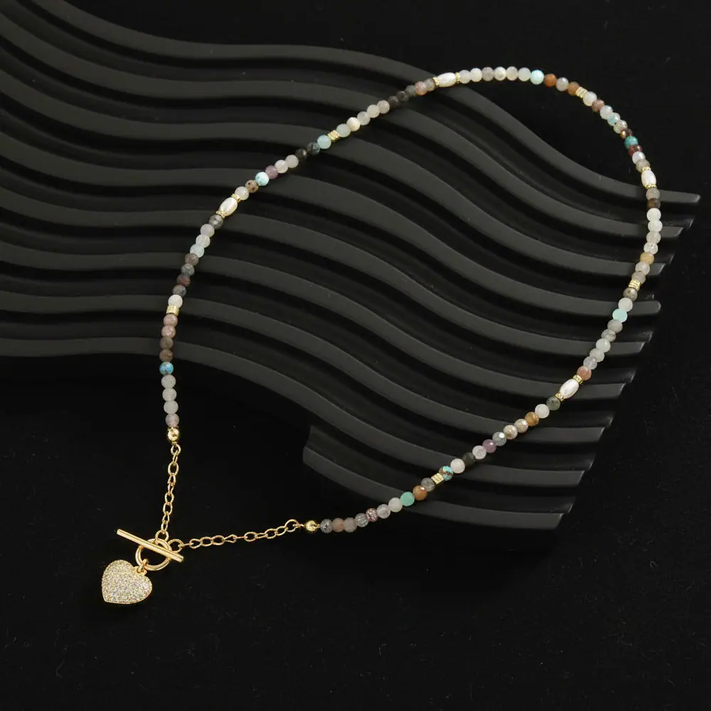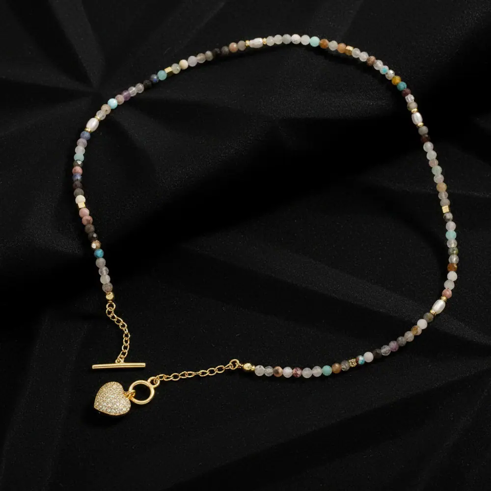 Collar Europeo y Americano Bohemio Dulce Color Piedra con Cuentas Personalidad Temperamento Micro-incrustado Colgante en Forma de Corazón de Amor Cadena Clavícula
