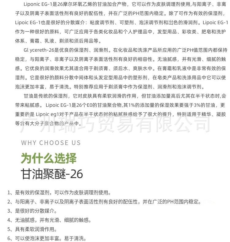 Su excelente efecto lubricante es especialmente adecuado para cremas de afeitar, enjuagues bucales y tónicos. Es un humectante muy eficaz en cremas y lociones. Se usa bien en cremas de afeitar como humectante, lubricante, lubricante y regulador de espuma.