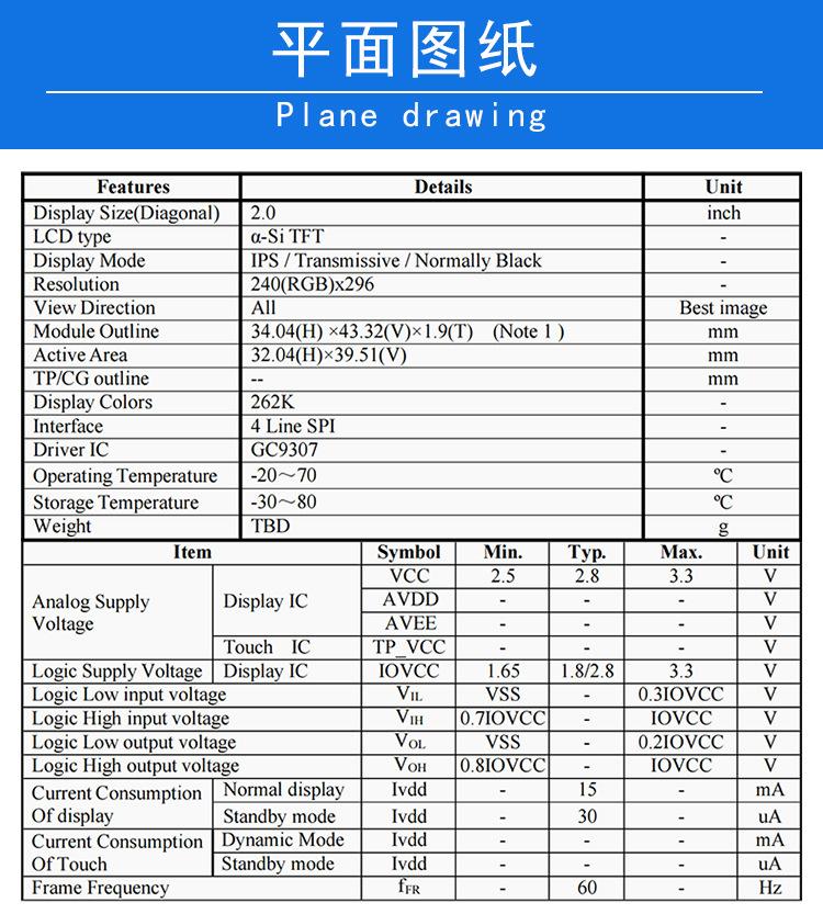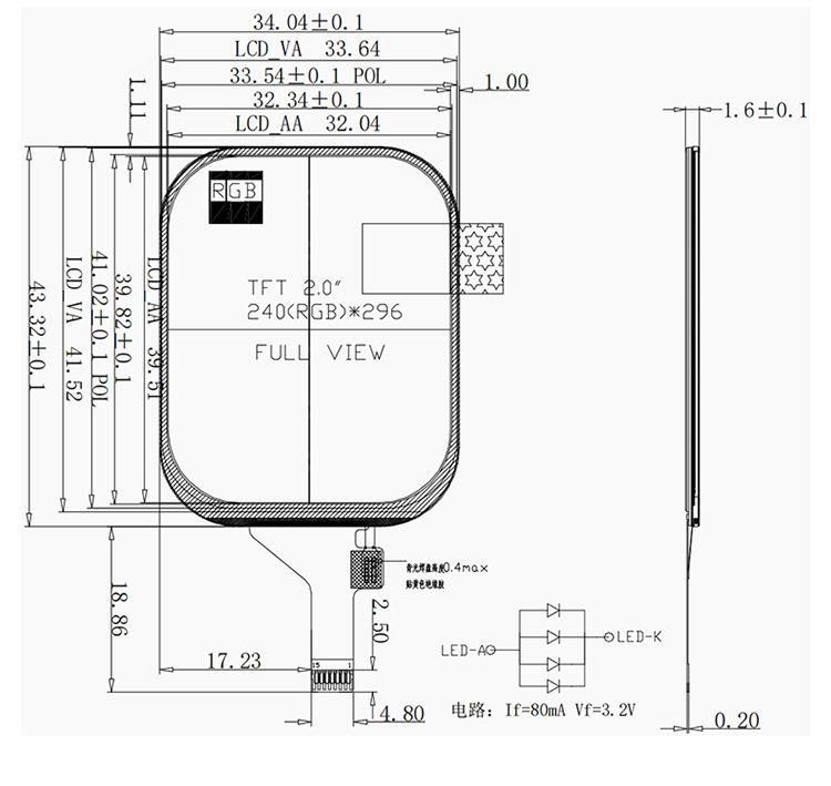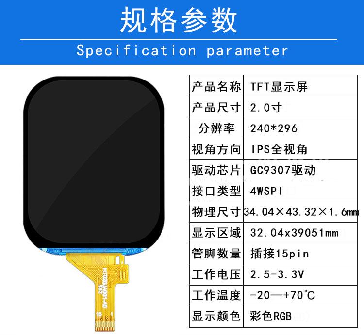 Pantalla digital para instrumento portátil inteligente con resolución 240X296, TFT LCD IPS de 2,0 pulgadas y vista completa