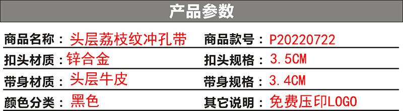 La superficie de este producto está hecha de piel de vaca con grano lichi, y la hebilla está hecha de aleación de zinc, que no se decolorará ni se oxidará.3,4 cm, el diámetro interior del descuento es3,5 cm