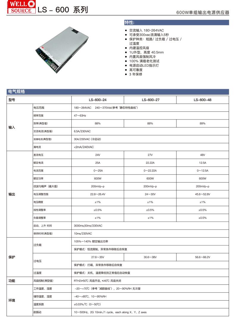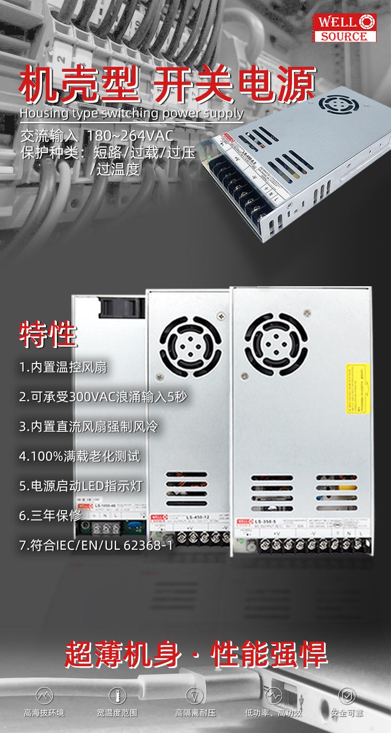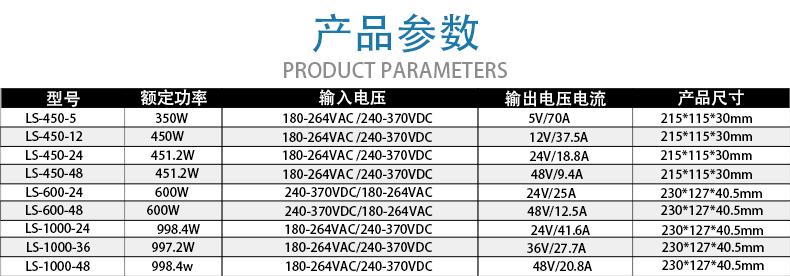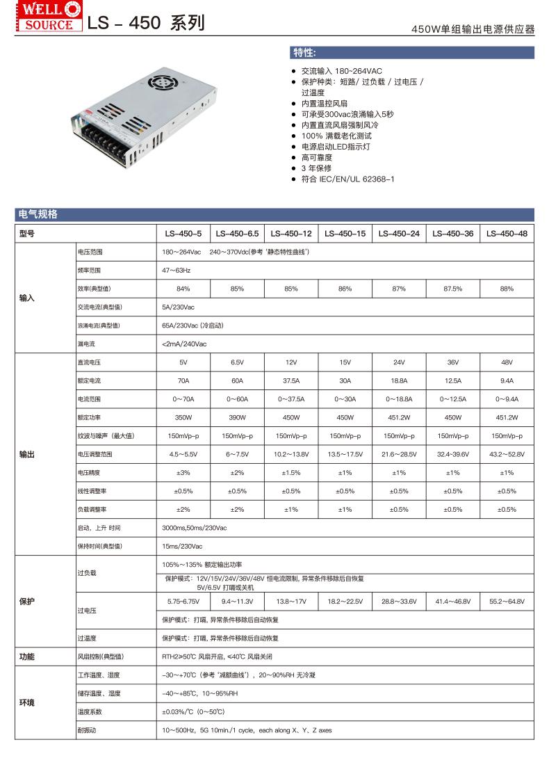 LS-450-5 | 5V/70A, LS-450-6.5 | 6.5V/60A, LS-450-12 | 12V/37.5A, LS-450-24 | 24V/18.8A, LS-450-48 | 48V/9.4A, ...