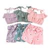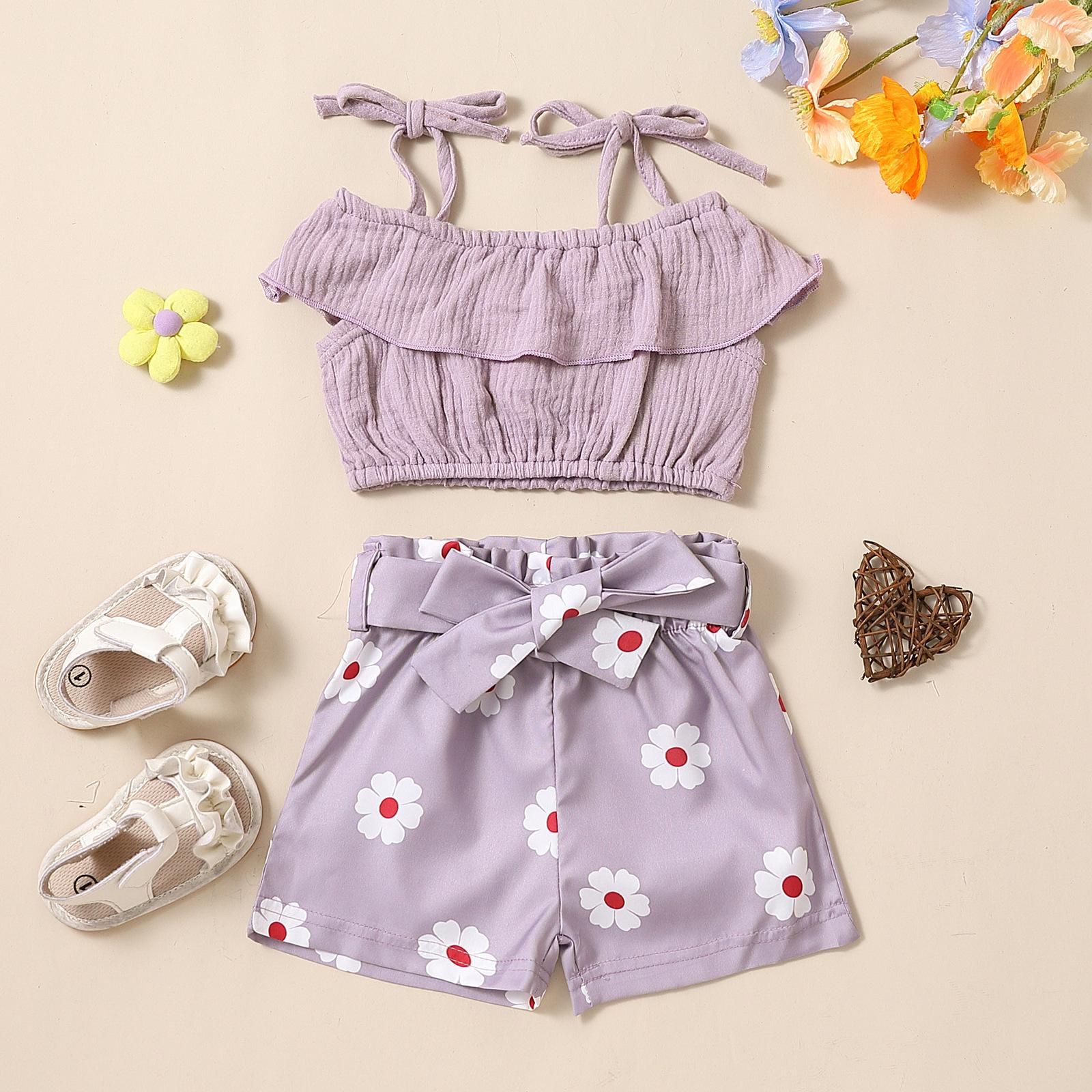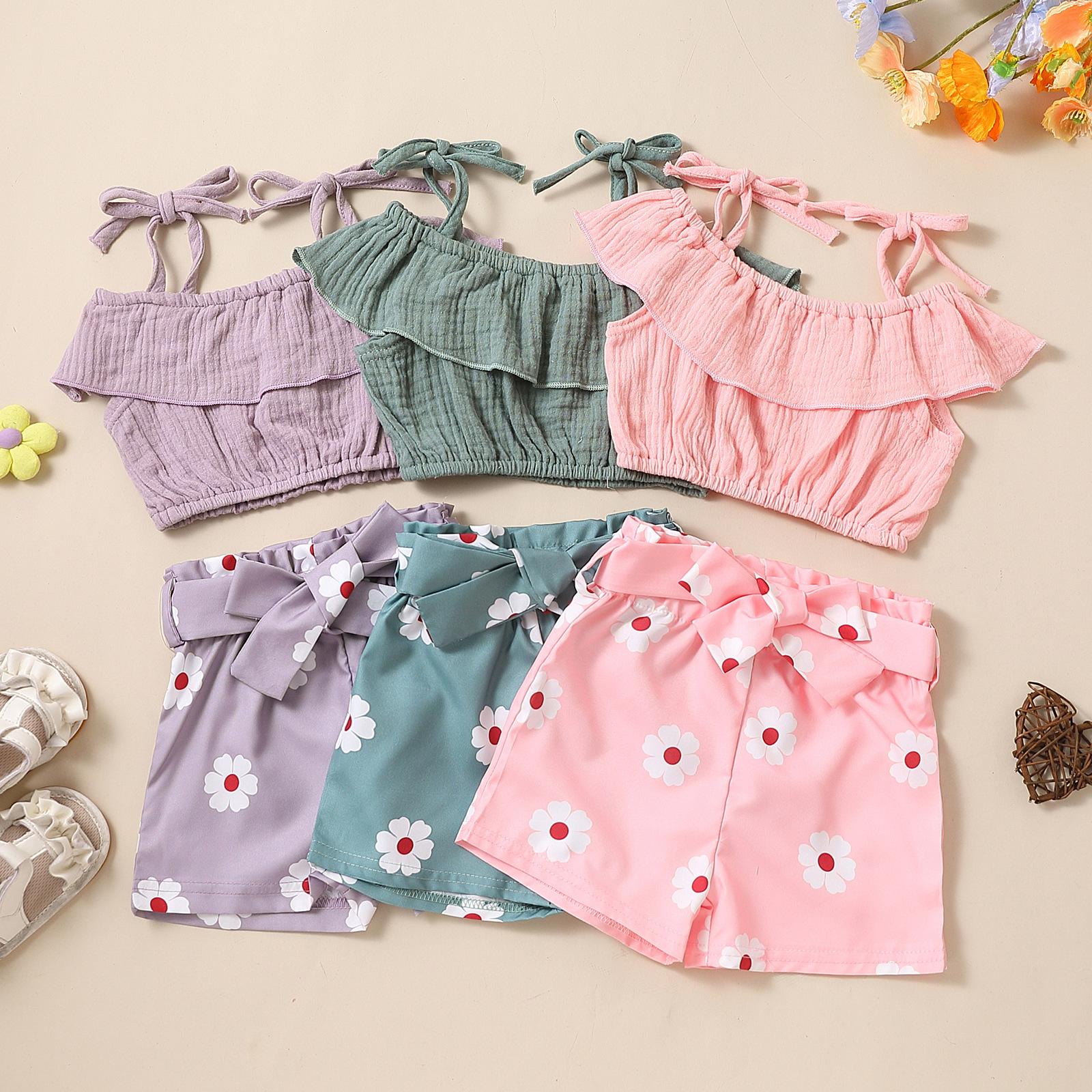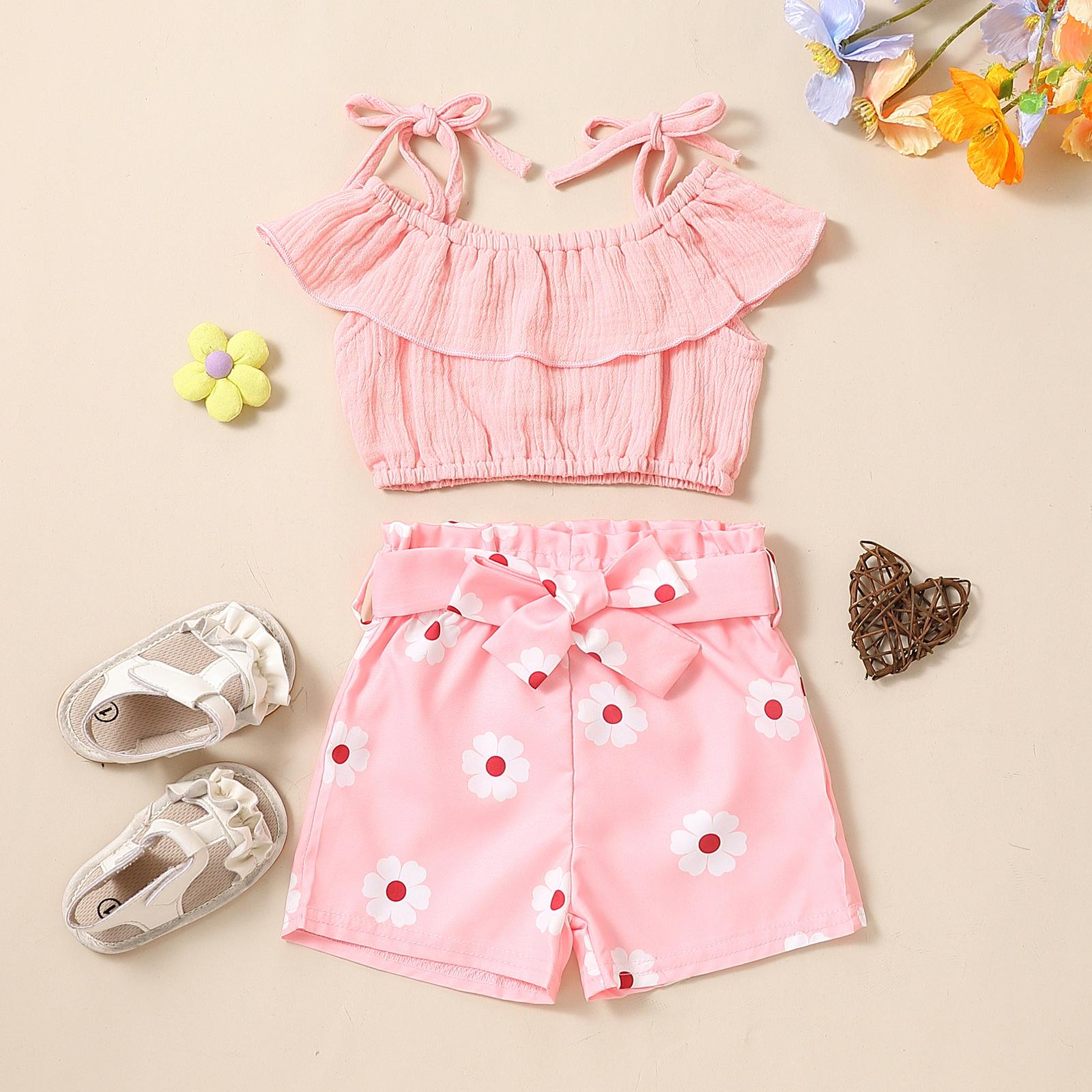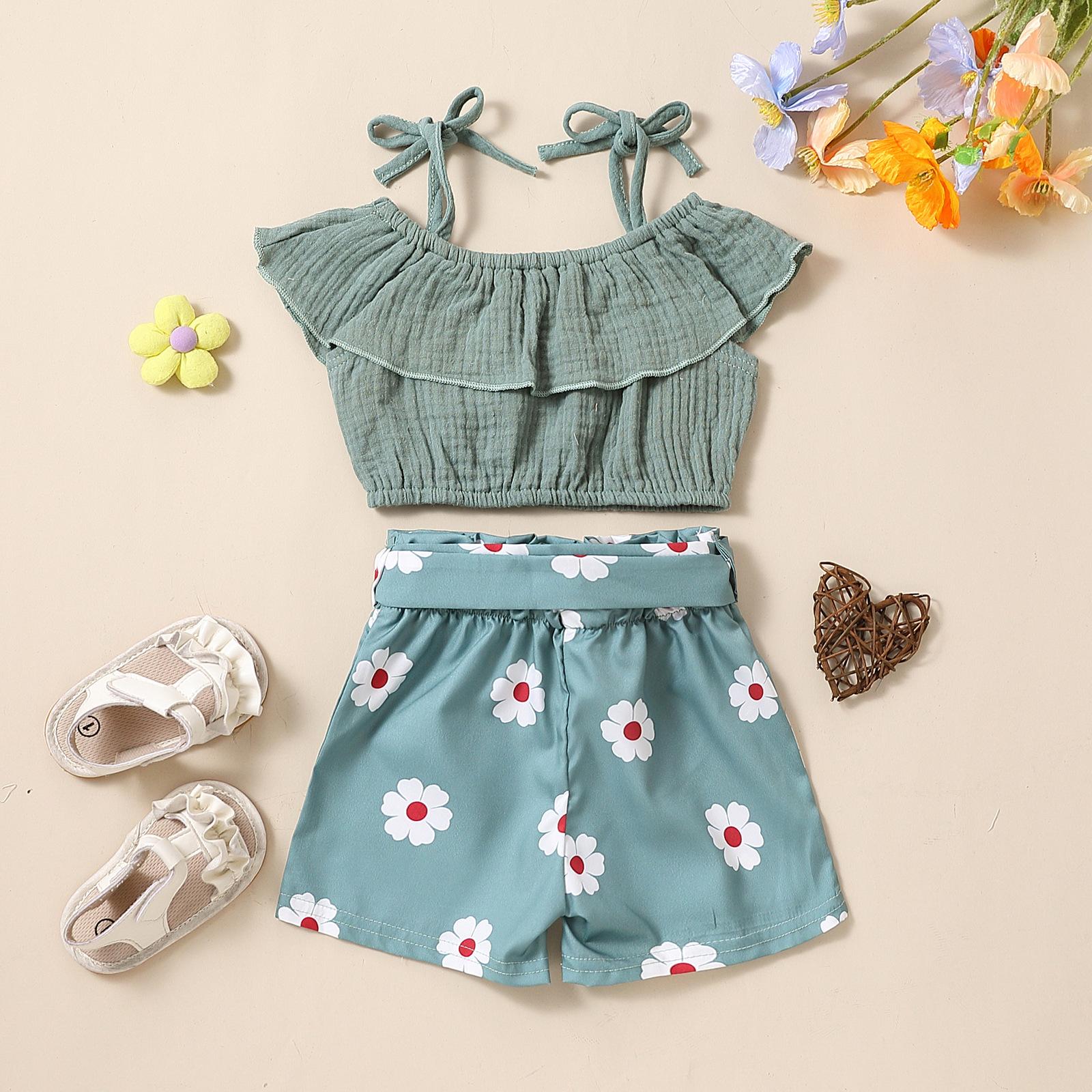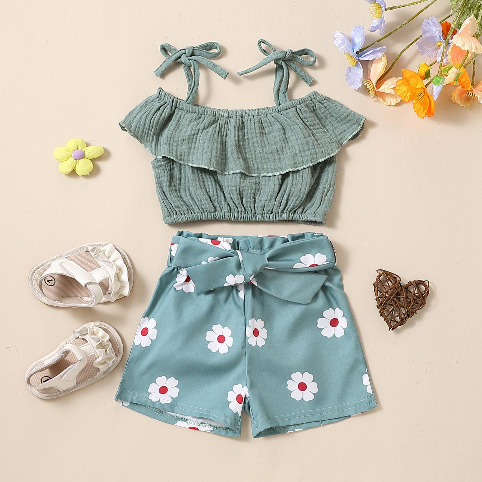 Conjunto de dos piezas para bebé niña transfronterizo, top de encaje con tirantes, shorts estampados de algodón, suave, combina con todo
