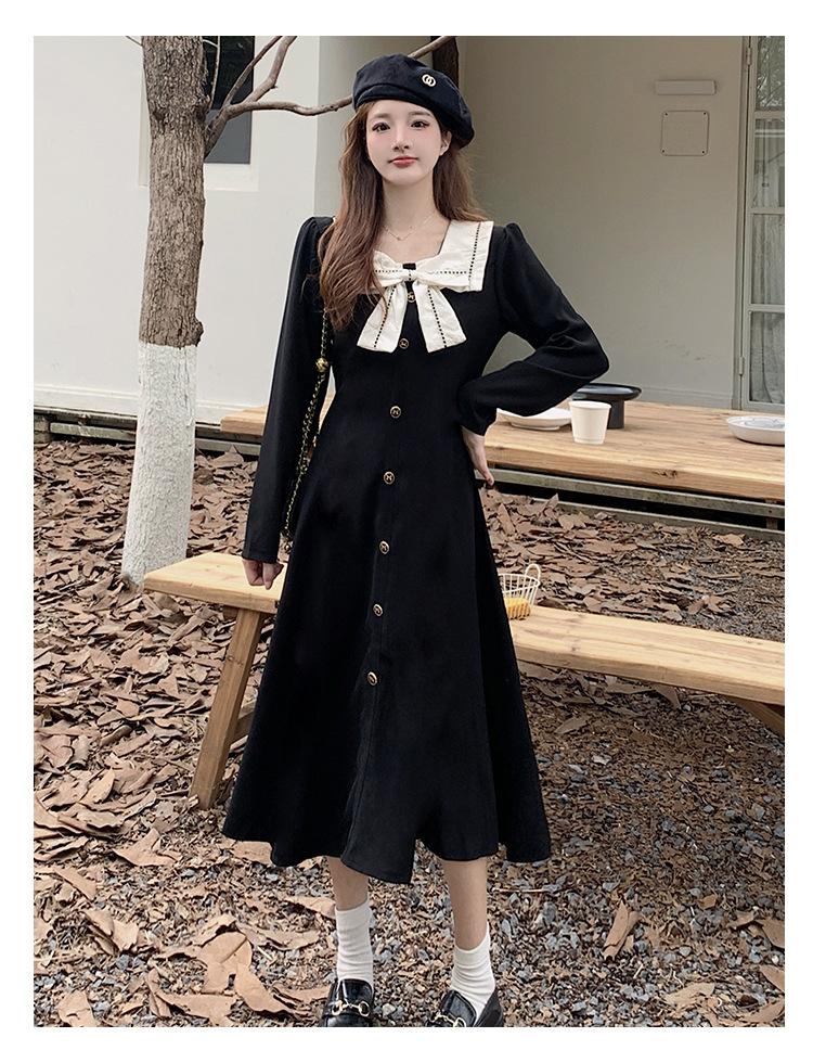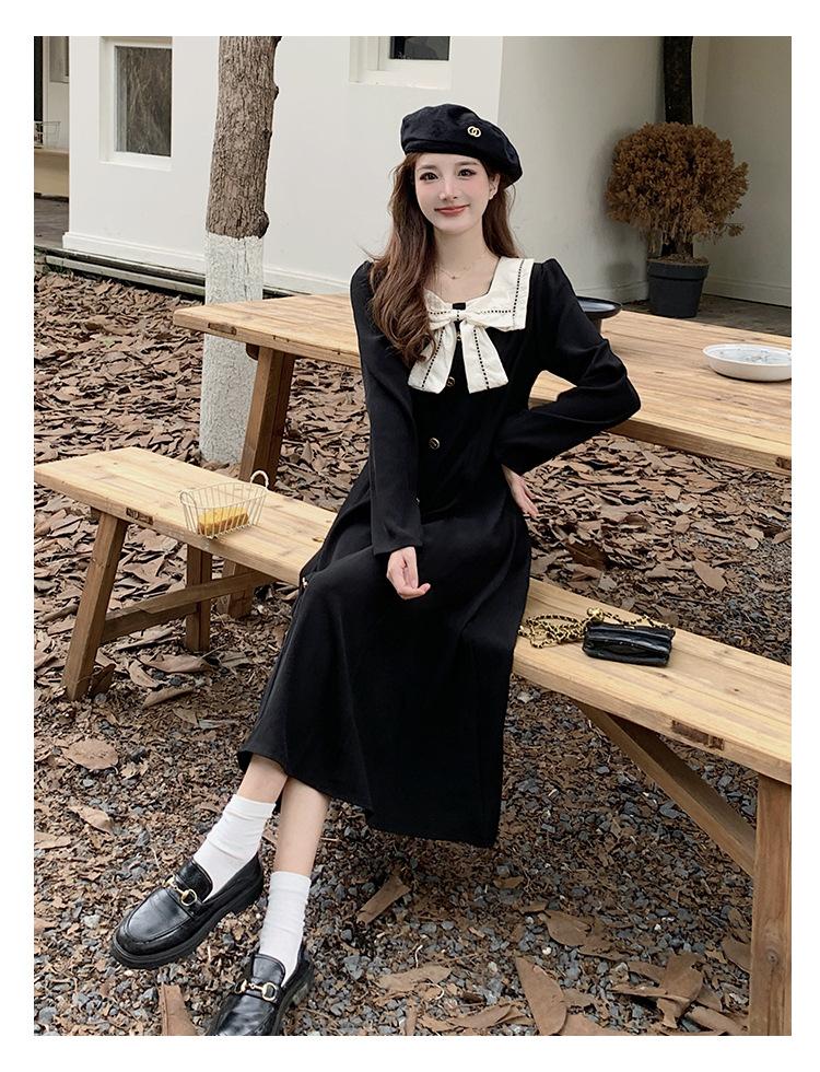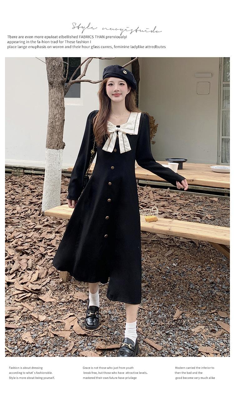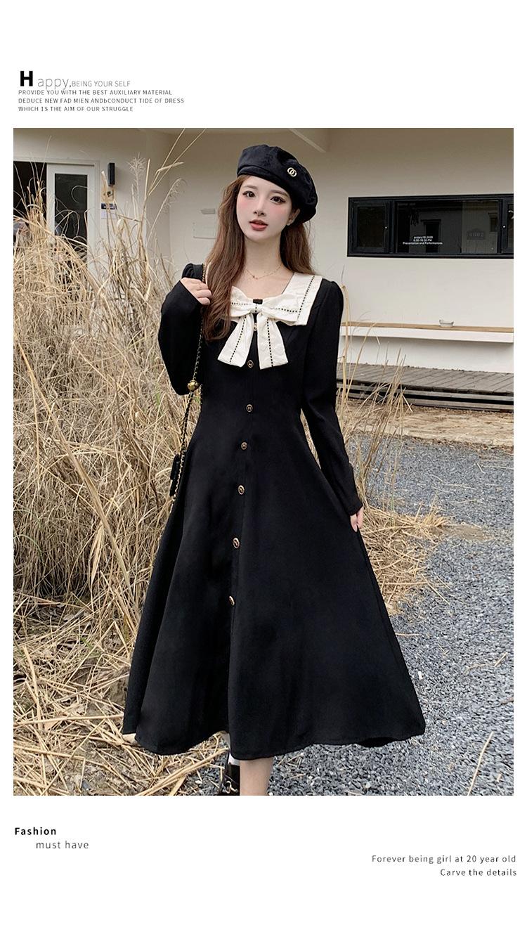 Primavera y Otoño chica gordita Forma de Pera Cintura Alta Estilo Francés Lazo Manga Larga Súper Delgada Vestido Alto Falda Larga Moda Estilo Coreano para Mujer