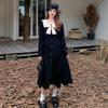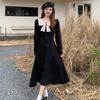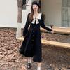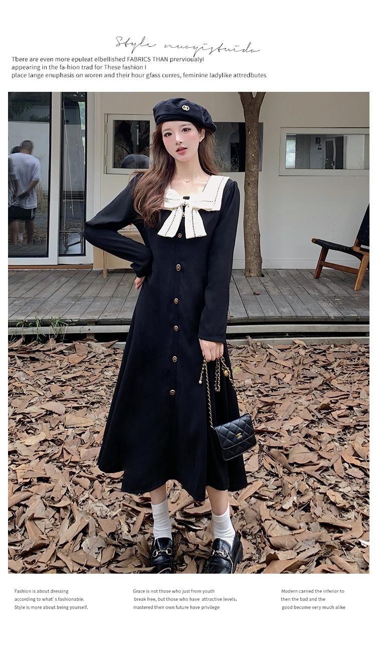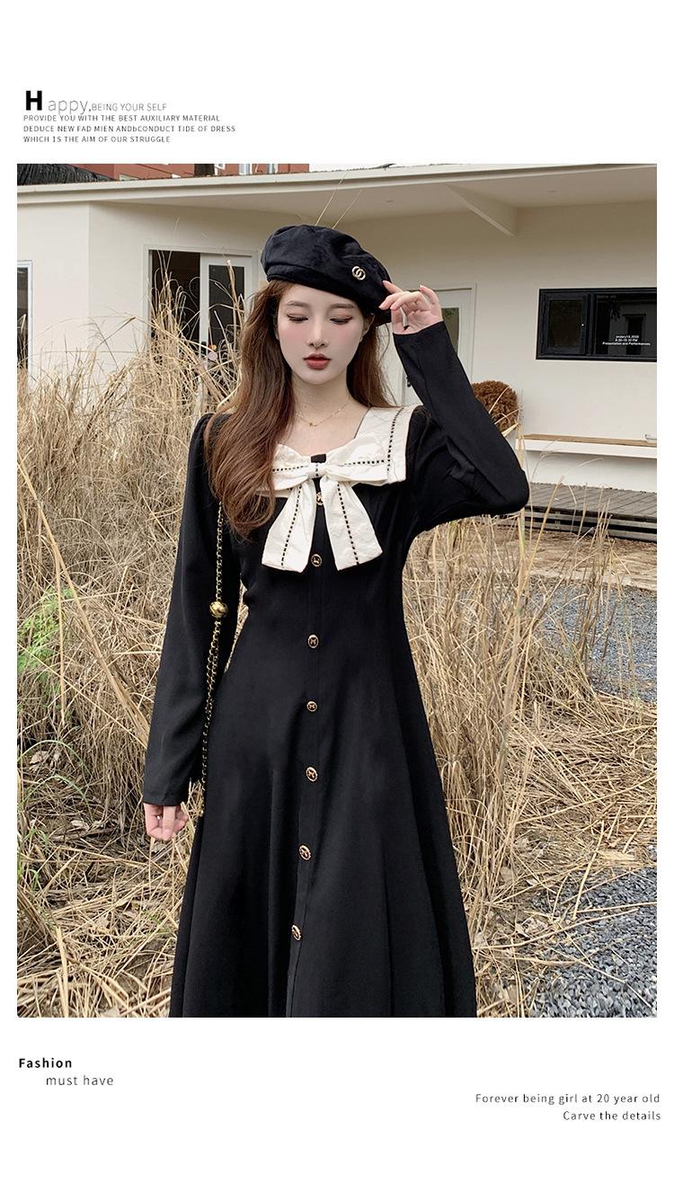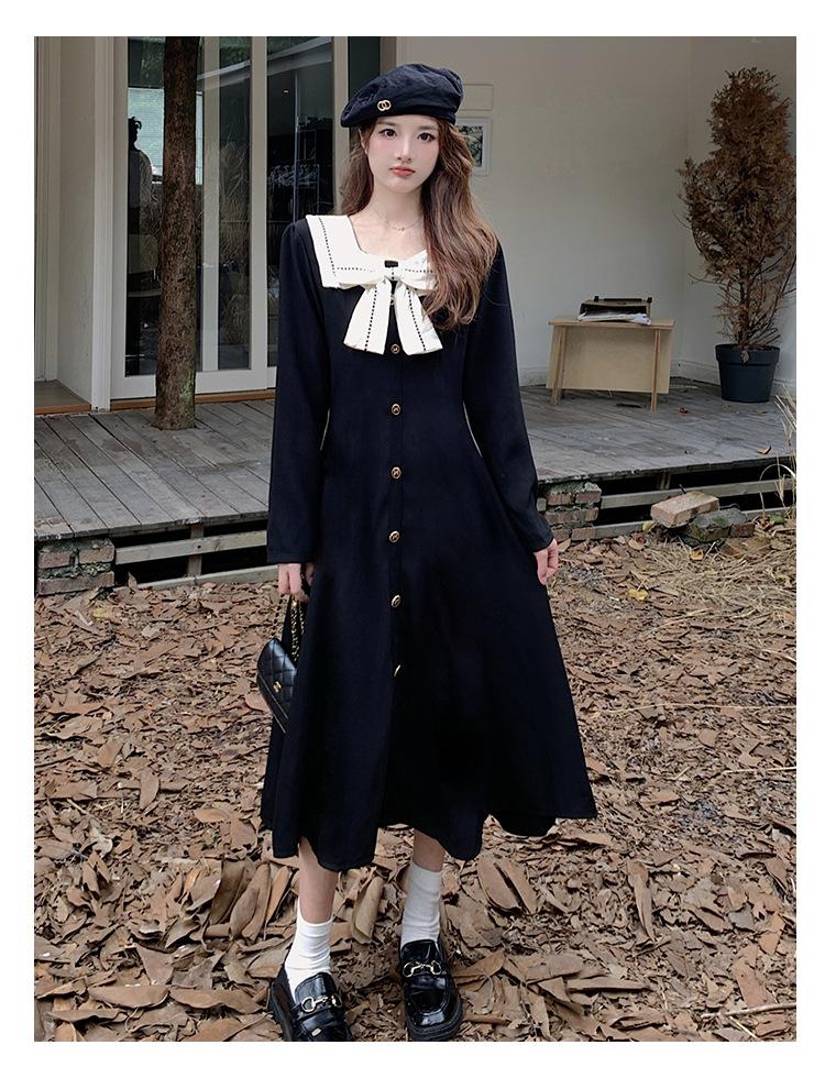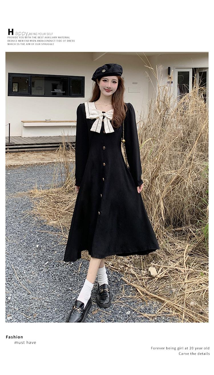 Primavera y Otoño chica gordita Forma de Pera Cintura Alta Estilo Francés Lazo Manga Larga Súper Delgada Vestido Alto Falda Larga Moda Estilo Coreano para Mujer