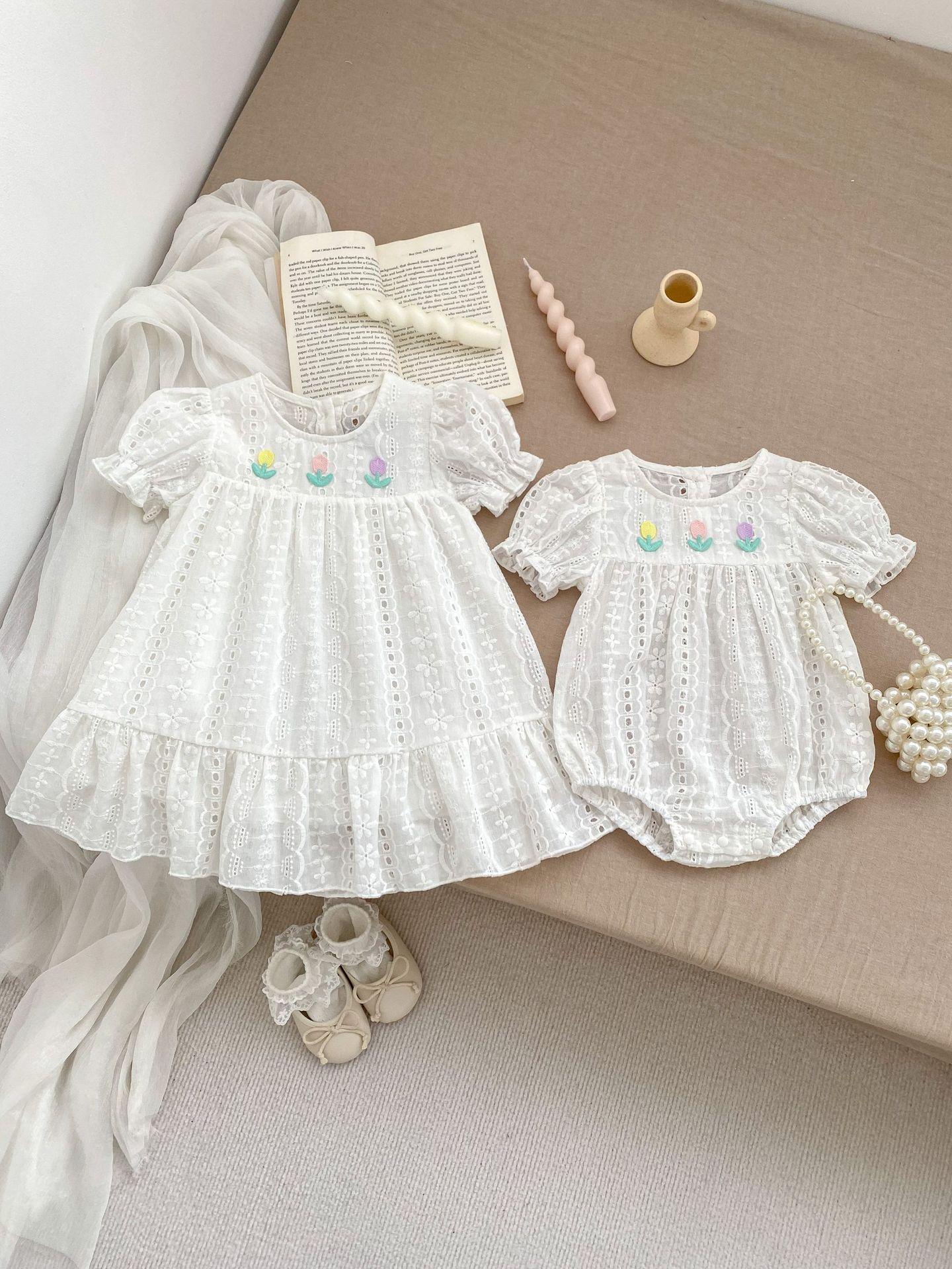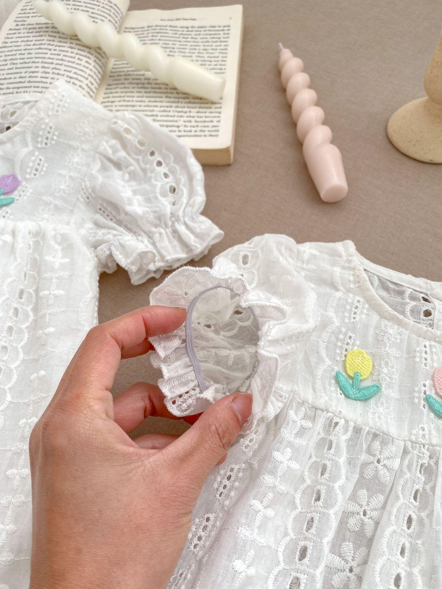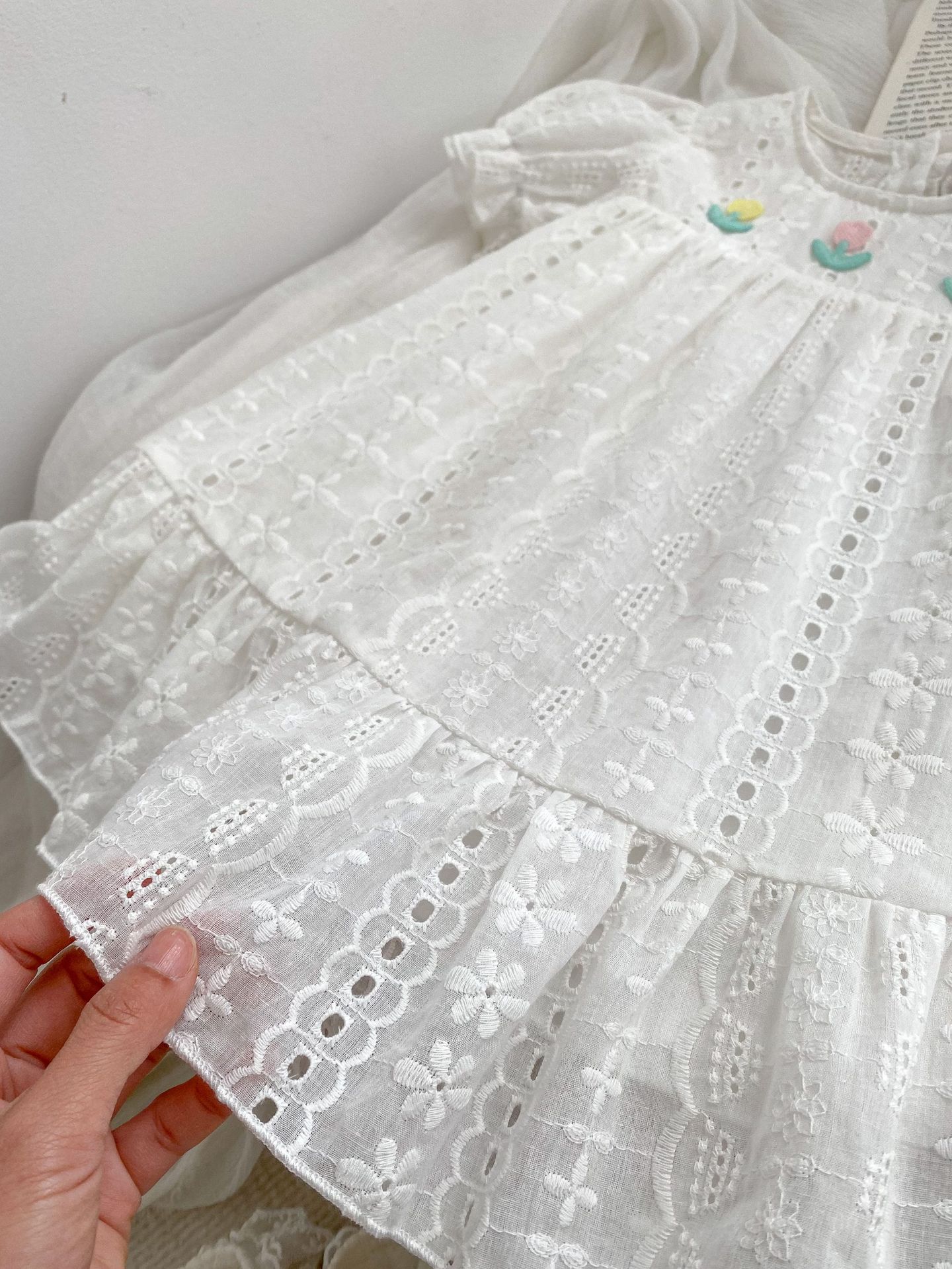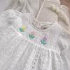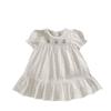 2025 Verano Niñas Manga Corta Encaje Falda de Princesa Dulce Bordado de Flores Volantes Vestido Infantil