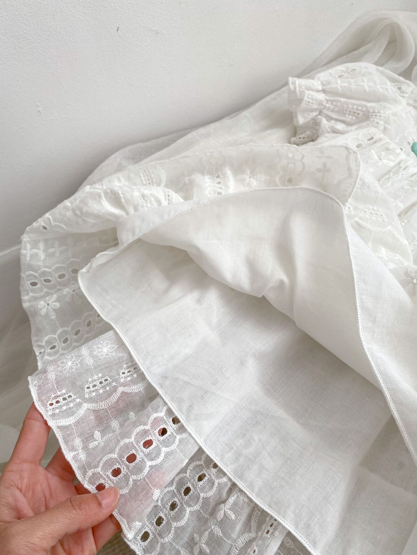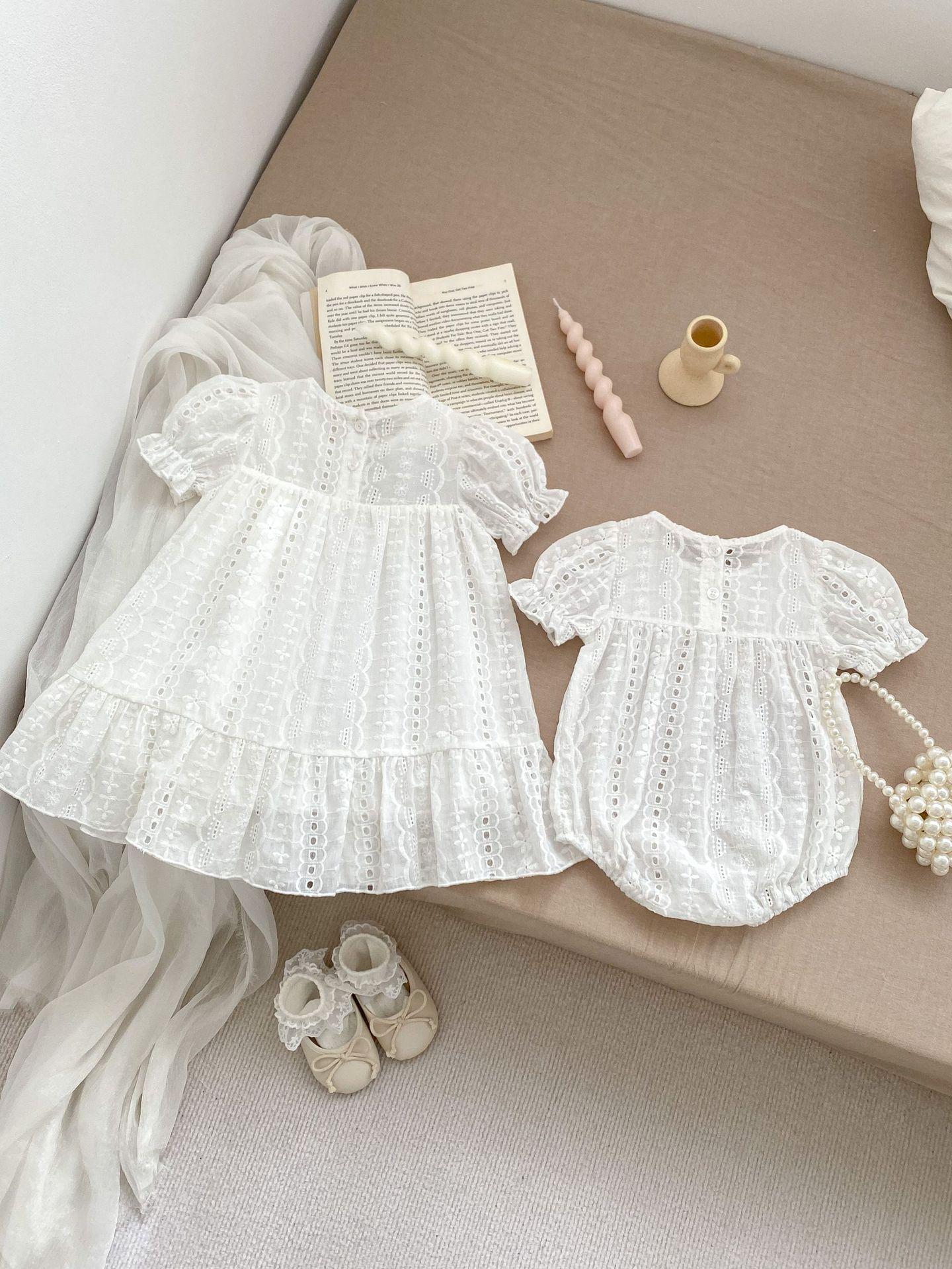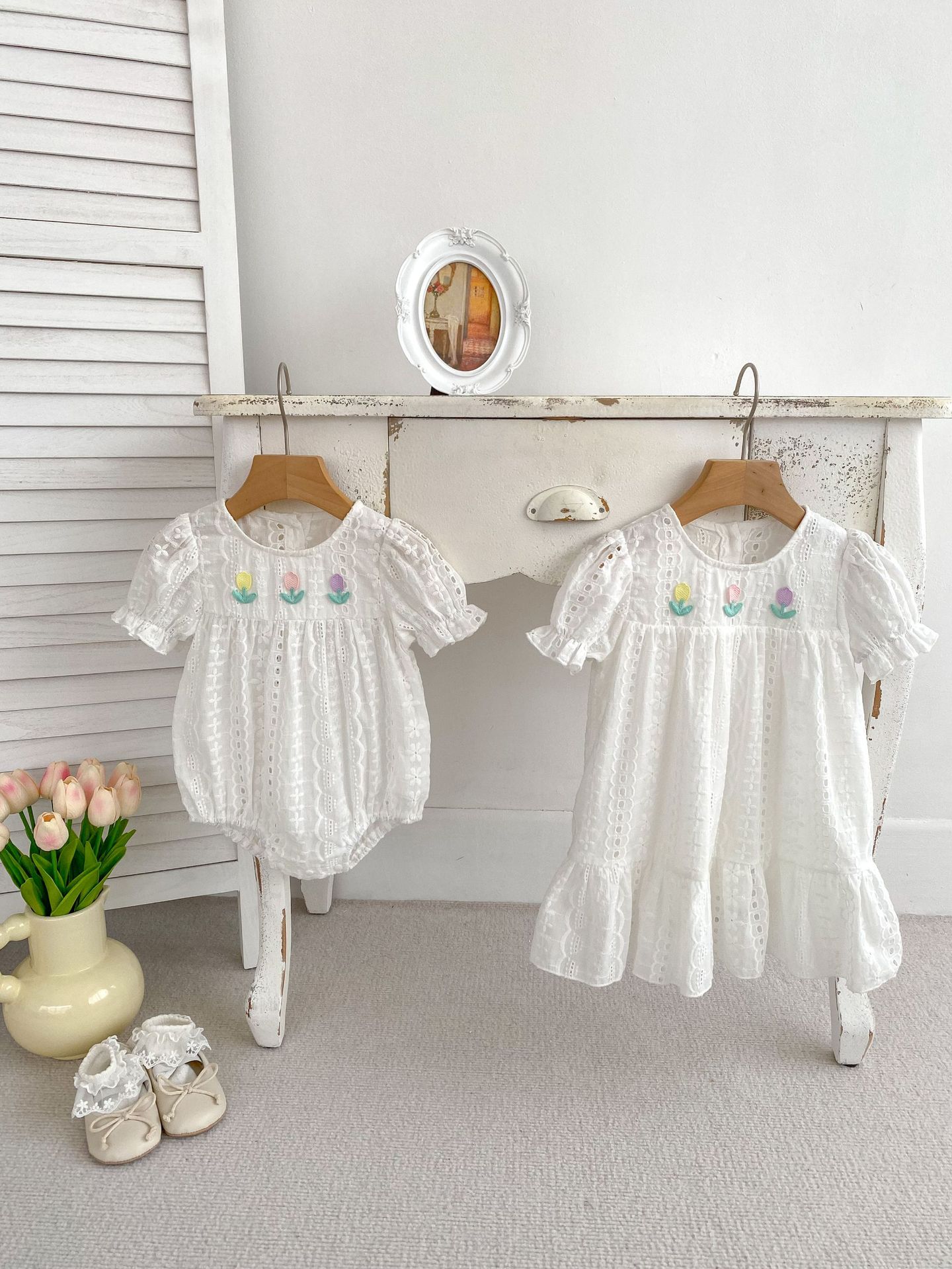 2025 Verano Niñas Manga Corta Encaje Falda de Princesa Dulce Bordado de Flores Volantes Vestido Infantil