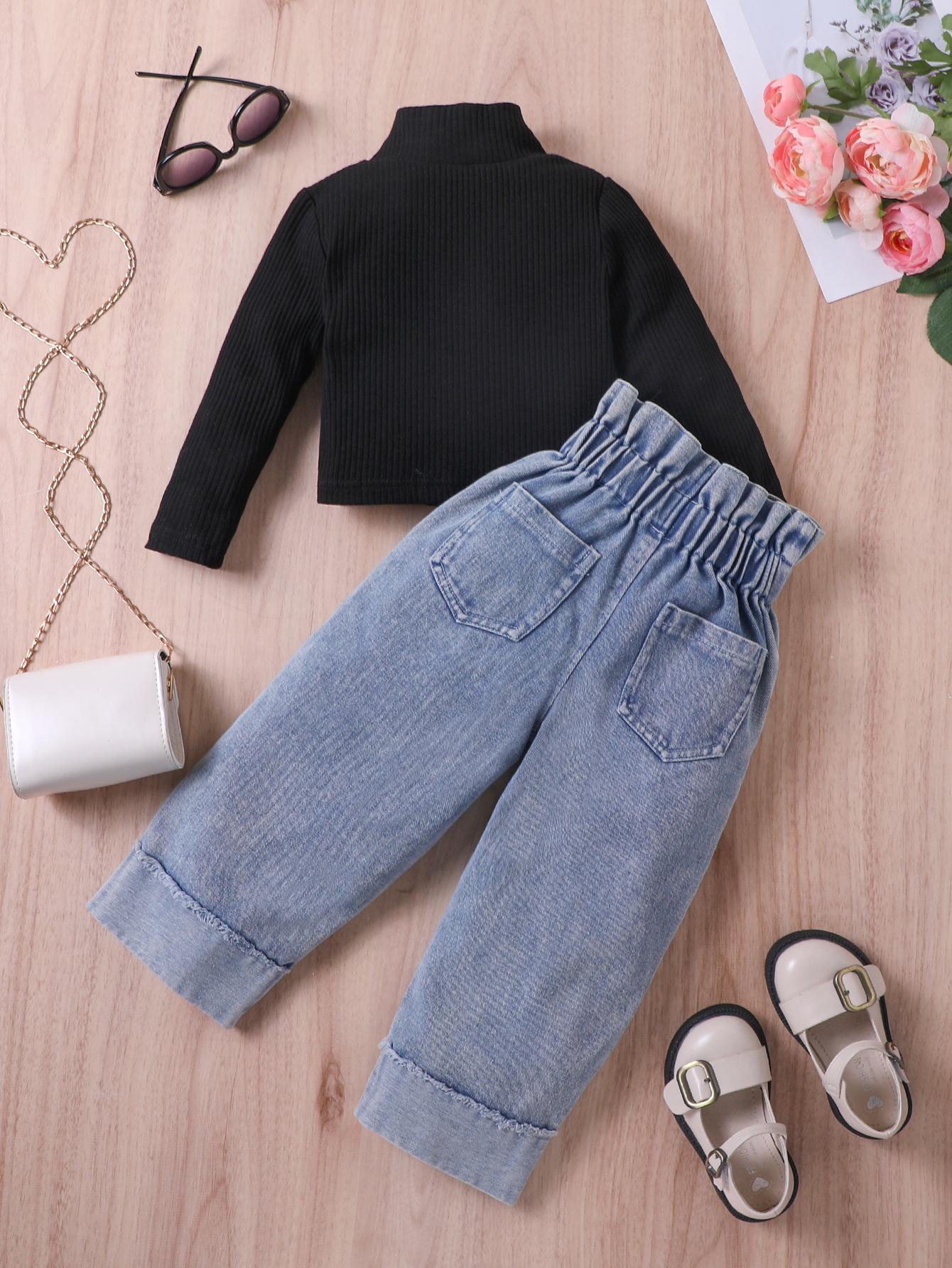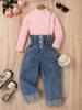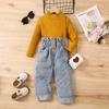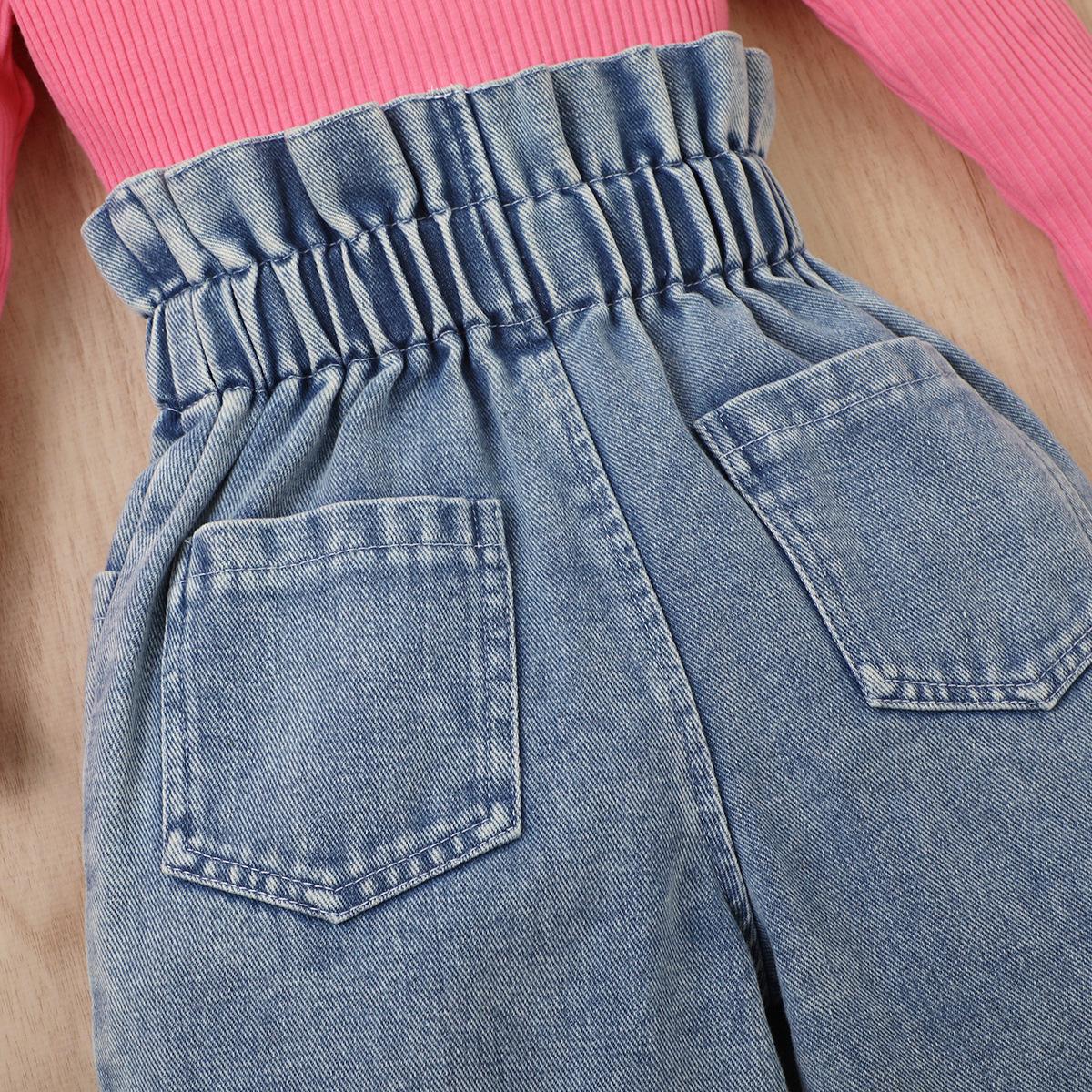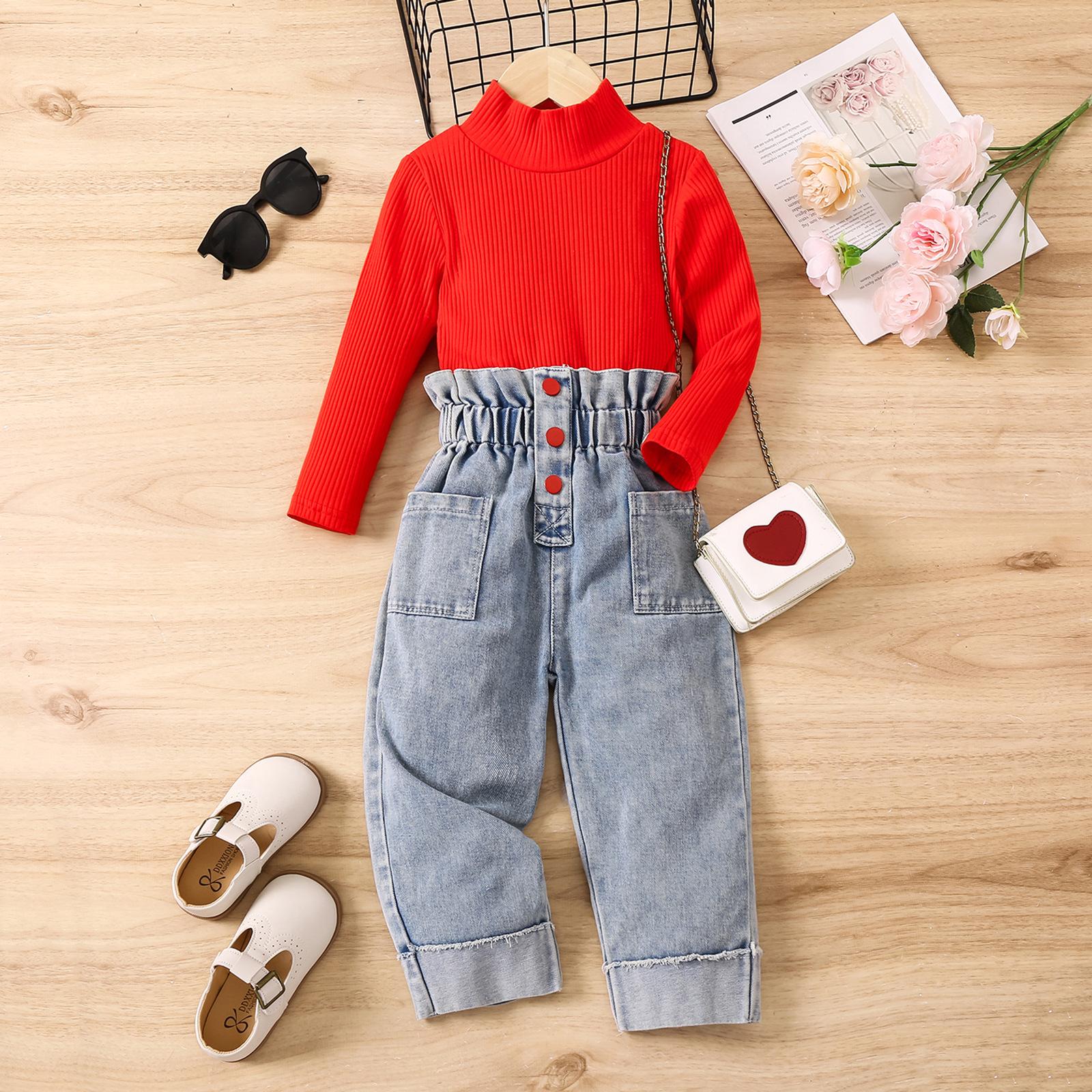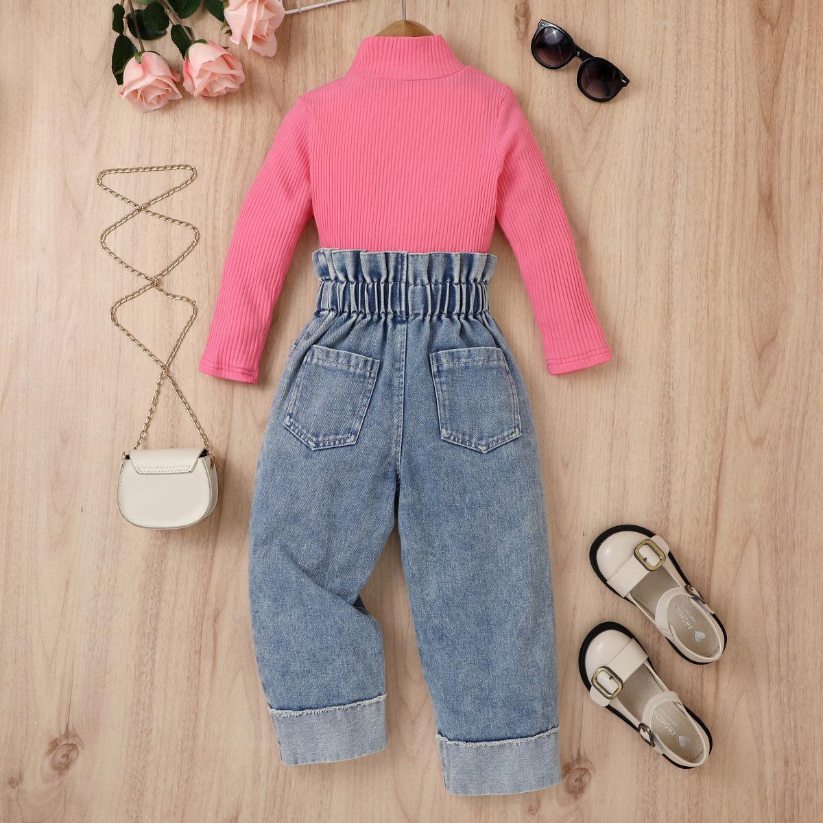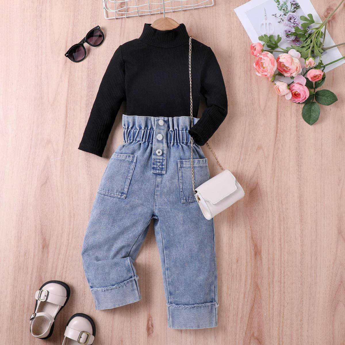 Ropa Infantil Transfronteriza Europea y Americana para Niñas Otoño e Invierno Color Sólido Manga Larga Cuello Alto Jersey Pantalones de Mezclilla con Volantes Conjunto de Dos Piezas
