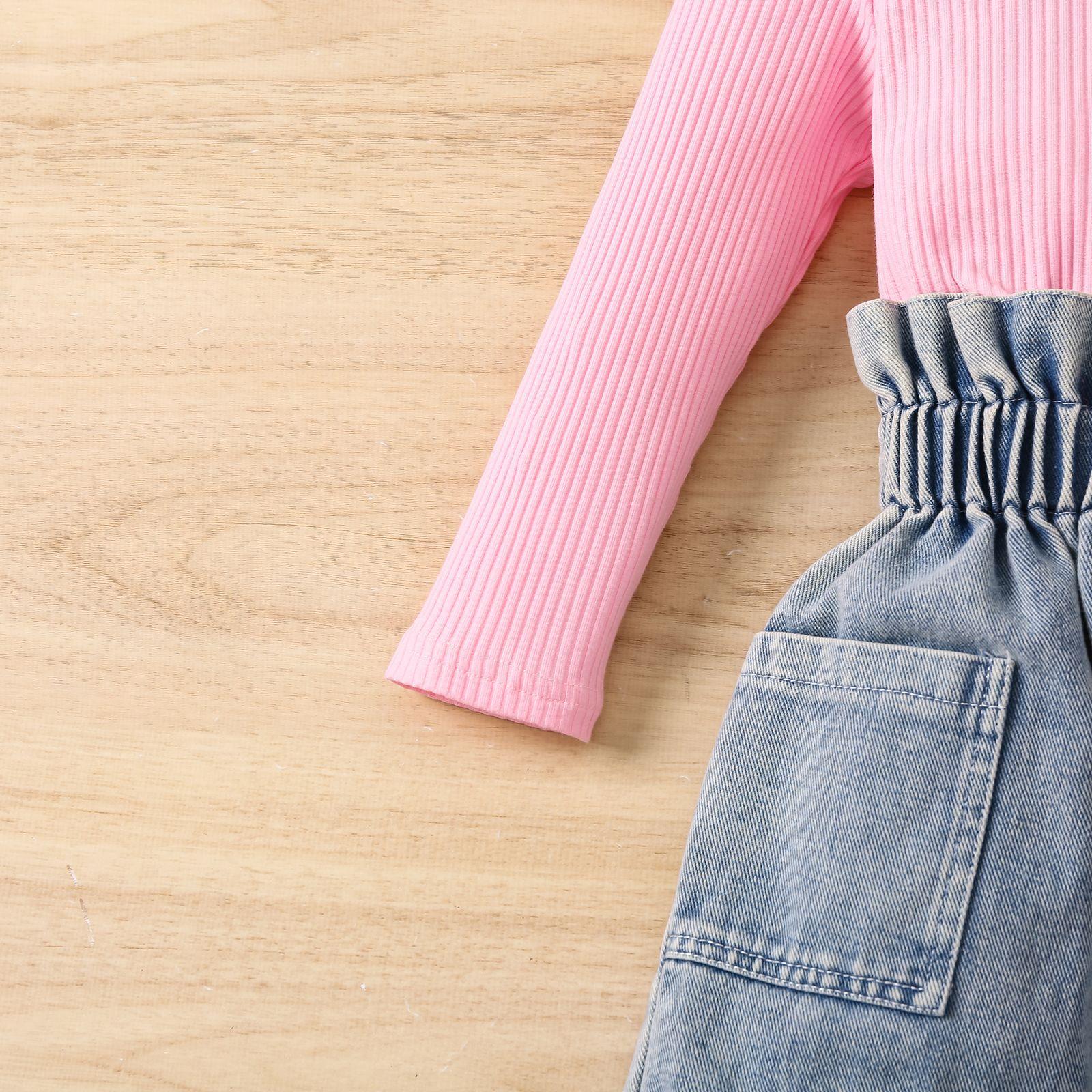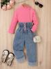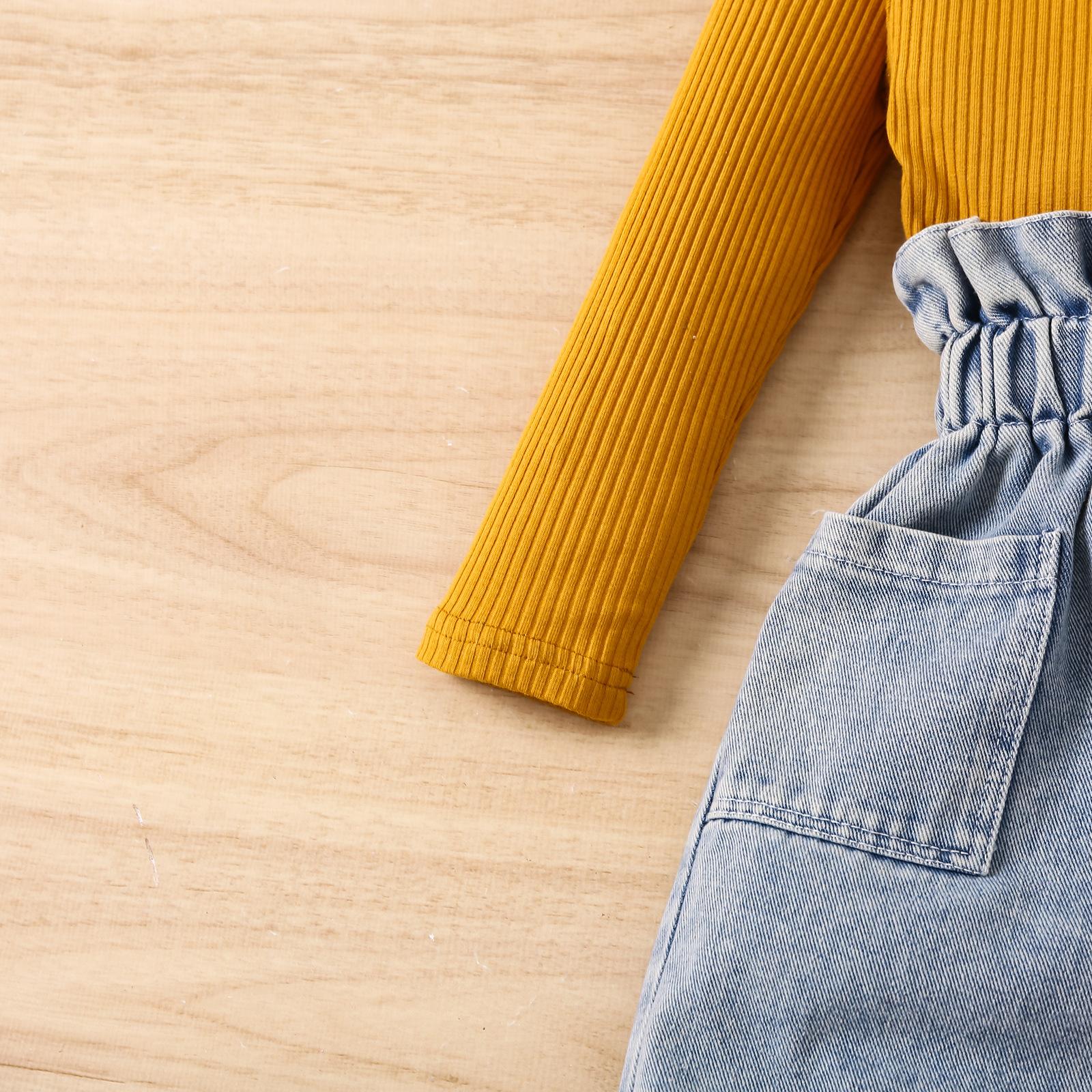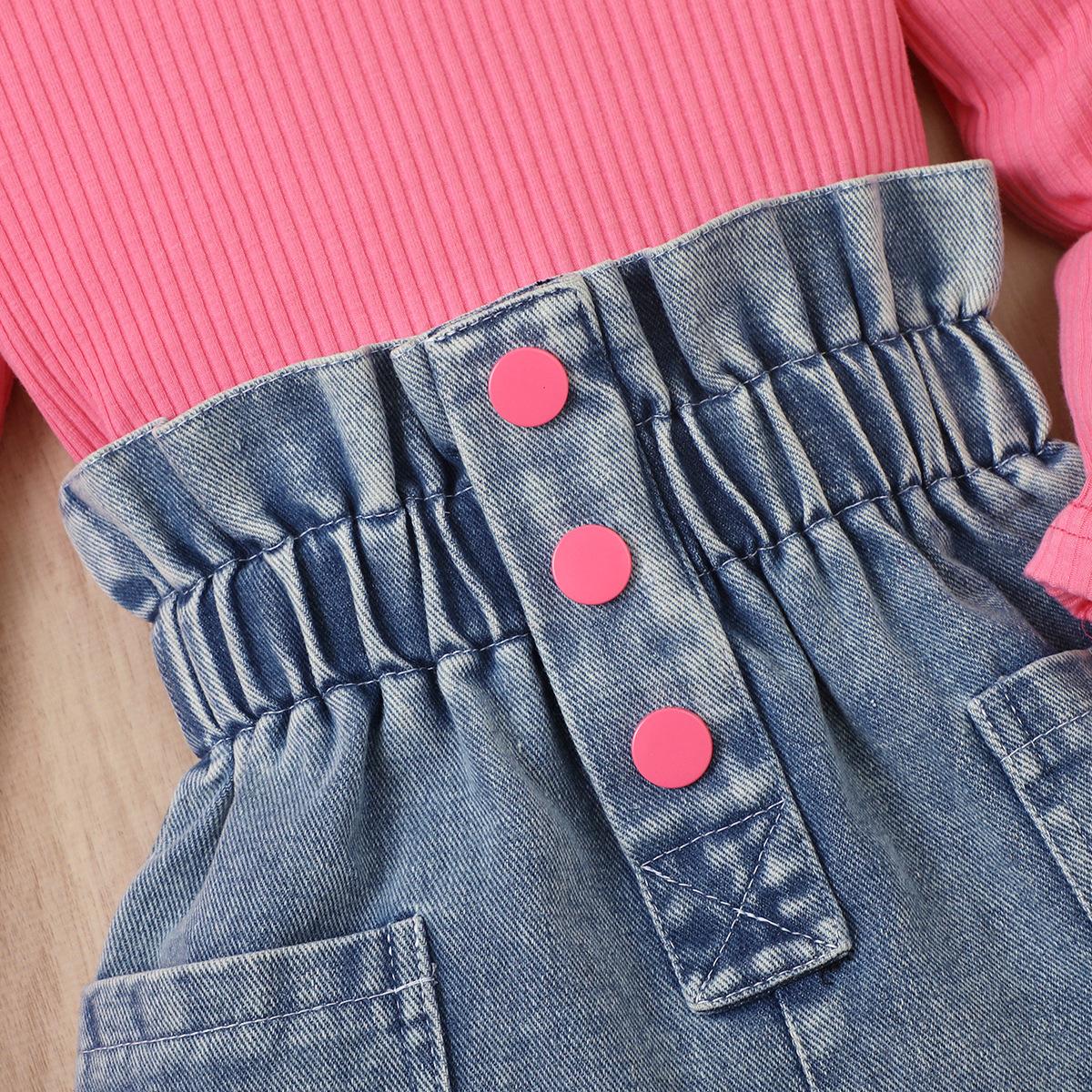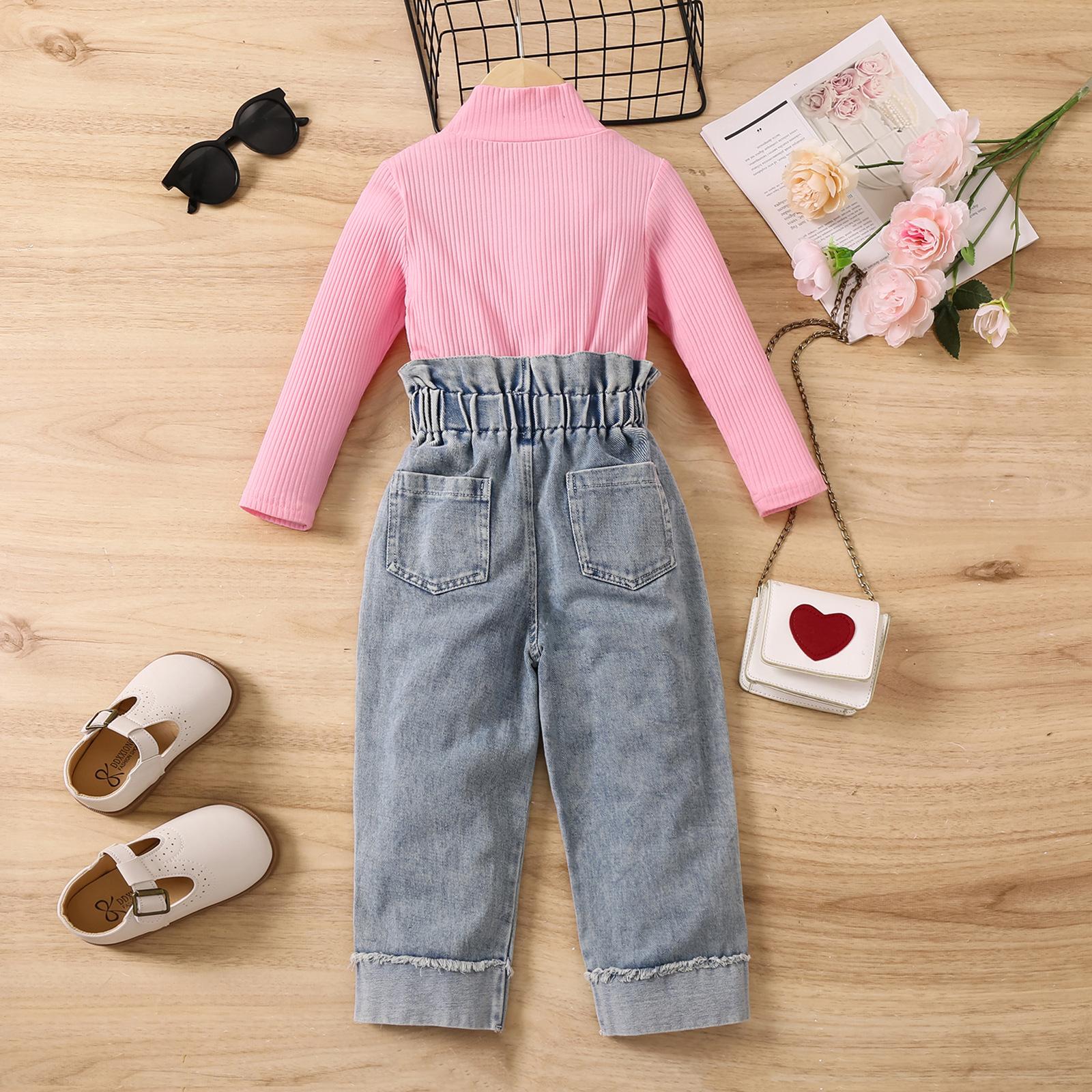 Ropa Infantil Transfronteriza Europea y Americana para Niñas Otoño e Invierno Color Sólido Manga Larga Cuello Alto Jersey Pantalones de Mezclilla con Volantes Conjunto de Dos Piezas