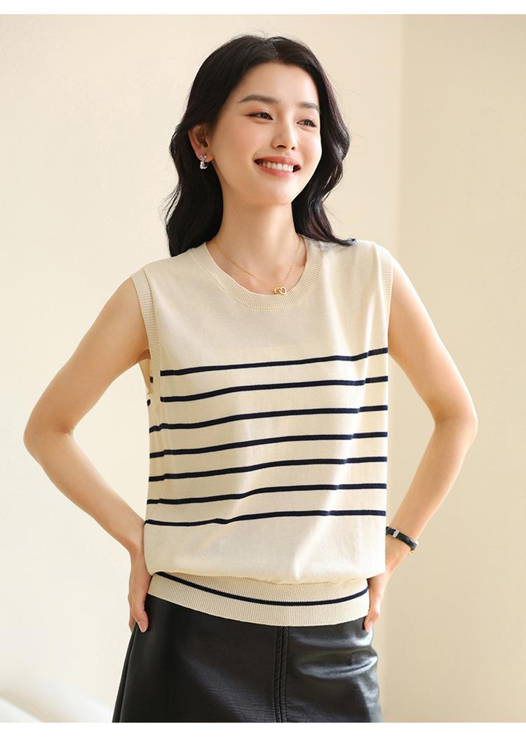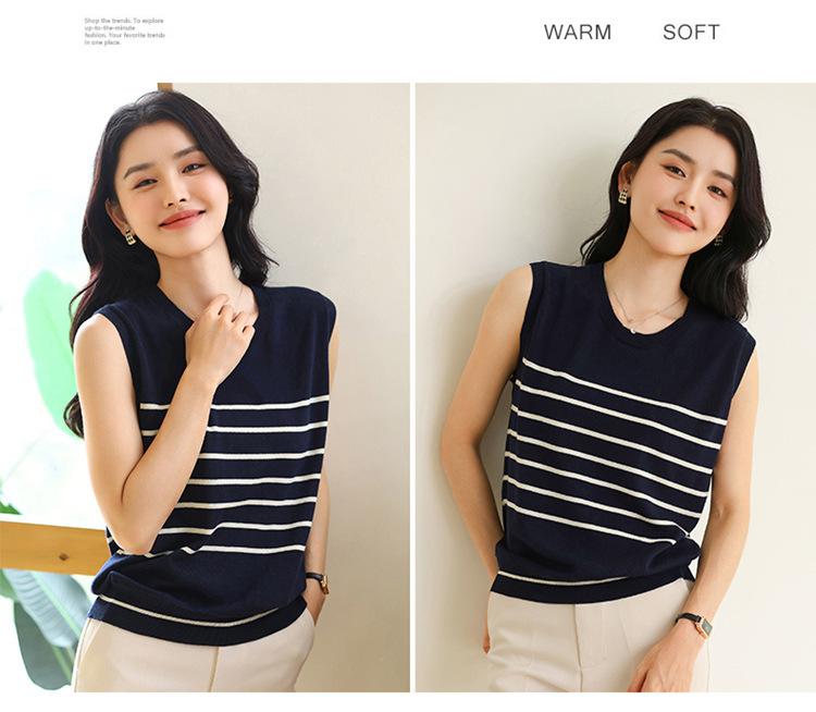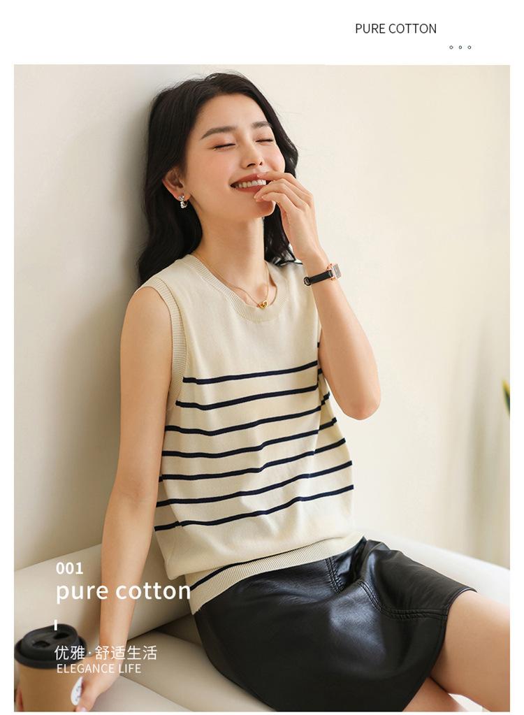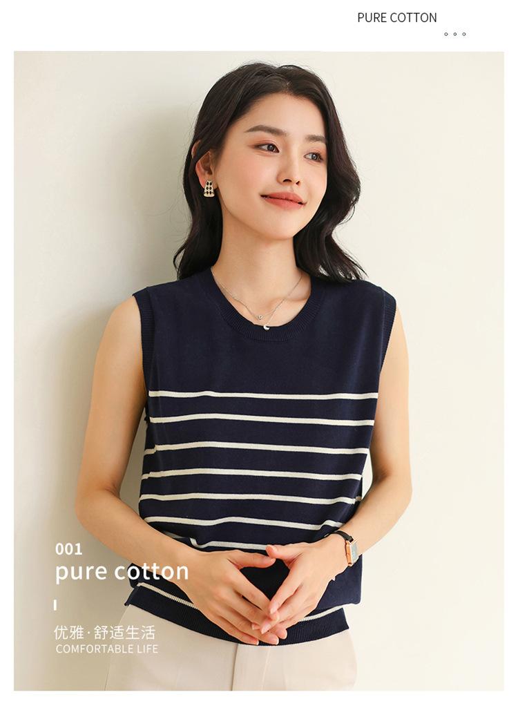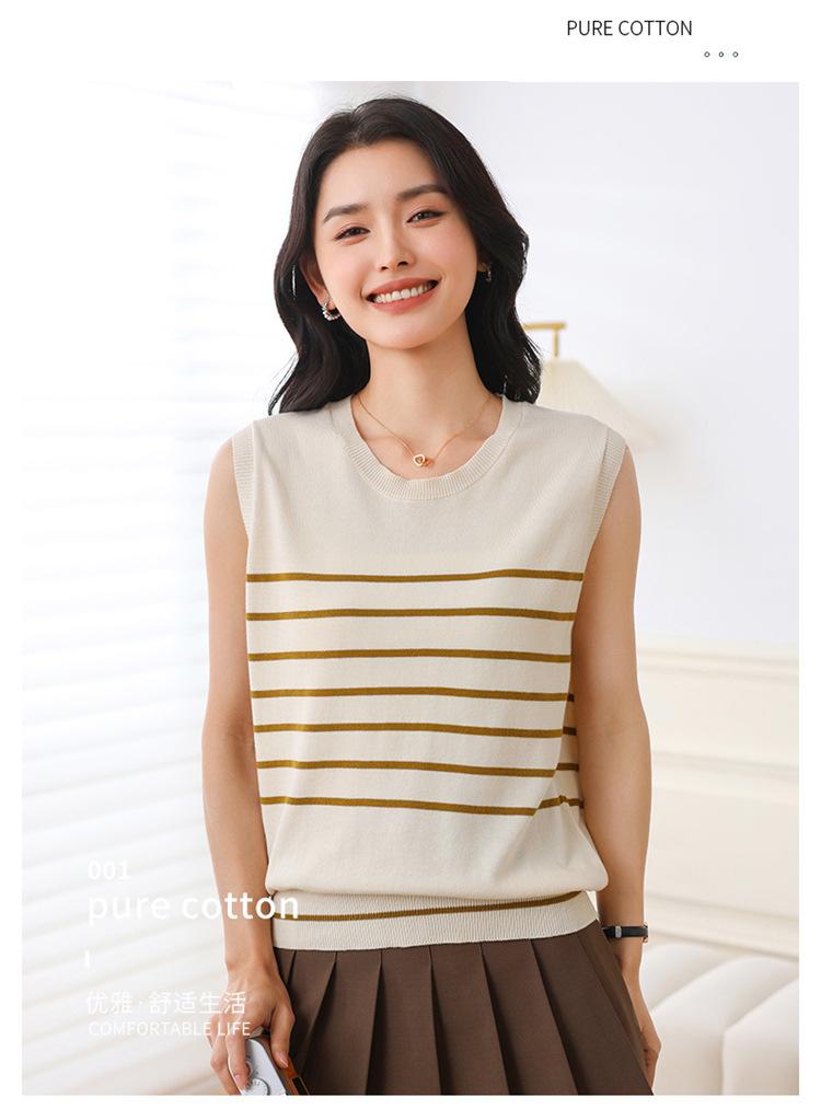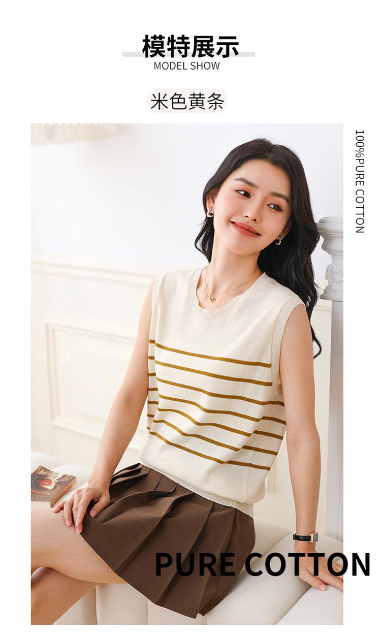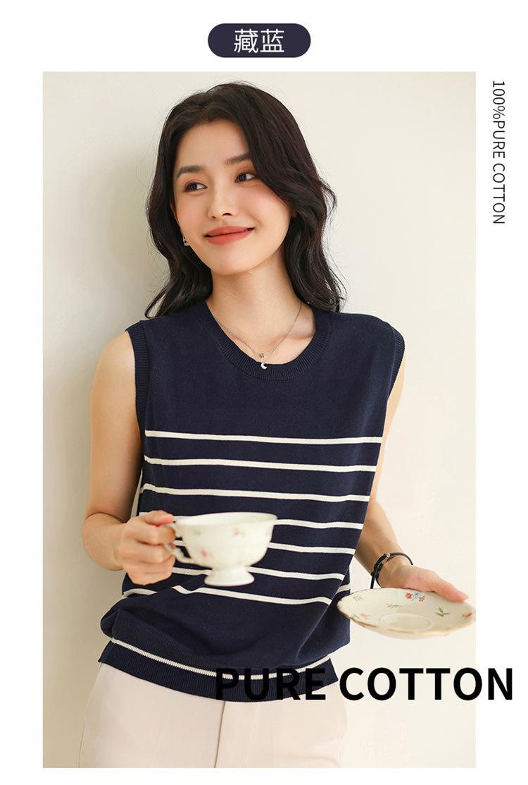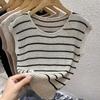 Suéter de algodón fino a rayas con cuello redondo suelto de verano 2024, chaleco sin mangas para damas de una generación de cabello
