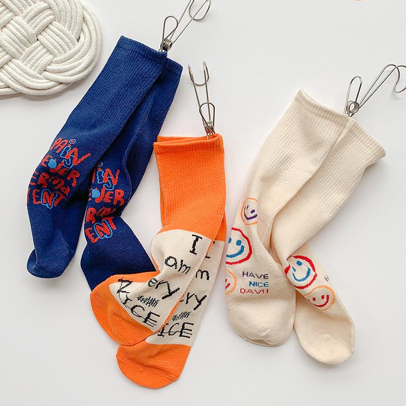 Calcetines de algodón para niños coreanos calcetines modernos sin talón calcetines largos rectos para niños y niñas calcetines de pantorrilla con letras sonrientes venta al por mayor