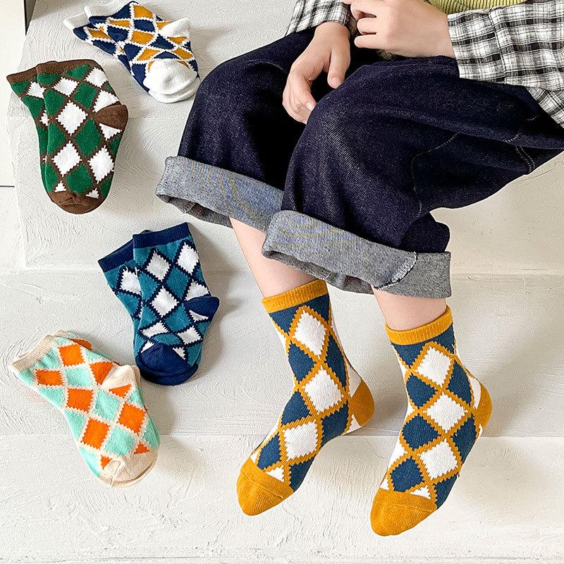Calcetines nuevos de otoño e invierno para niños de Miss Sun calcetines retro de media caña calcetines para niños con forma de diamante calcetines coreanos de tablero de ajedrez para niño