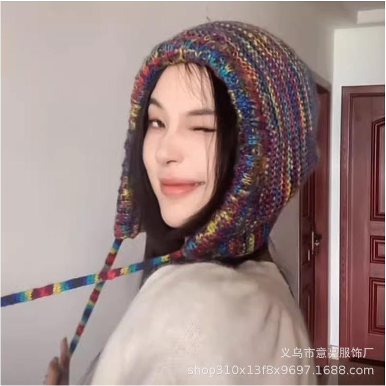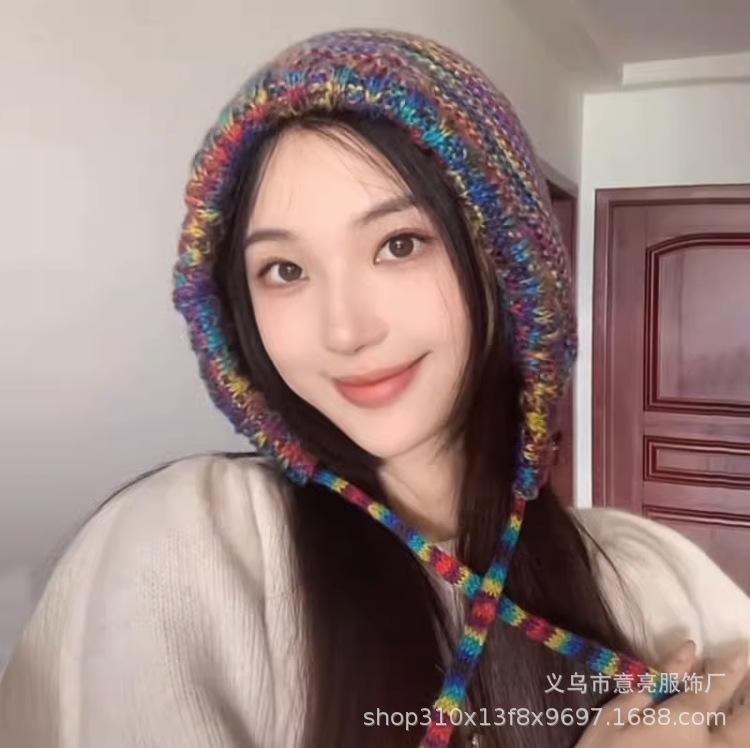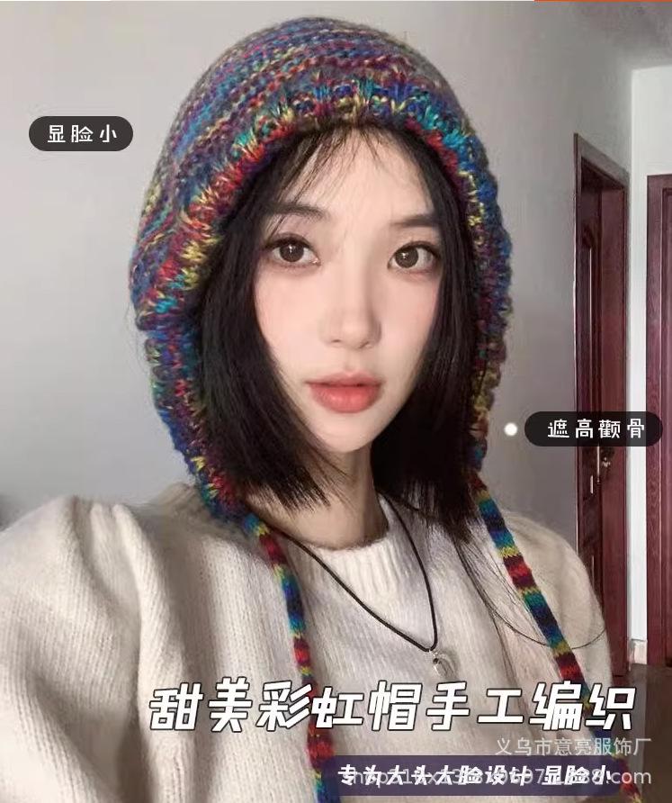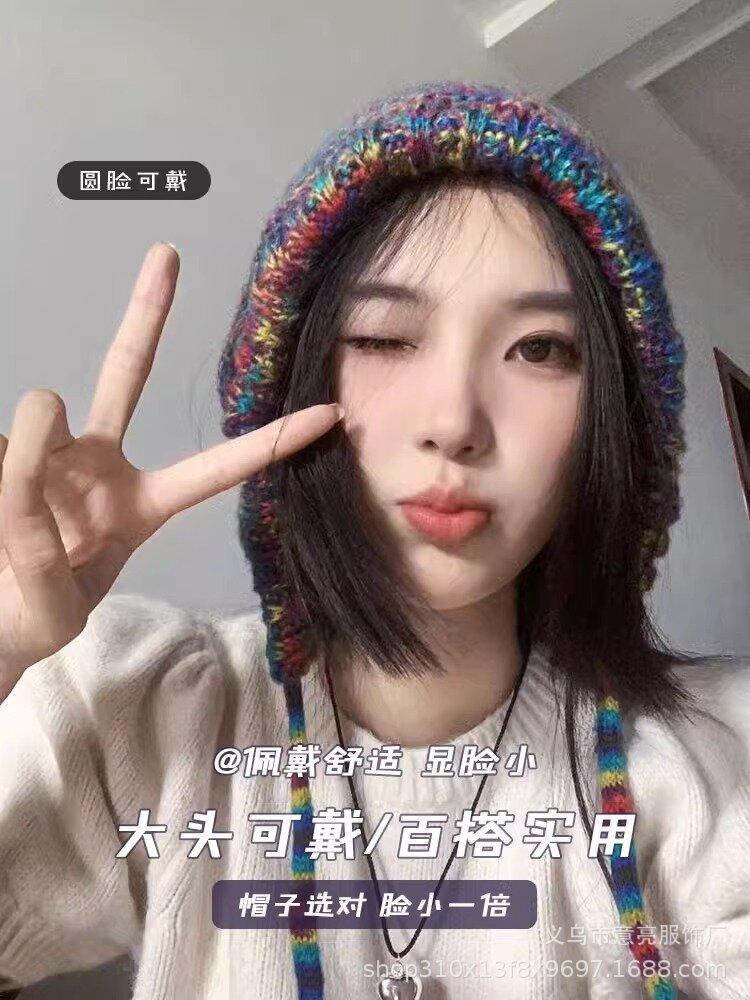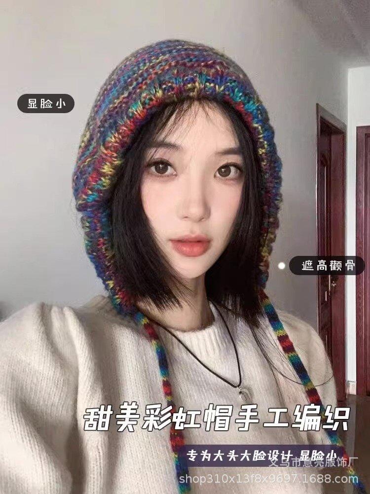Gorro de lana con protección para las orejas, con rayas de arcoíris retro de otoño e invierno, para mujer, con aspecto de rostro, con cordones pequeños, en color de contraste, con punta cerrada, de punto