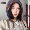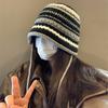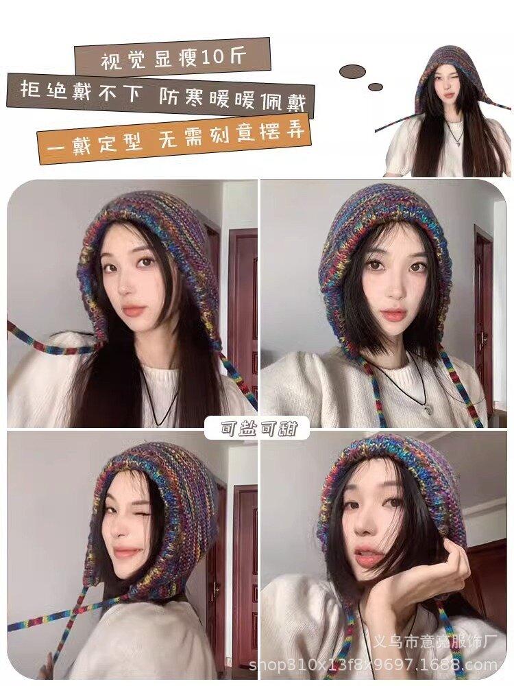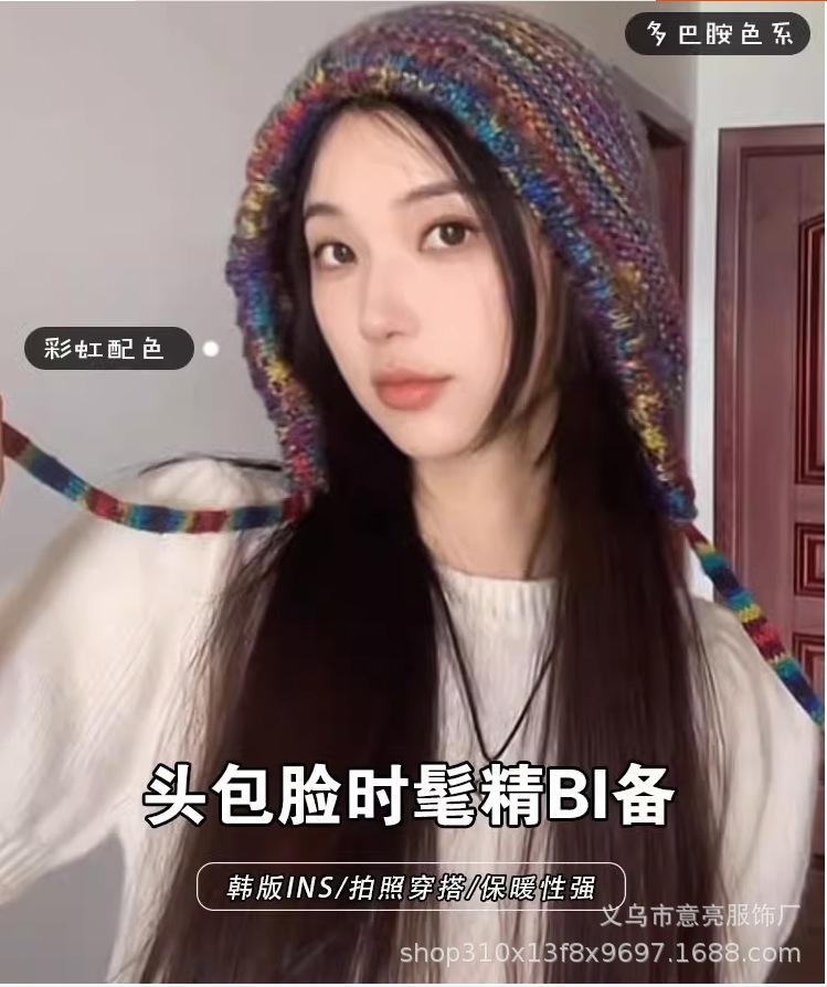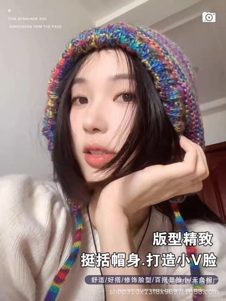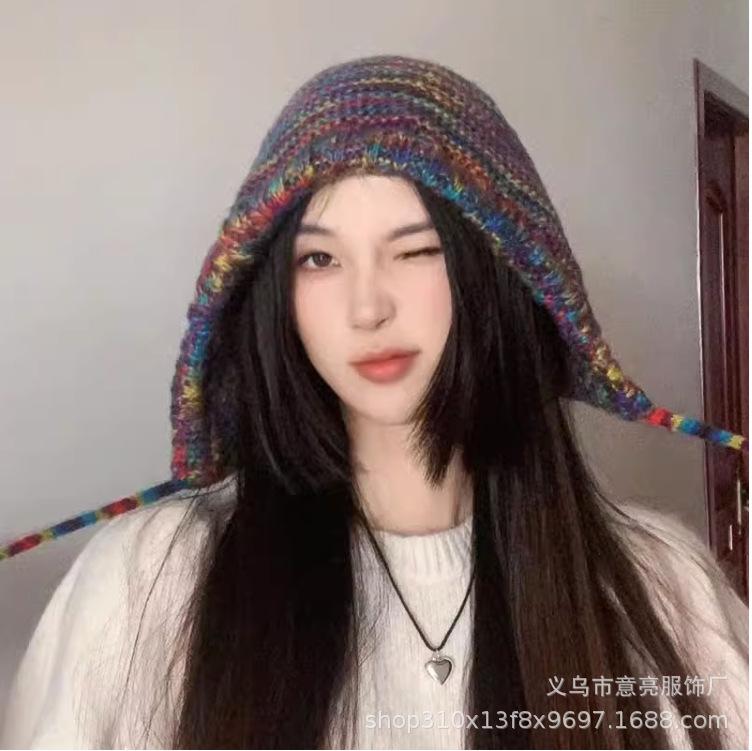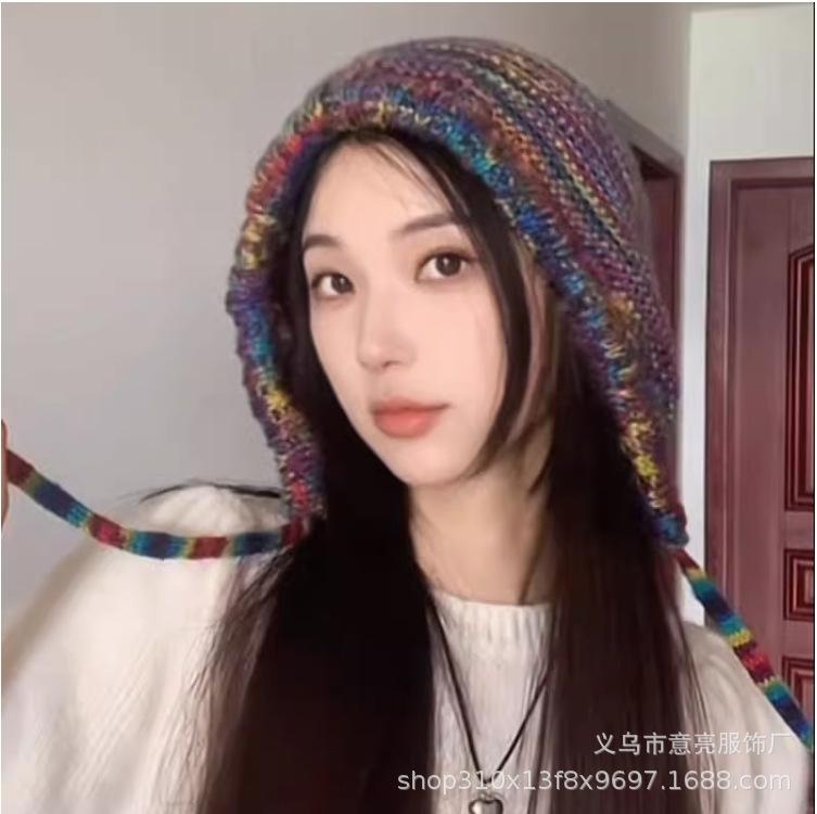Gorro de lana con protección para las orejas, con rayas de arcoíris retro de otoño e invierno, para mujer, con aspecto de rostro, con cordones pequeños, en color de contraste, con punta cerrada, de punto