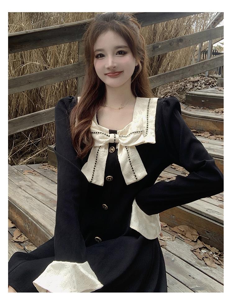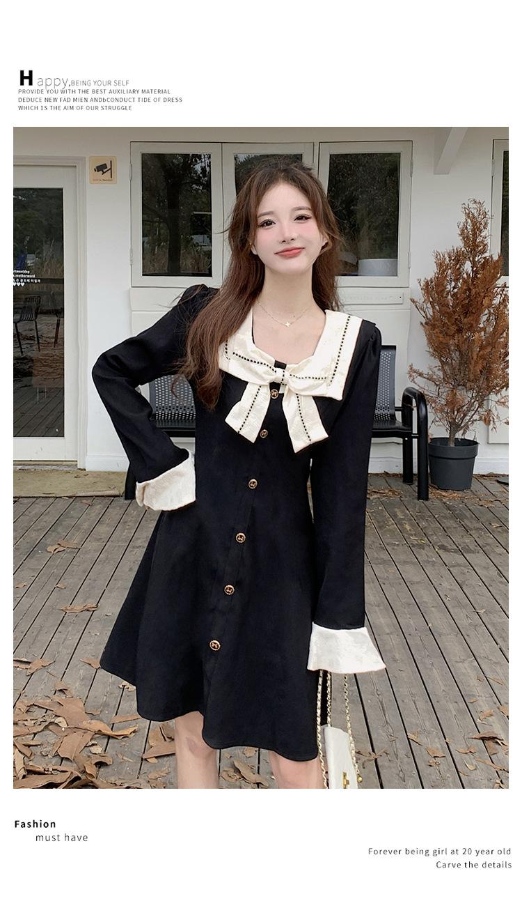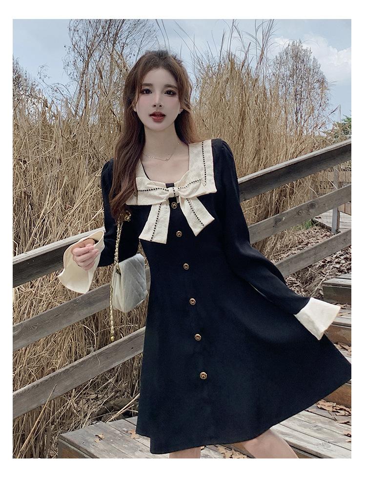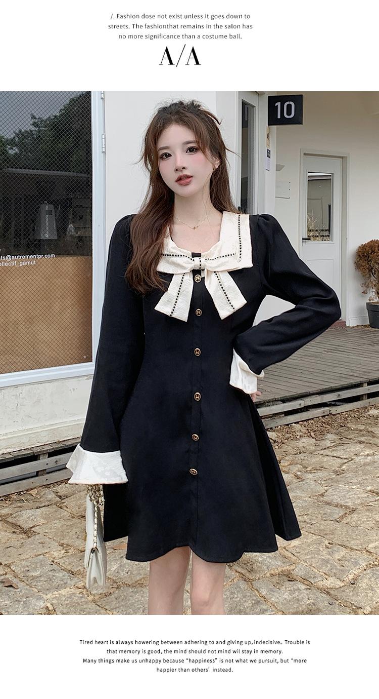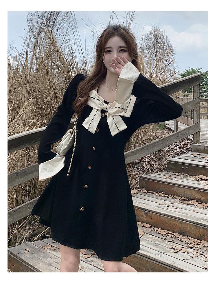 Primavera y Otoño chica gordita Forma de Pera Cintura Alta Estilo Francés Lazo Manga Larga Súper Delgada Vestido Alto Falda Larga Moda Estilo Coreano para Mujer