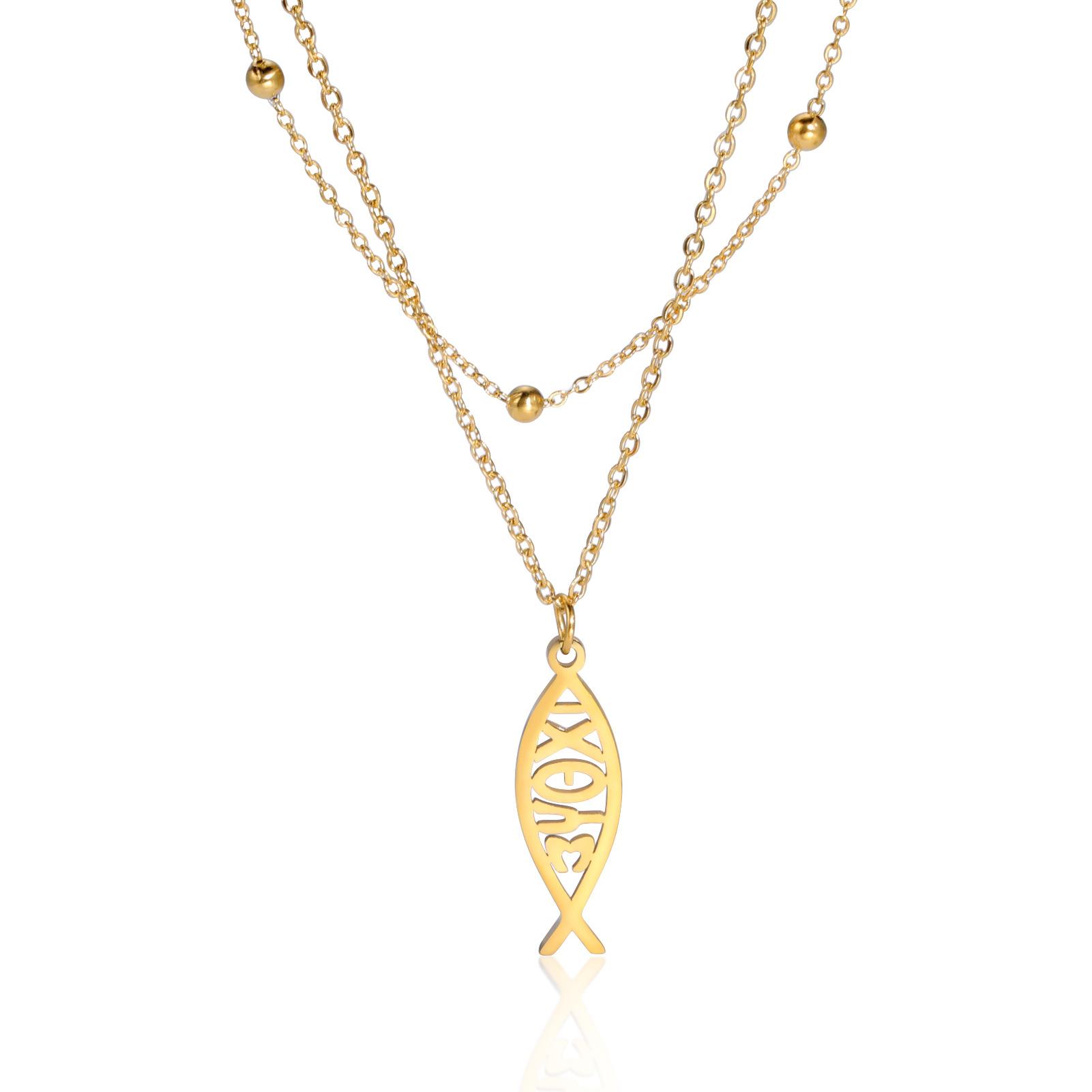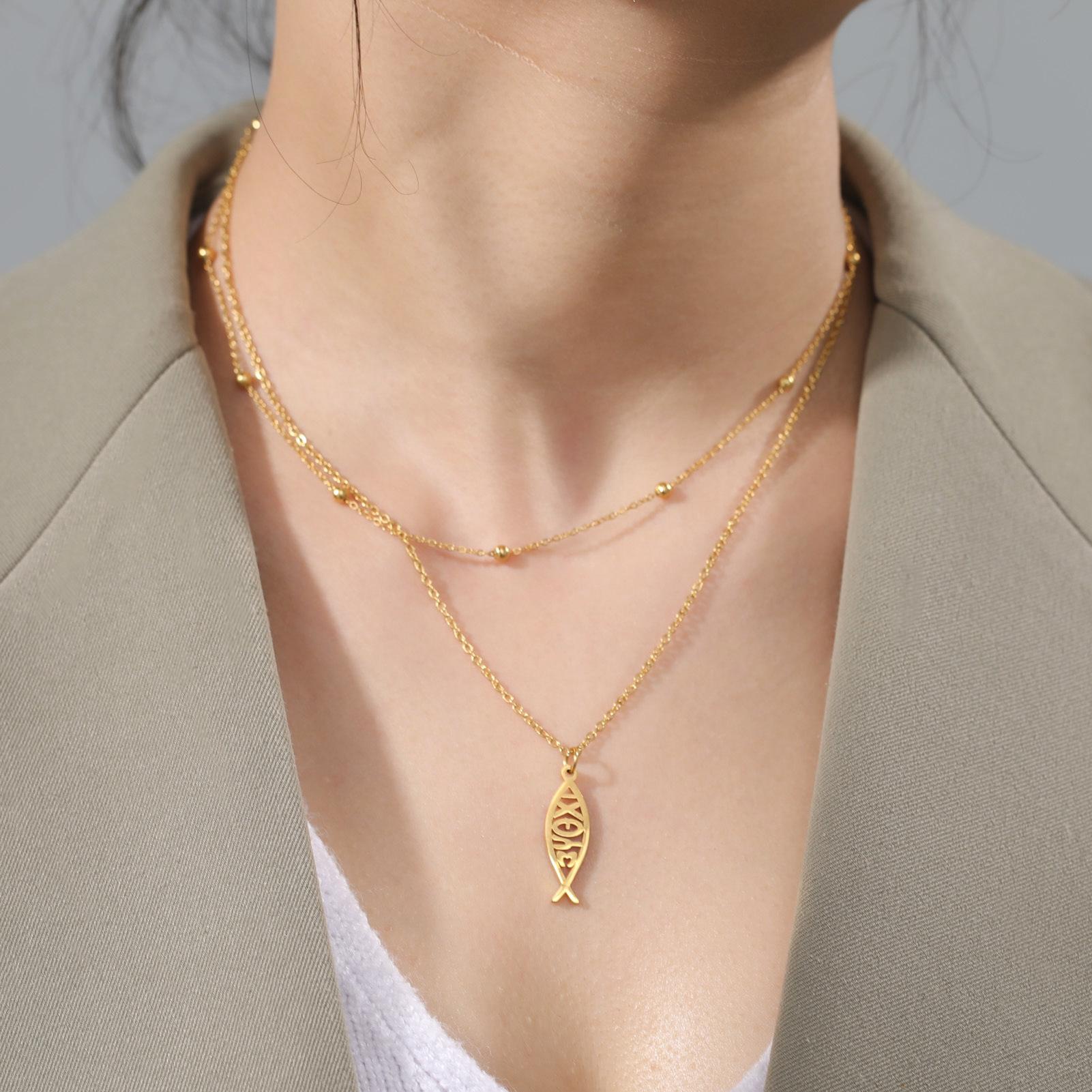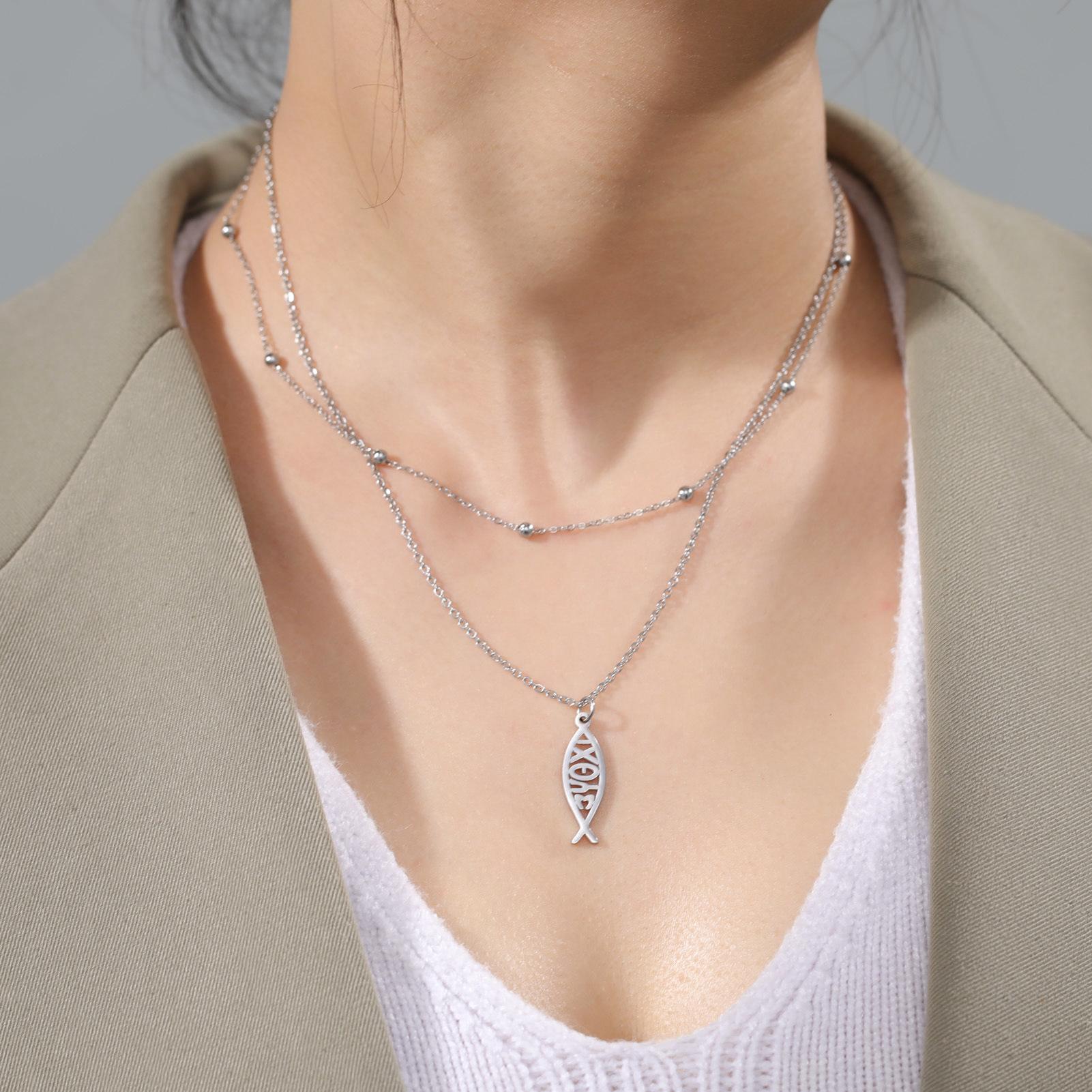 Cadena de clavícula de marca de moda que combina con todo, colgante de pez hueco de alta gama con letras inglesas, cadena para el cuello, collar de acero de titanio de doble capa