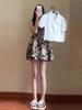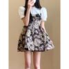 Conjunto de dos piezas de camisa de manga corta abullonada retro francesa de verano + vestido sling jacquard de gato