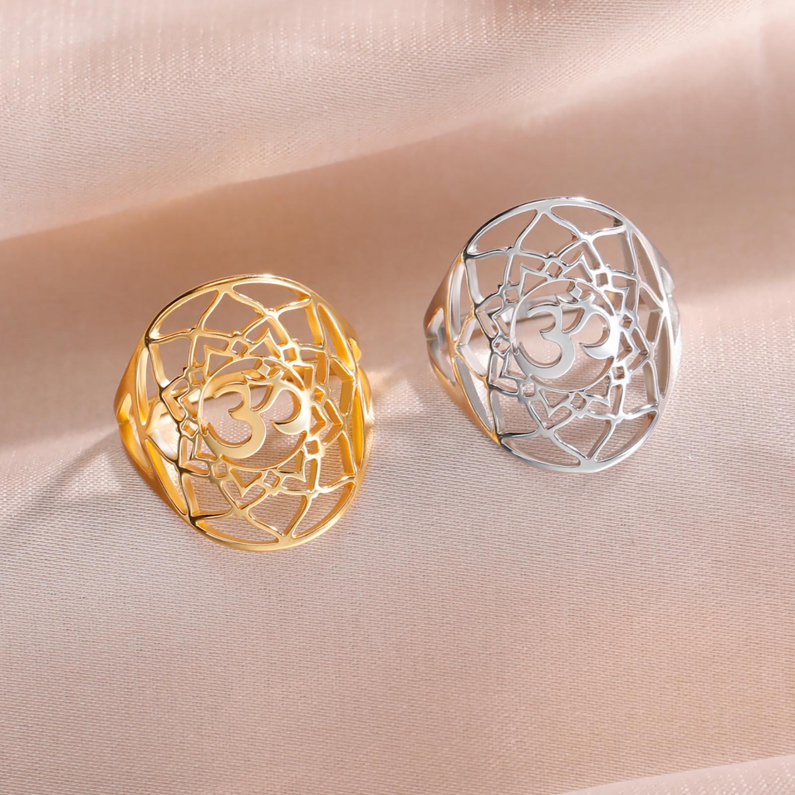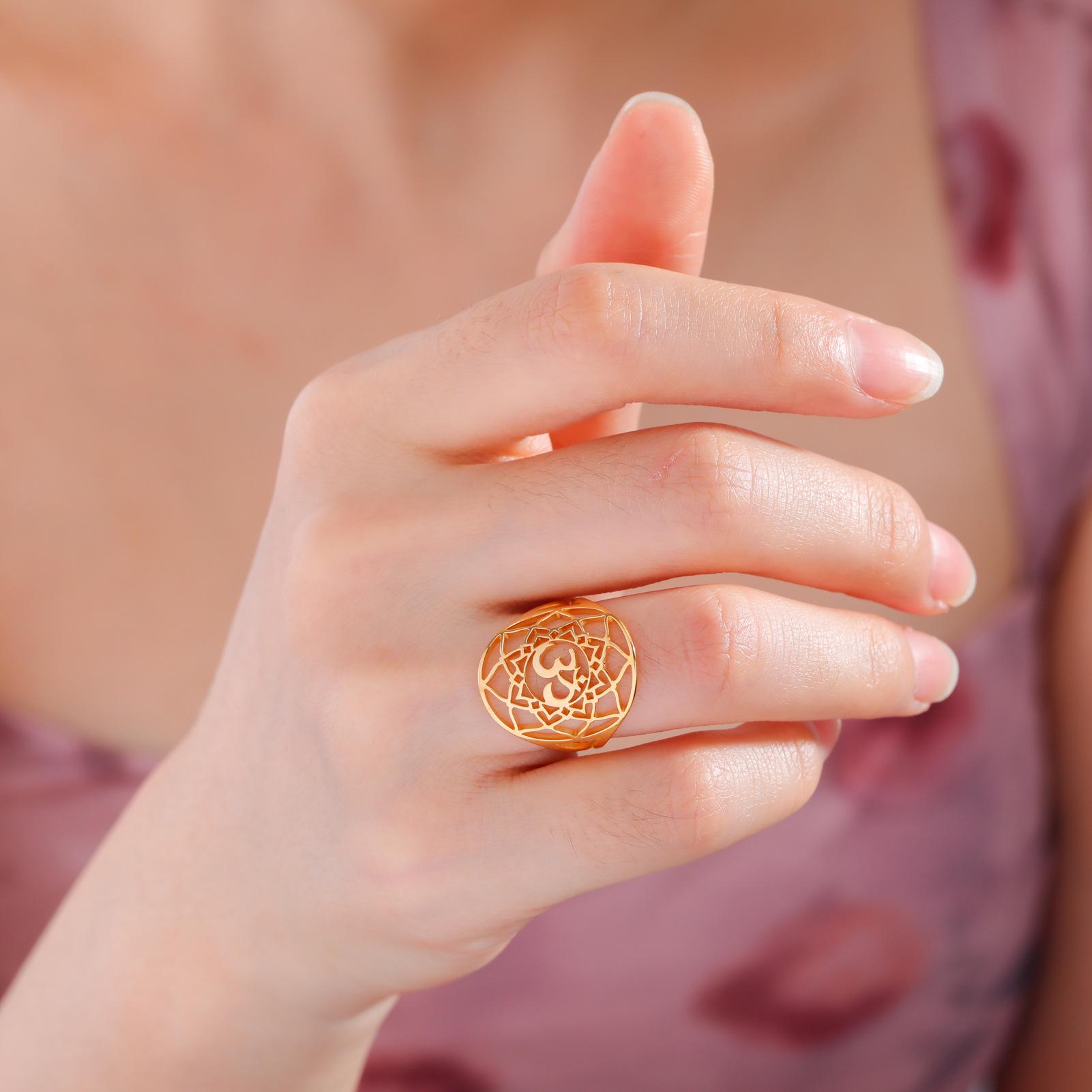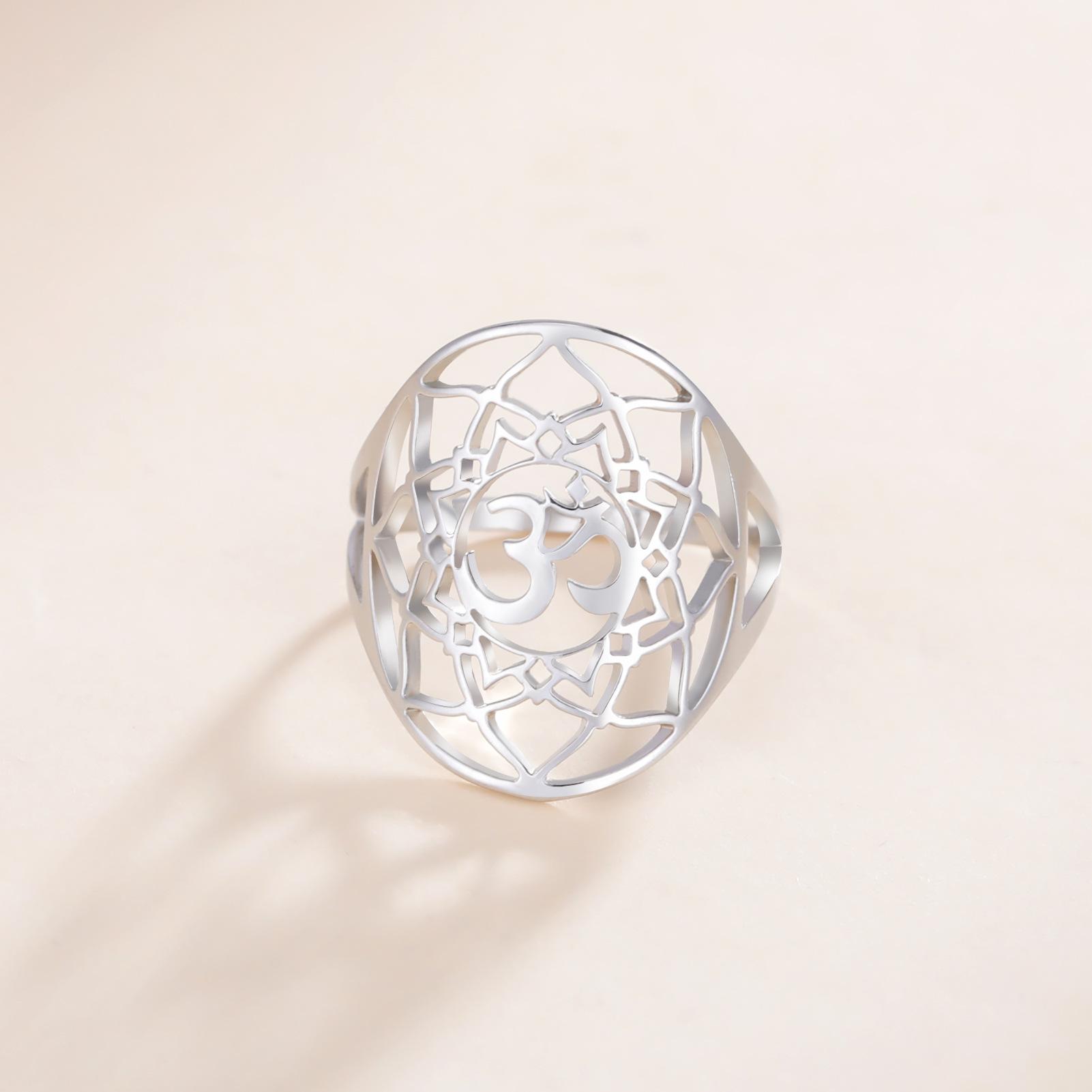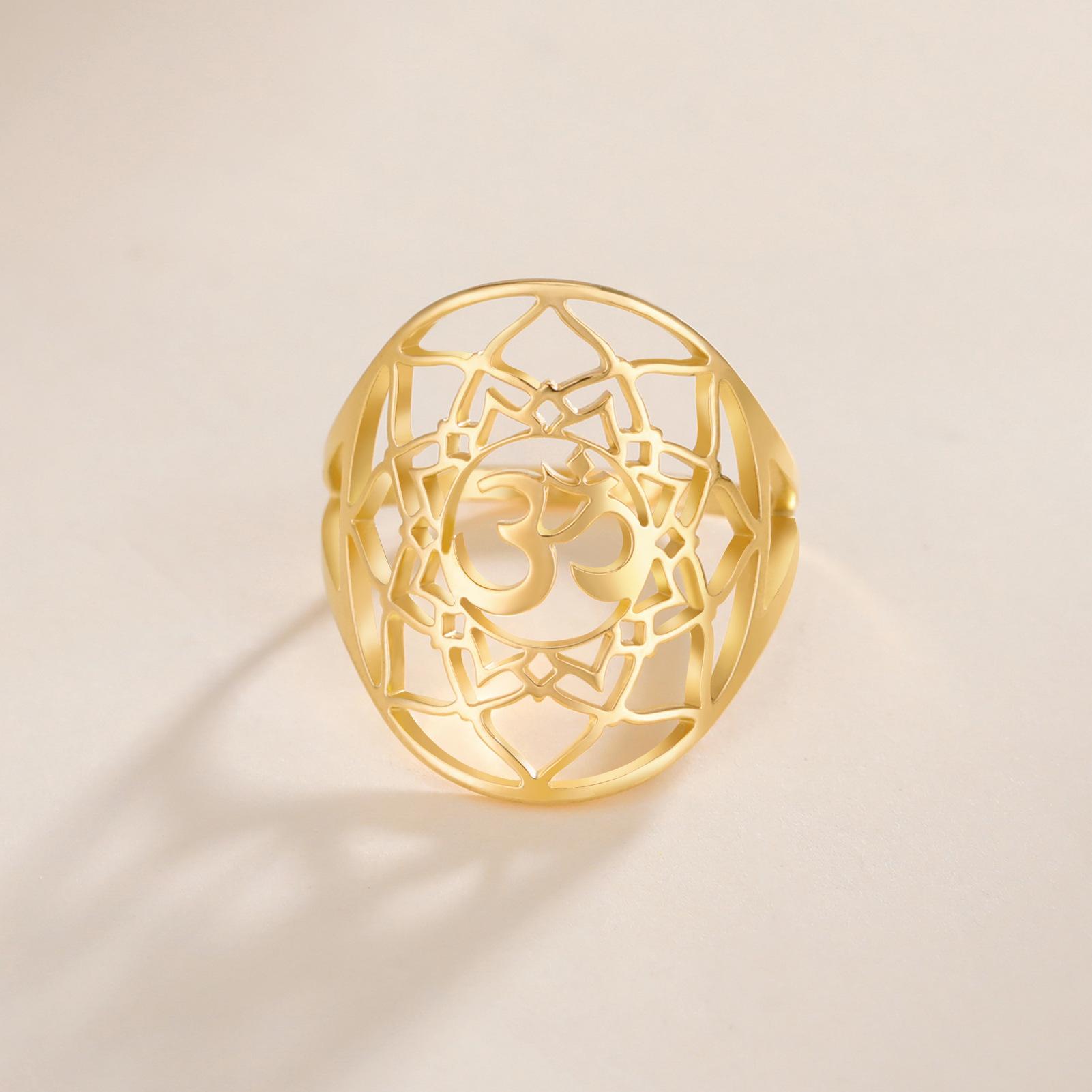 Venta al por mayor de joyas europeas y americanas, anillo de acero de titanio, elegante, de alto sentido, con símbolo de yoga hueco, anillo de flor de oro de 18 quilates.