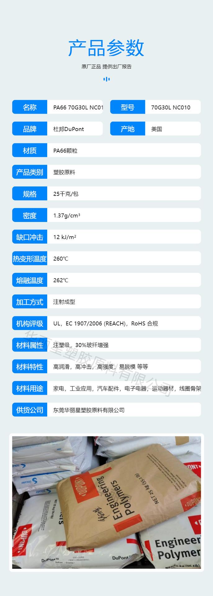 DuPont Zytel PA66 70G30L NC010 color natural reforzado con fibra de vidrio 30% nailon 66