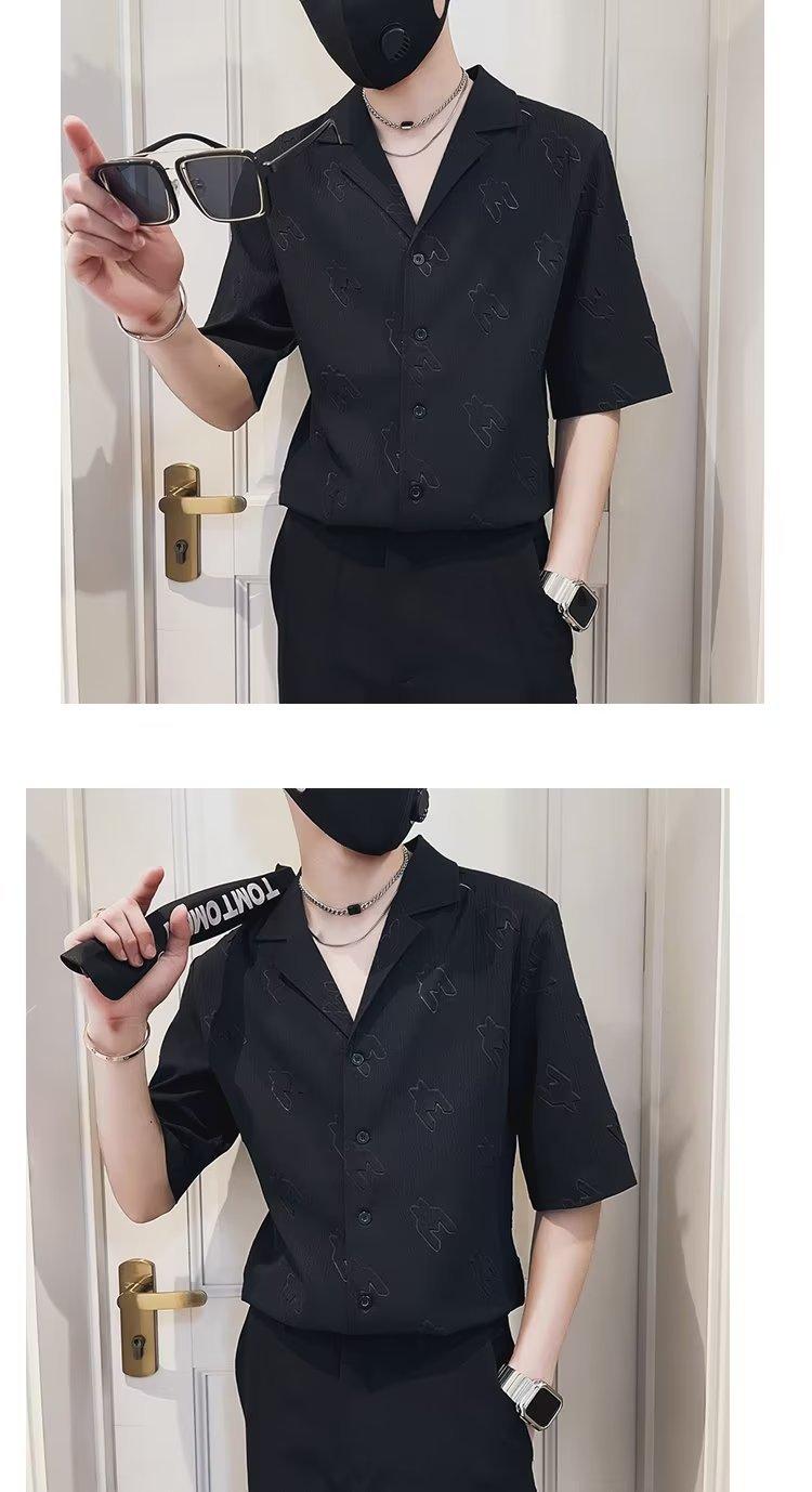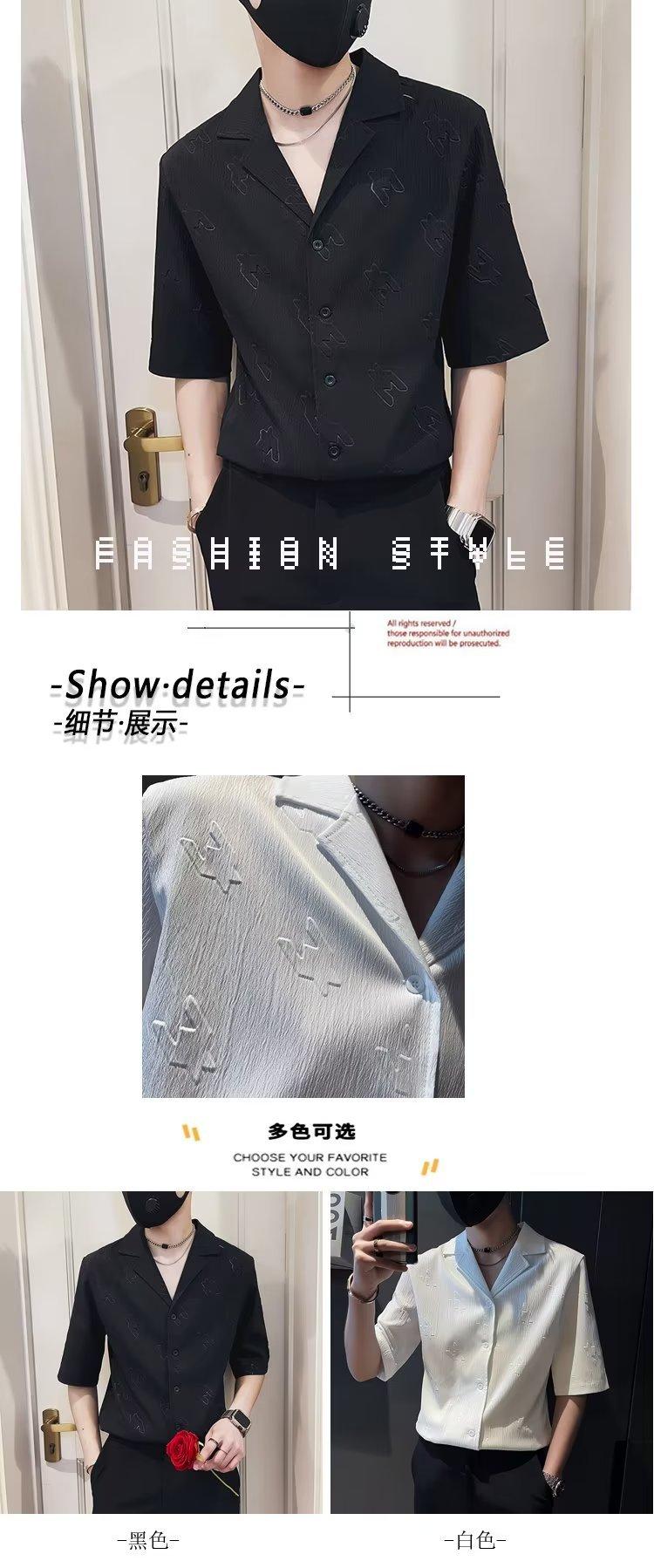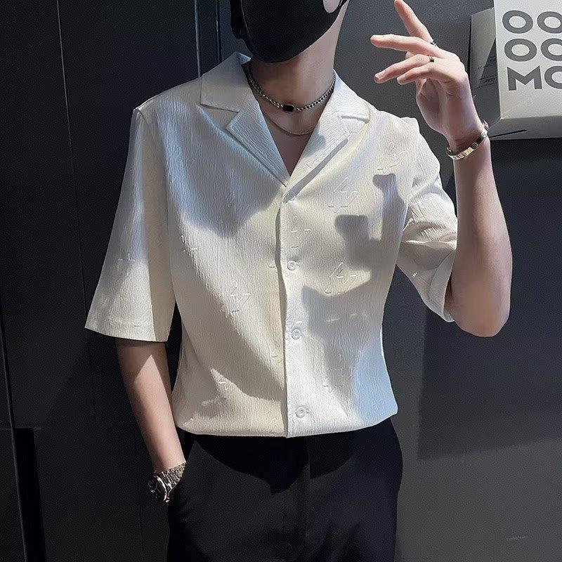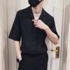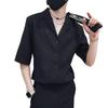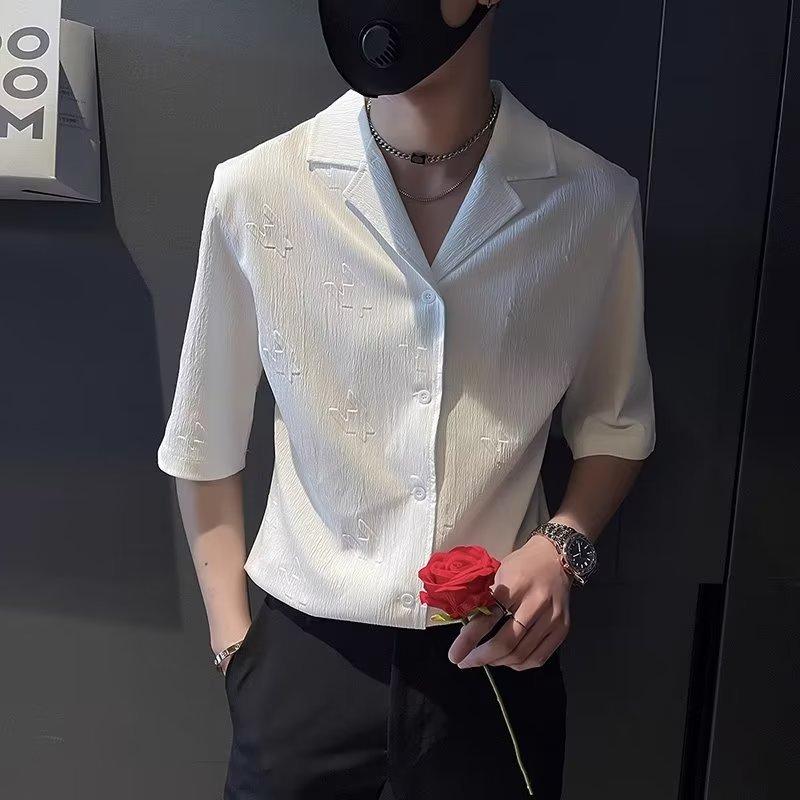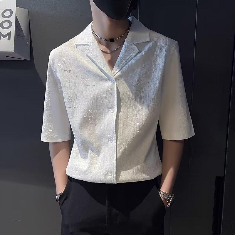 Camisa de Manga Cinco Puntos para Hombre de Manga Corta Verano Marca Trendy Seda de Hielo Camisa de Cuello Cubano Sensación de Alta Gama Yuppie Guapo Camisa Jacquard Fina