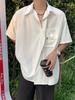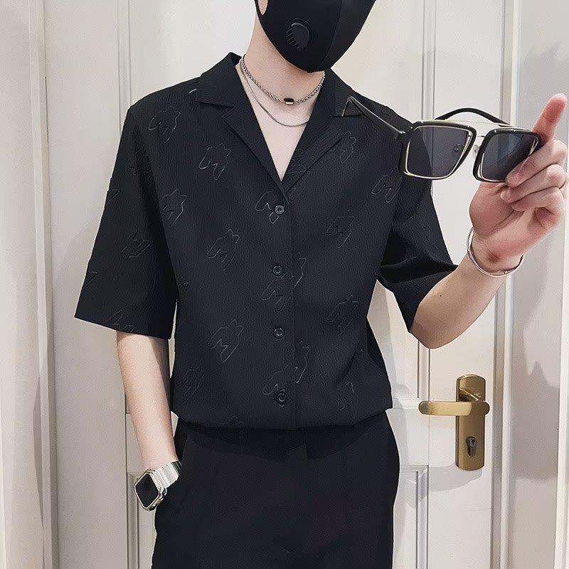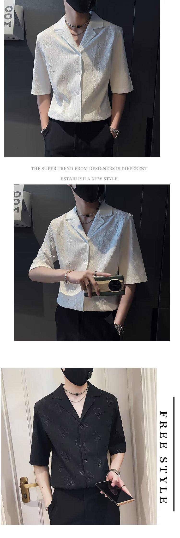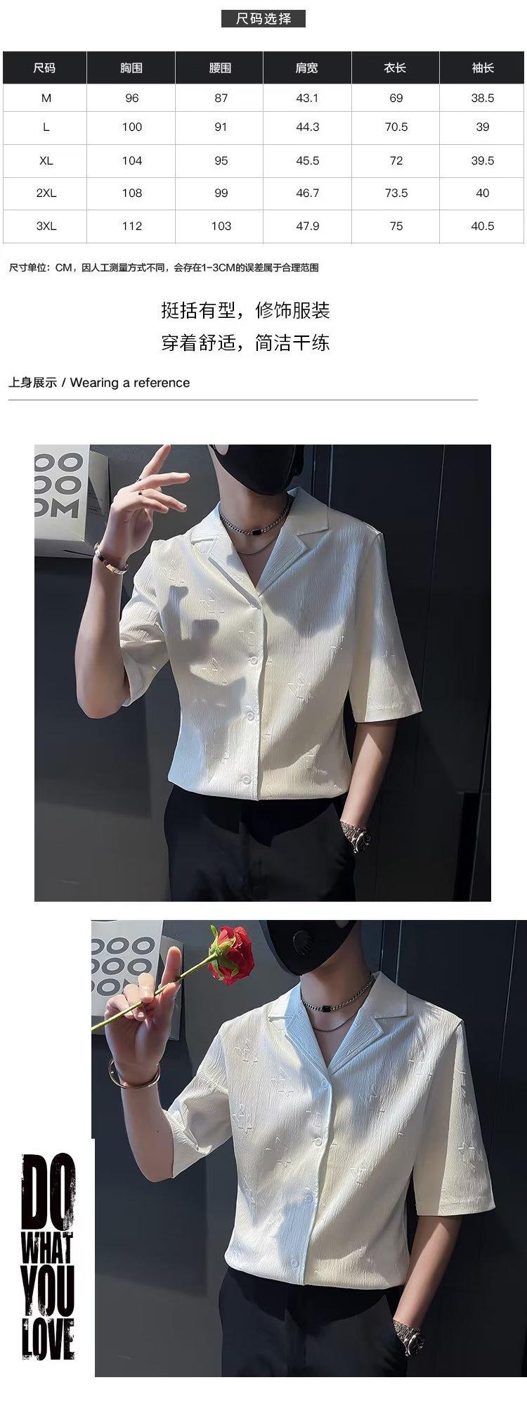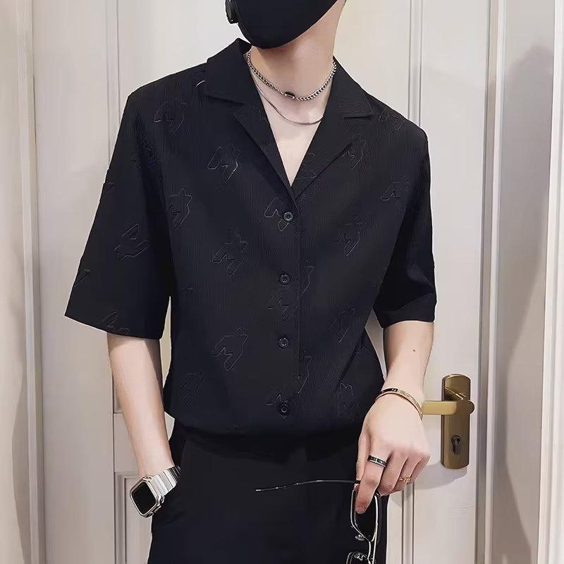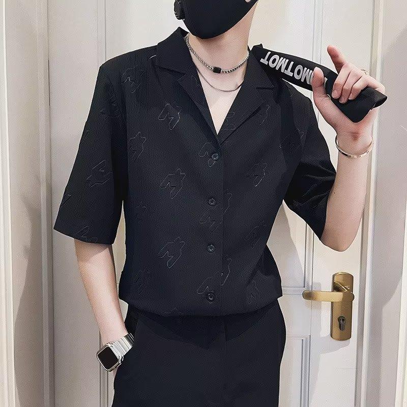 Camisa de Manga Cinco Puntos para Hombre de Manga Corta Verano Marca Trendy Seda de Hielo Camisa de Cuello Cubano Sensación de Alta Gama Yuppie Guapo Camisa Jacquard Fina