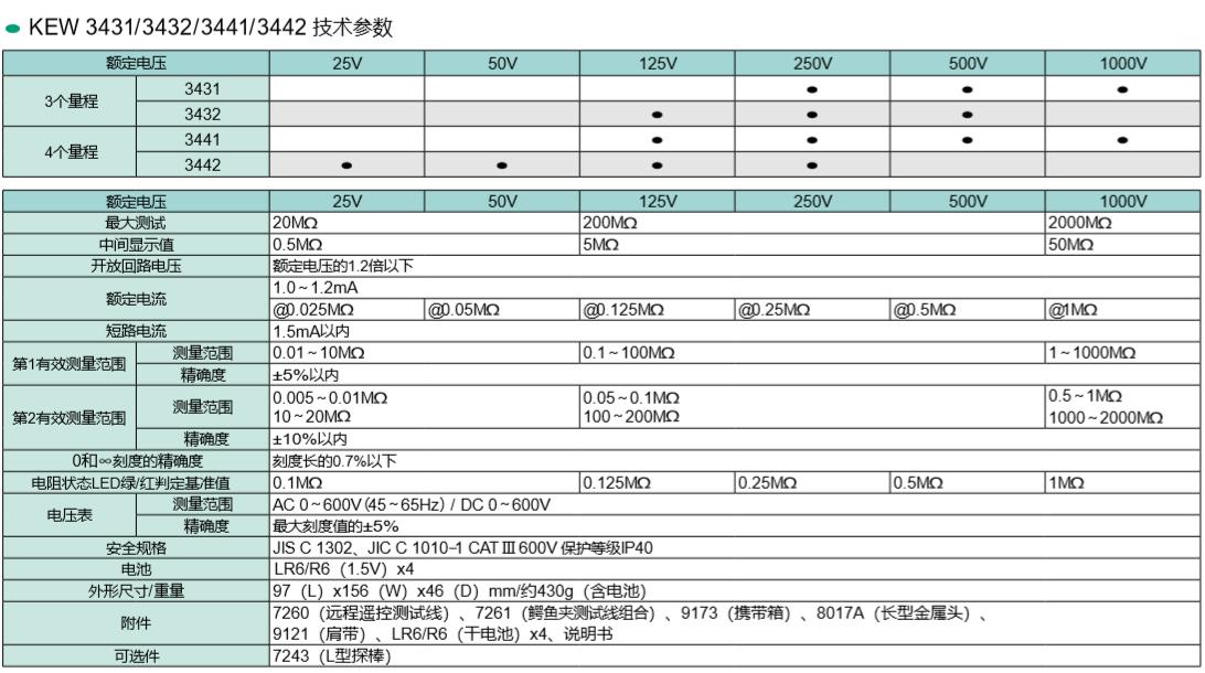 Resistencia de aislamiento Prueba de voltaje Prueba de 250 V, 500 V y 1000 V Valor de visualización intermedio Precisión del primer rango de medición efectiva Precisión del segundo rango de medición efectiva LED de estado de resistencia verde/rojo Valor de referencia de juicio Medición de voltaje Precisión de la medición de voltaje Especificaciones de seguridad Batería Dimensiones/peso Accesorios Opcional