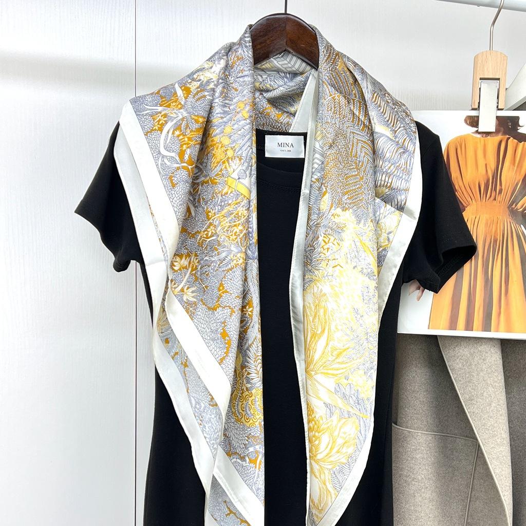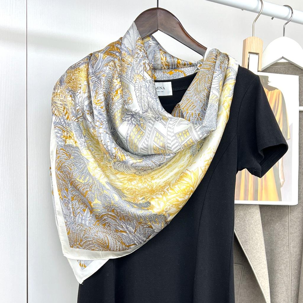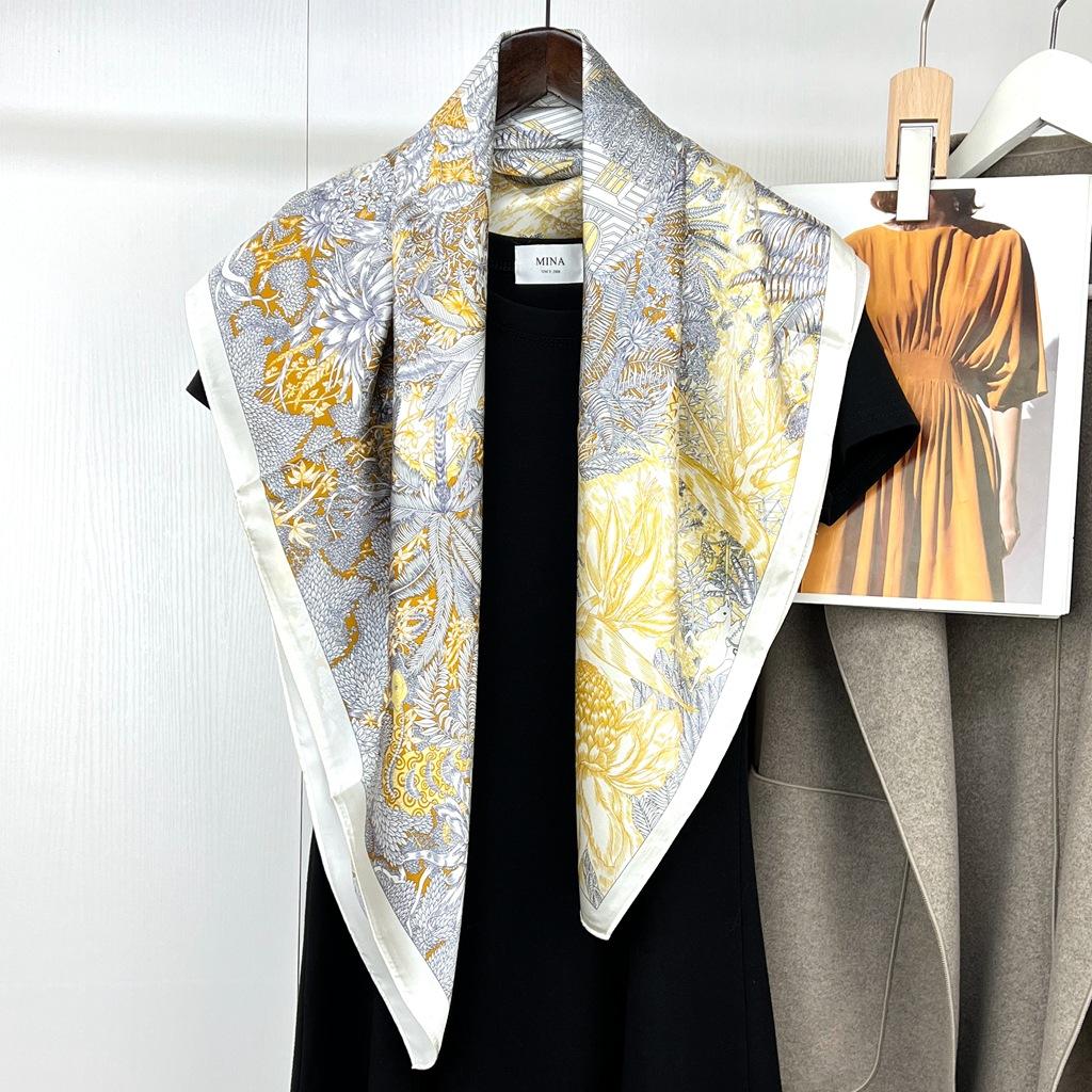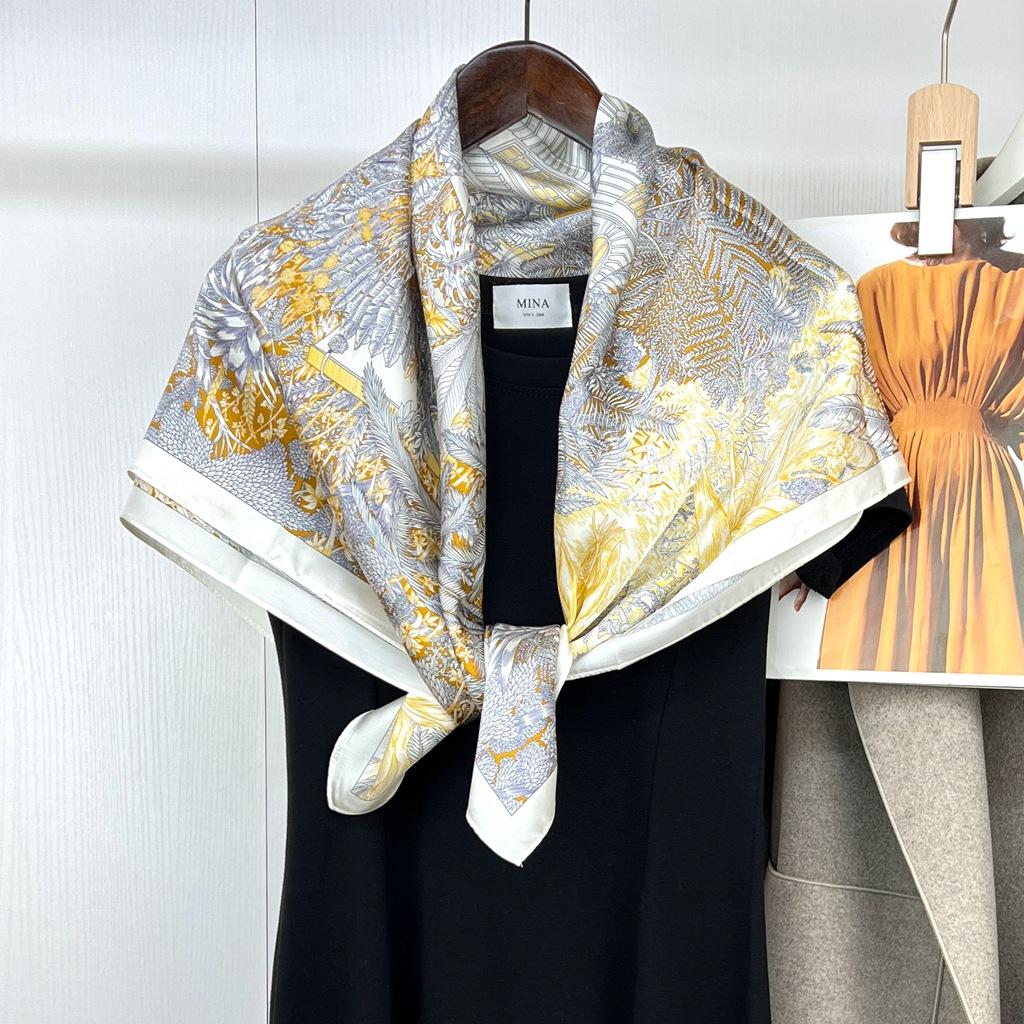 Bufanda cuadrada grande de seda 100 % para mujer, primavera y otoño, estilo occidental, moda de seda morera, color beige y blanco, 90 cm, chal de invierno