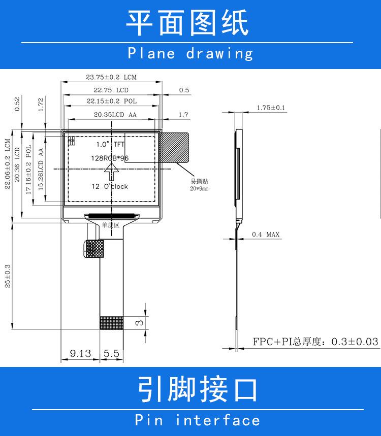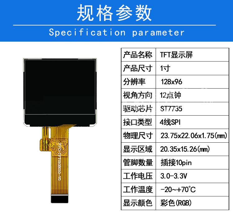 Pantalla TFT de 1 pulgada con resolución 128*96, fabricante de pantalla LCD, pantalla LCD, enchufe personalizado de 10 pines