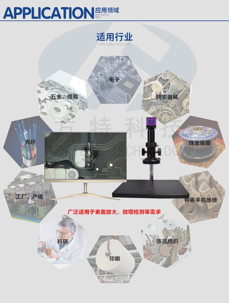 Se usa ampliamente en hardware, instrumentos de precisión, componentes electrónicos, moldes, microelectrónica, pulvimetalurgia, joyería, porcelana, relojería, textiles de joyería, identificación por huella dactilar, reparación de teléfonos móviles, arqueología, impresión, antifalsificación de billetes, fibra óptica, anatomía biológica, enseñanza escolar, investigación científica, etc., todos entornos de trabajo que requieren magnificación de superficie e inspección microscópica. Es especialmente adecuado para condiciones de trabajo como líneas de producción de fábrica o productos que se mueven a alta velocidad.