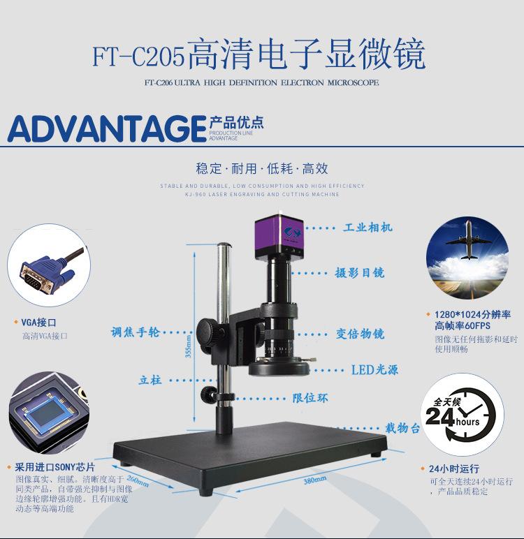 Microscopio electrónico de ultra alta definición serie FT-C microscopio FT-C205, equipado con estándares internacionales populares de alta definición, cámara industrial de alta velocidad de 60 FPS a resolución 1280*1024, lente de microscopio de alta resolución, fuente de luz anular LED de 60 perlas con brillo ajustable. La configuración de alto estándar crea una calidad excelente, y en términos de claridad de imagen, es muy superior a productos similares en la industria.