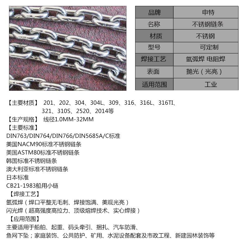 La Fábrica de Productos de Acero Inoxidable Dongtai Shente se especializa en la producción de: cadenas de acero inoxidable, cadenas de elevación, cadenas de transmisión; cables de acero inoxidable, cables de acero inoxidable, cables para redes protectoras invisibles, cables recubiertos de plástico; círculos de acero inoxidable, anillos de acero inoxidable, anillos D de acero inoxidable, hebillas D y otros conectores de aparejo. Materiales principales: 304, 316, 304L, 316L, 310S, 201, 202, 321, etc.