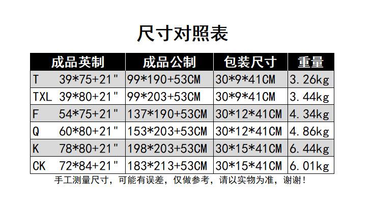 T 39*75+21 in, TXL 39*80+21 in, F 54*75+21 in, Q 60*80+21 in, K 78*80+21 in, CK 72*84+21 in