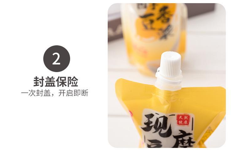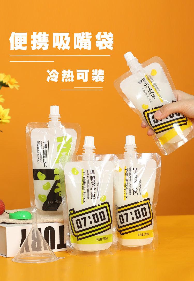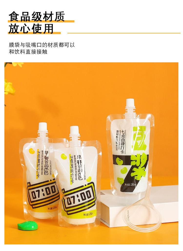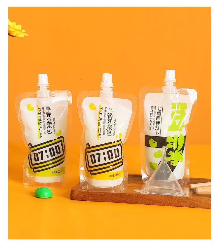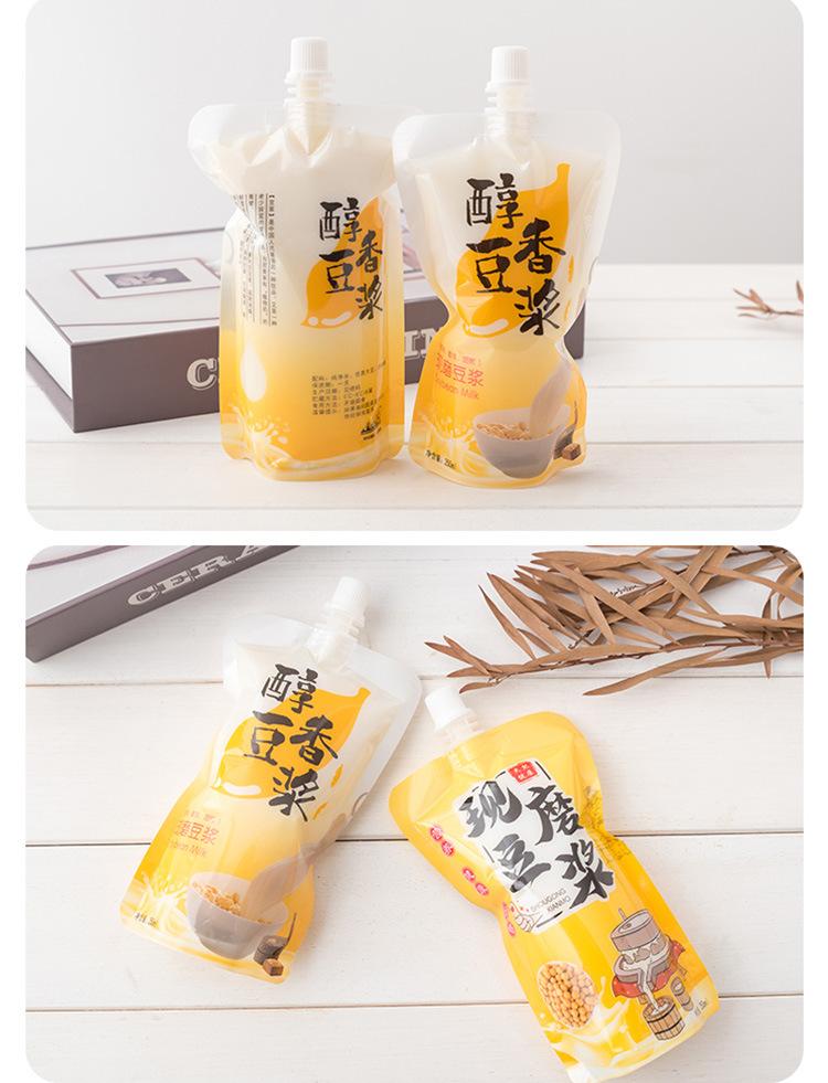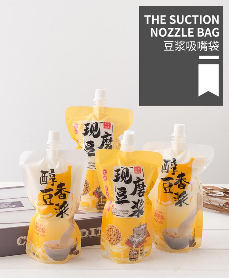 Bolsa de envasado de leche de soja personalizada, bolsa con boquilla independiente, para desayuno para llevar, vaso desechable y práctico para leche de soja recién molida para uso comercial.