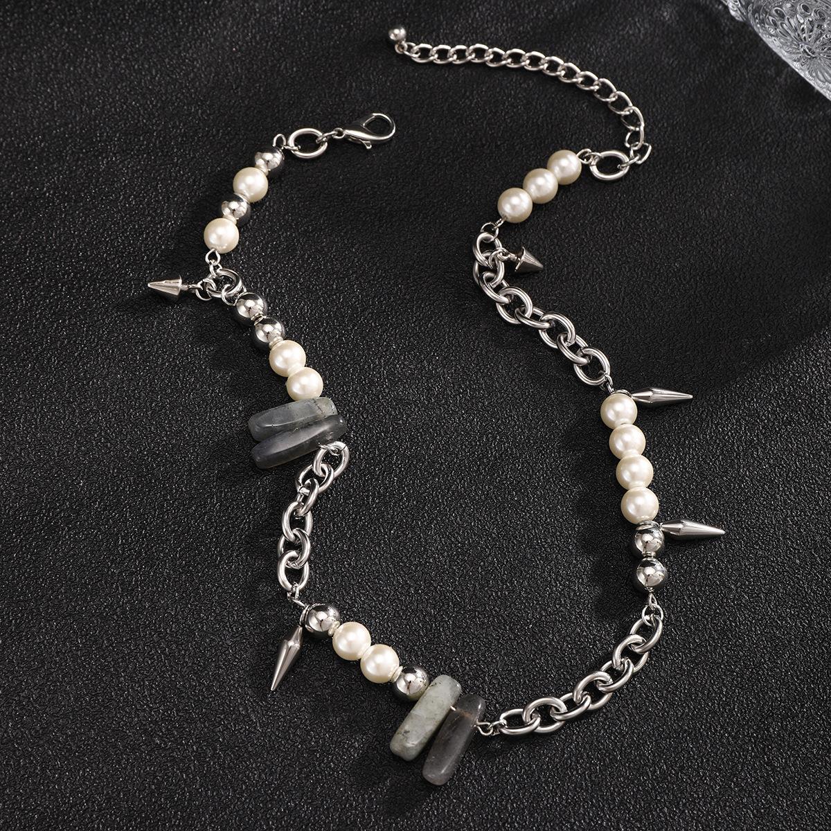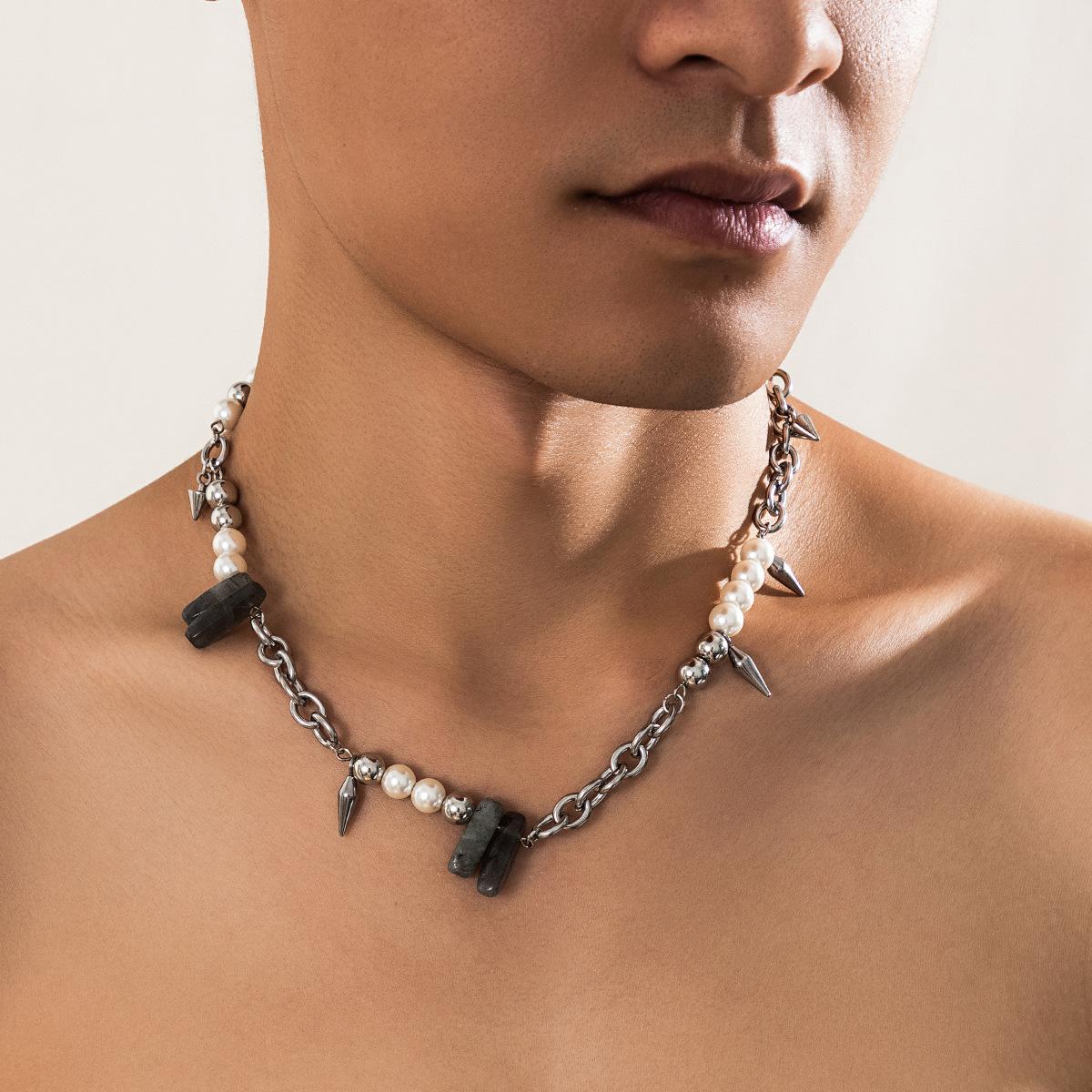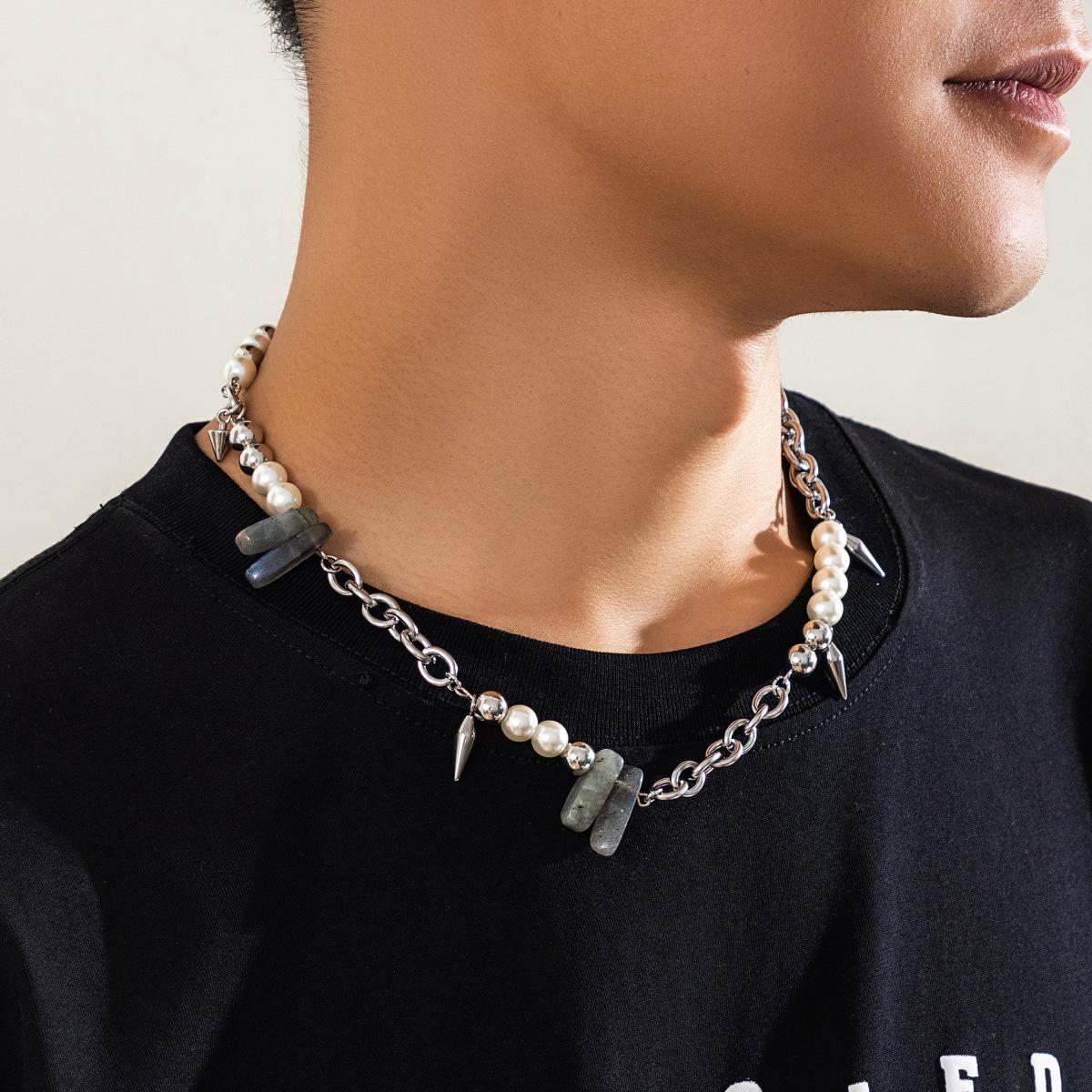 Collar de piedra de perla con costuras que combinan con todo, estilo europeo y americano, para hombre, estilo hip hop, cadena de clavícula con remaches simples de alta calidad.