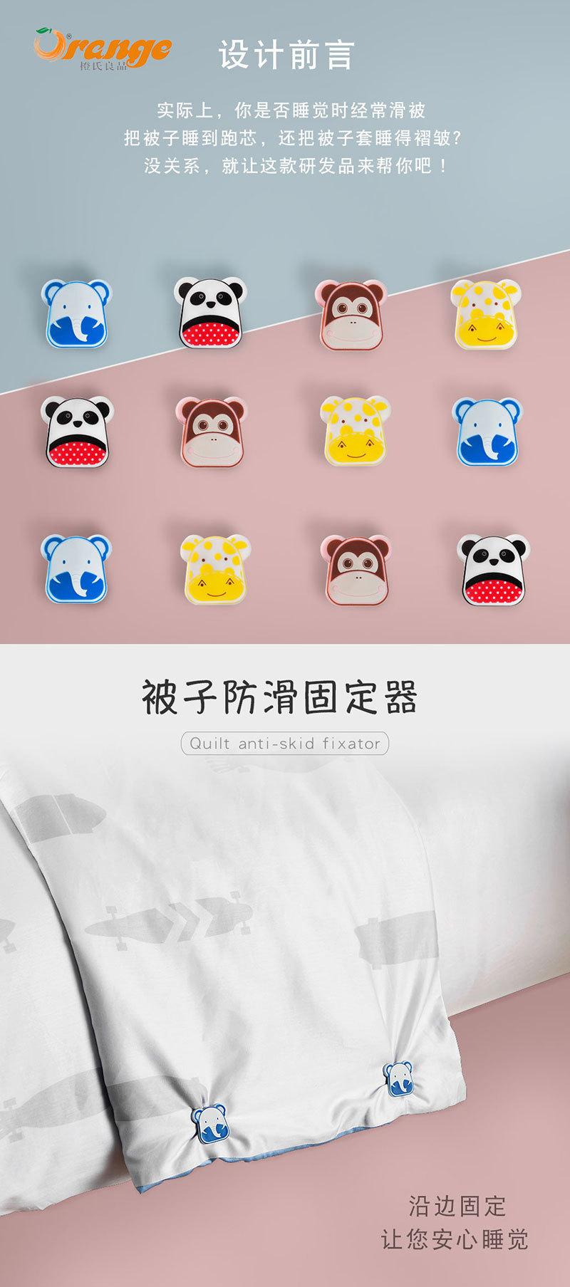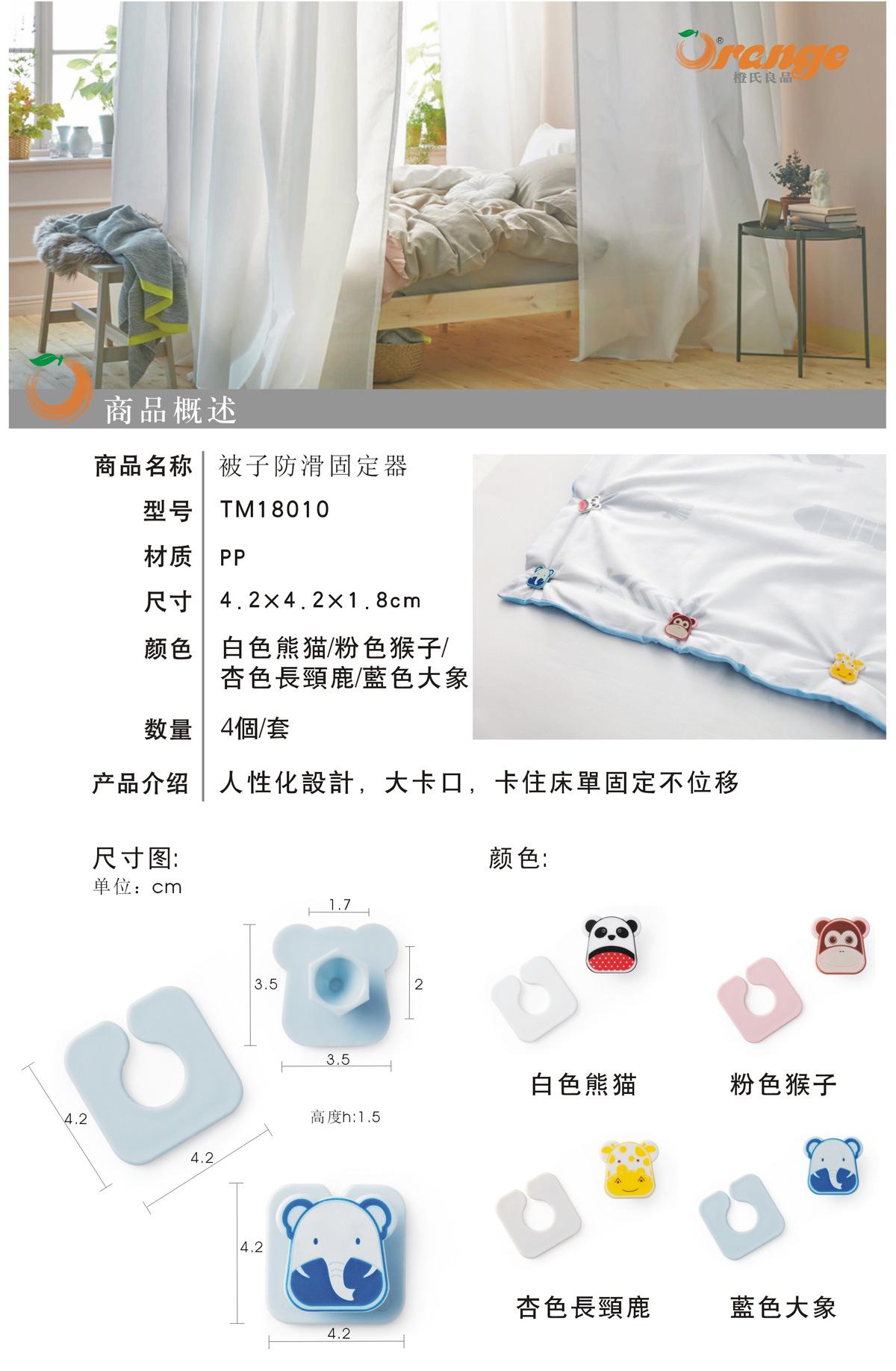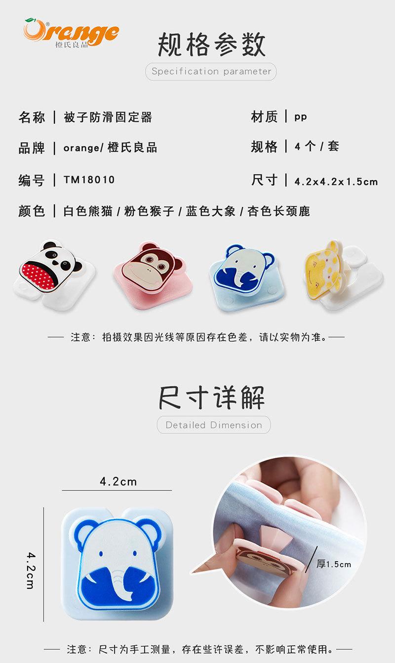 【Nombre del producto】: Cierre antideslizante para colcha 【Número de producto】: TM18010 【Código de barras】:6925640601100 [Marca]: Orange/ Productos Buenos de Orange 【Material】: PP 【Color】: Panda blanco/mono rosa/jirafa albaricoque/elefante azul [Especificaciones]: 4 piezas/juego [Tamaño del producto]: 4,2 x 4,2 x 1,8 cm [Peso neto del producto]: 6,5 g [Método de embalaje del producto]: tarjeta de papel + bolsa OPP Tamaño del embalaje del producto: 4,5 x 4,5 x 2 cm [Peso bruto del producto]: 9,5 g 【Cantidad de embalaje】: 250 juegos Tamaño de la caja exterior: 45 x 35 x 20 cm 【Peso bruto FCL】: 7,7 kg [Método de embalaje]: Caja exterior corrugada de cinco capas
