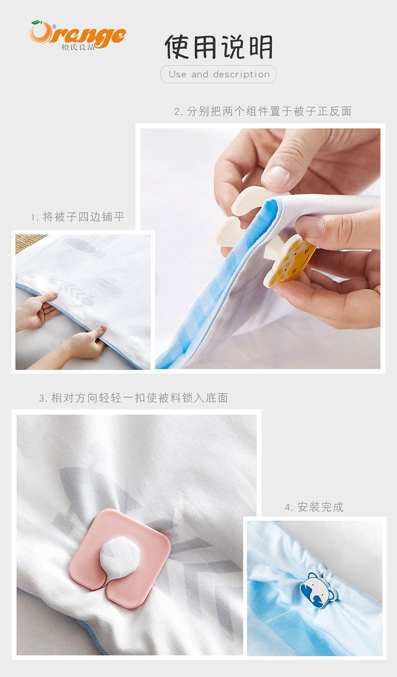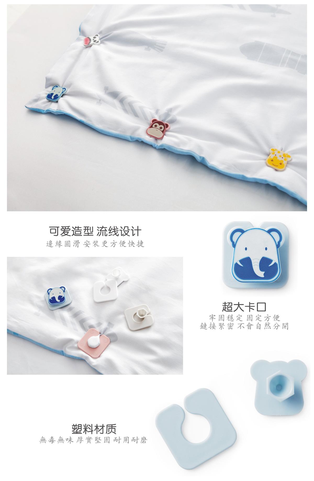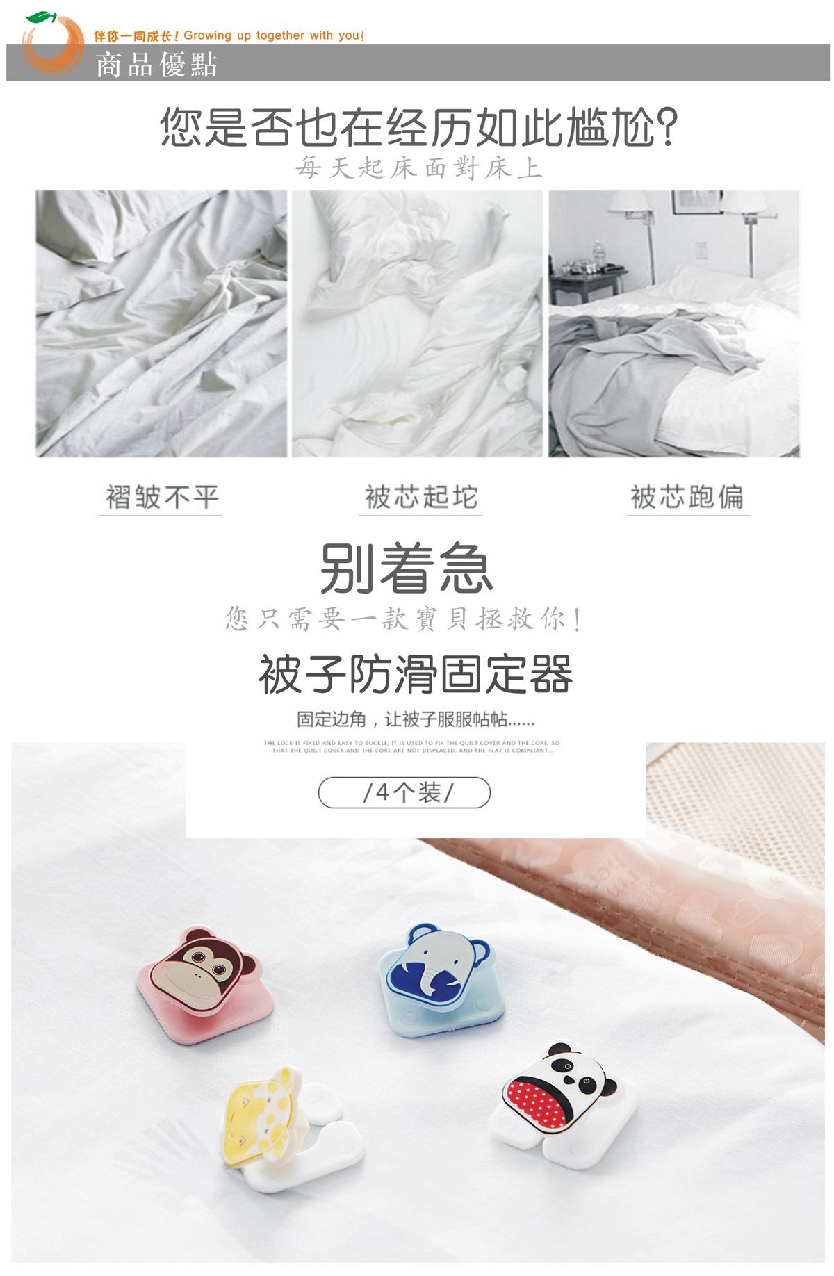 【Nombre del producto】: Cierre antideslizante para colcha 【Número de producto】: TM18010 【Código de barras】:6925640601100 [Marca]: Orange/ Productos Buenos de Orange 【Material】: PP 【Color】: Panda blanco/mono rosa/jirafa albaricoque/elefante azul [Especificaciones]: 4 piezas/juego [Tamaño del producto]: 4,2 x 4,2 x 1,8 cm [Peso neto del producto]: 6,5 g [Método de embalaje del producto]: tarjeta de papel + bolsa OPP Tamaño del embalaje del producto: 4,5 x 4,5 x 2 cm [Peso bruto del producto]: 9,5 g 【Cantidad de embalaje】: 250 juegos Tamaño de la caja exterior: 45 x 35 x 20 cm 【Peso bruto FCL】: 7,7 kg [Método de embalaje]: Caja exterior corrugada de cinco capas
