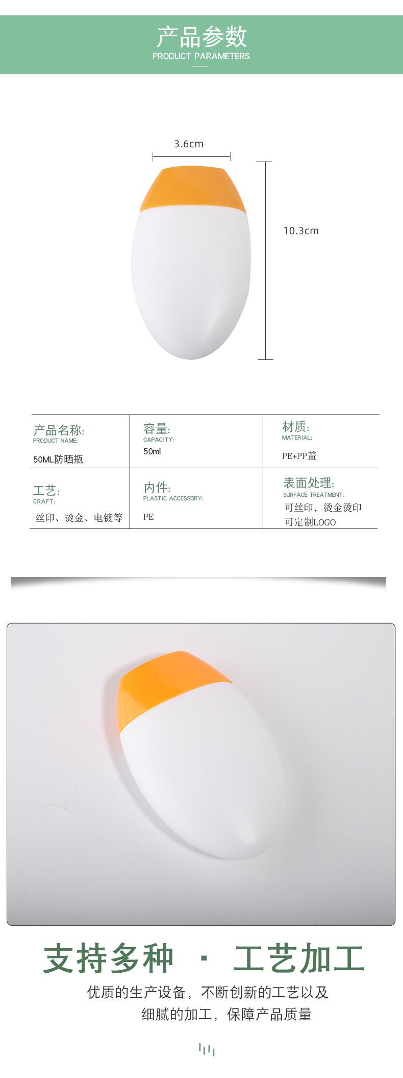 Botella de protector solar de 50 ml, material de embalaje cosmético, crema, loción, protector solar, botella de embalaje, crema de aislamiento ovalada embotellada