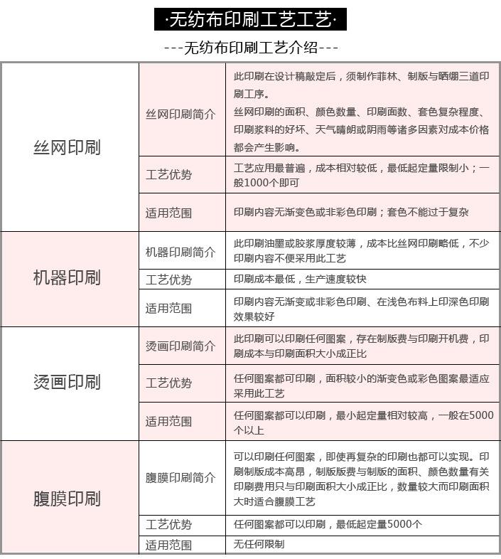El material principal de las bolsas no tejidas es tela no tejida. La tela no tejida es un nuevo tipo de producto de fibra con estructura suave, transpirable y plana formado directamente a partir de chips de polímero, fibras cortas o filamentos a través de varios métodos de formación de red y tecnologías de consolidación. Proceso de producción: |