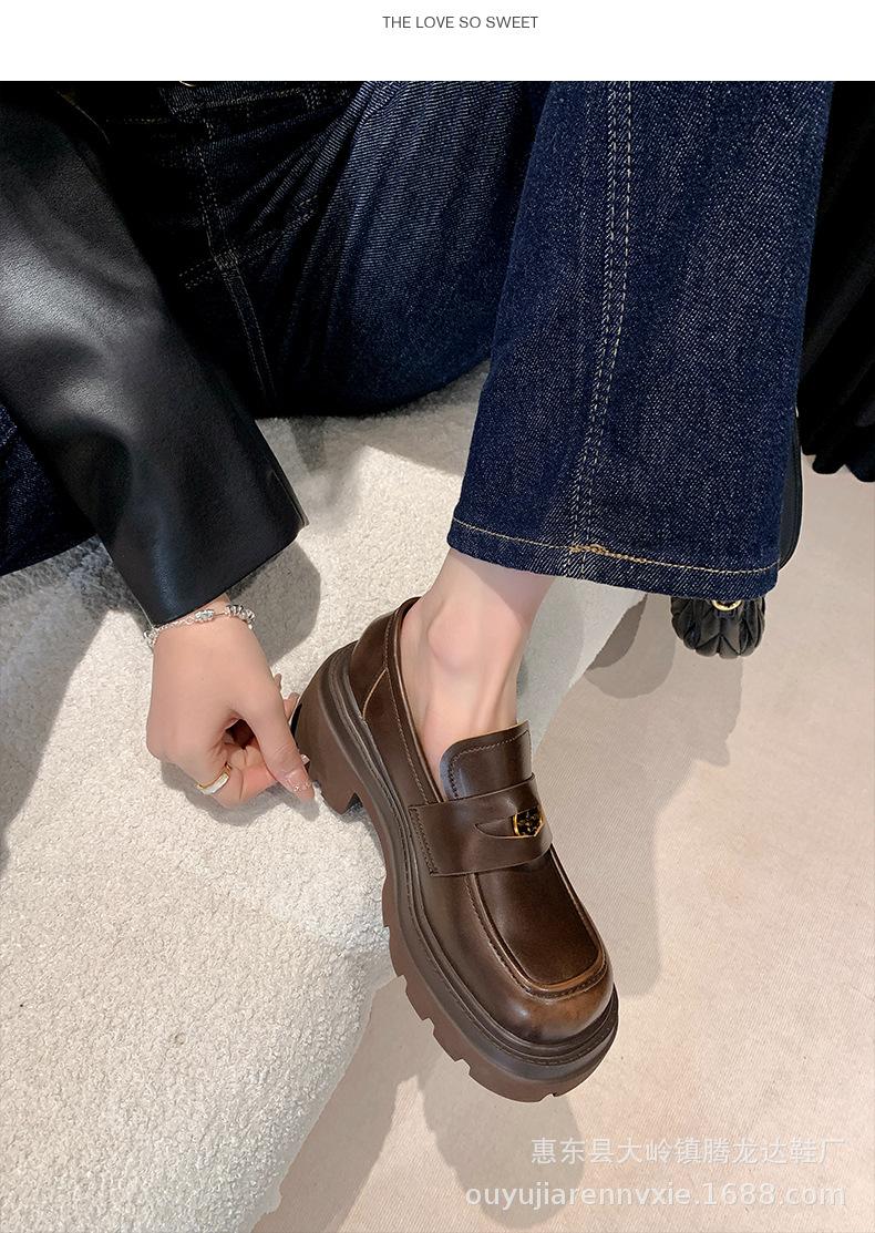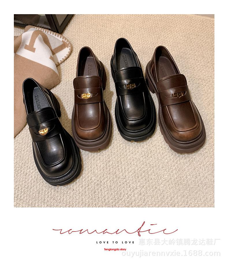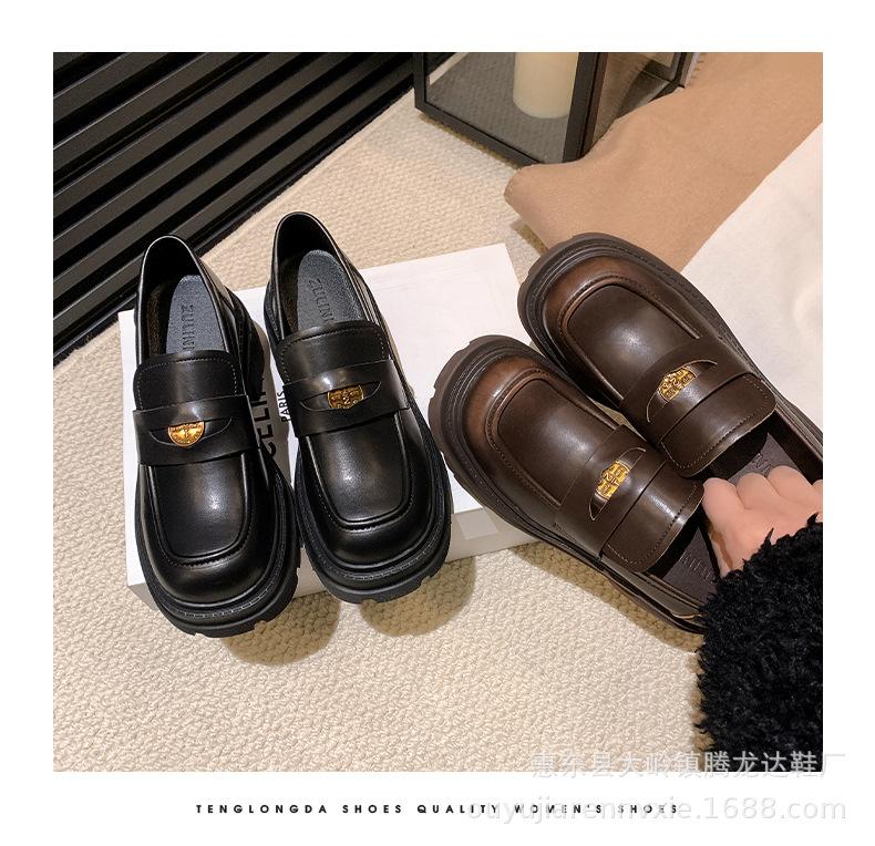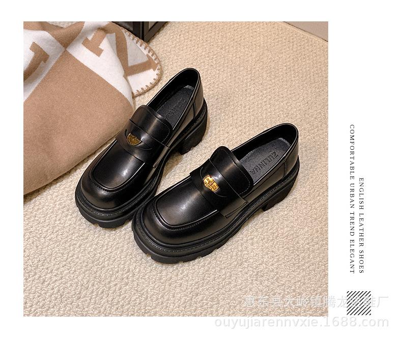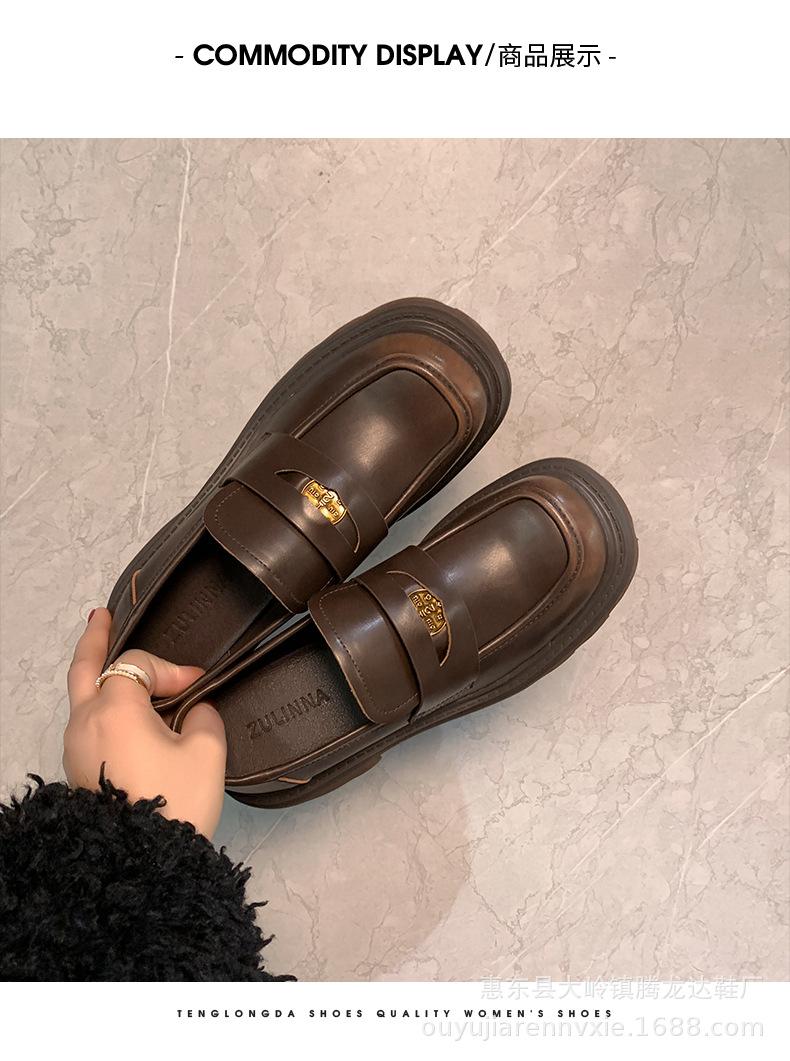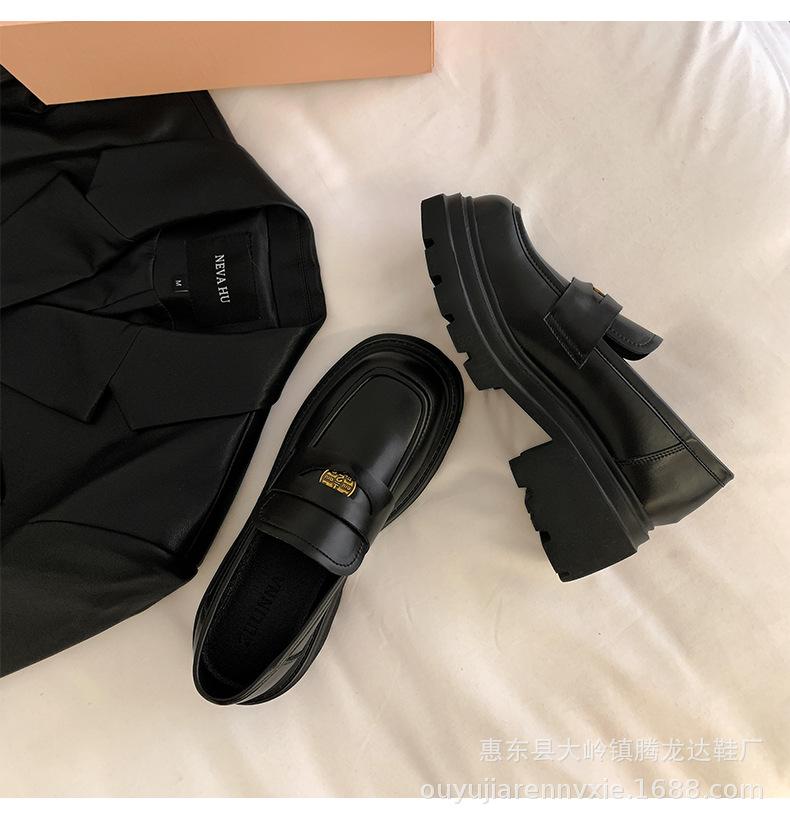 Mocasines de mujer, zapatos de plataforma de suela gruesa, estilo británico, con hebilla de metal del Arco del Triunfo, zapatos sencillos de tacón grueso, zapatos casuales de cuero pequeños que combinan con todo.