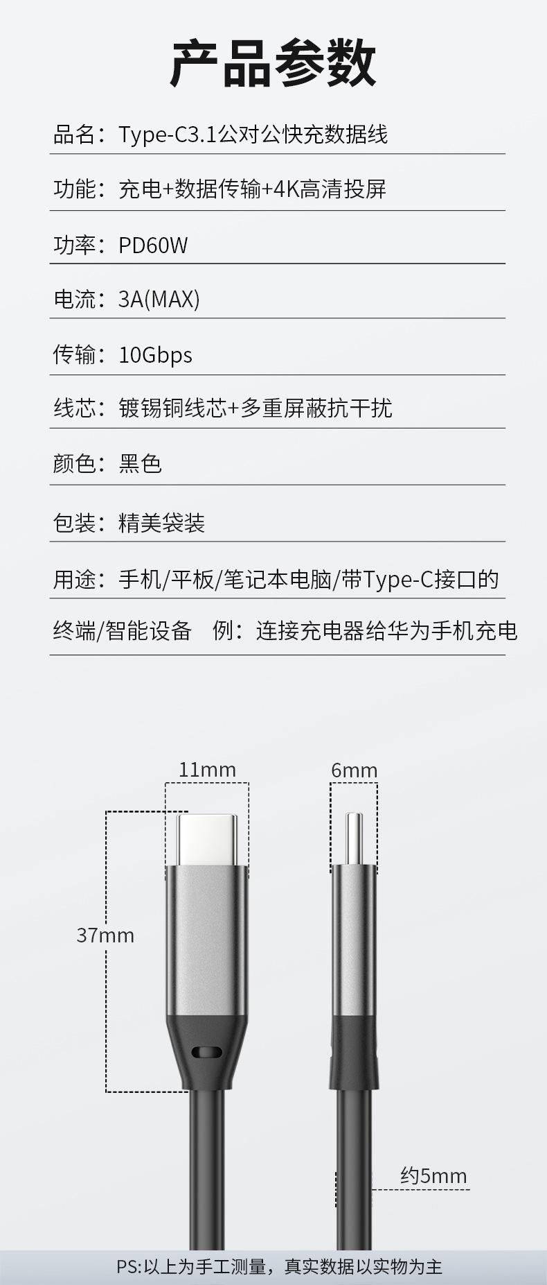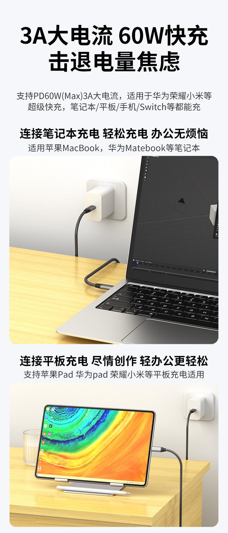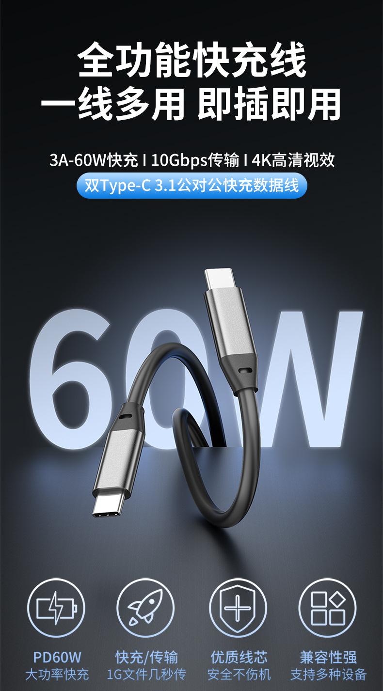 Línea de datos tipo C, línea de carga rápida de 60 W, línea de conexión de transmisión de disco duro de computadora de 10 G, línea de carga de teléfono móvil de 3 A, tipo C