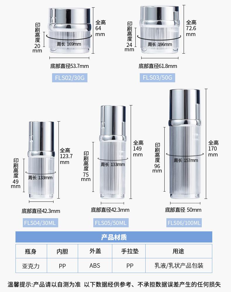 30g cream bottle, 50g cream bottle, 30ml lotion bottle, 50ml lotion bottle, 100ml lotion bottle