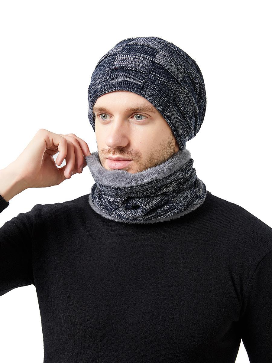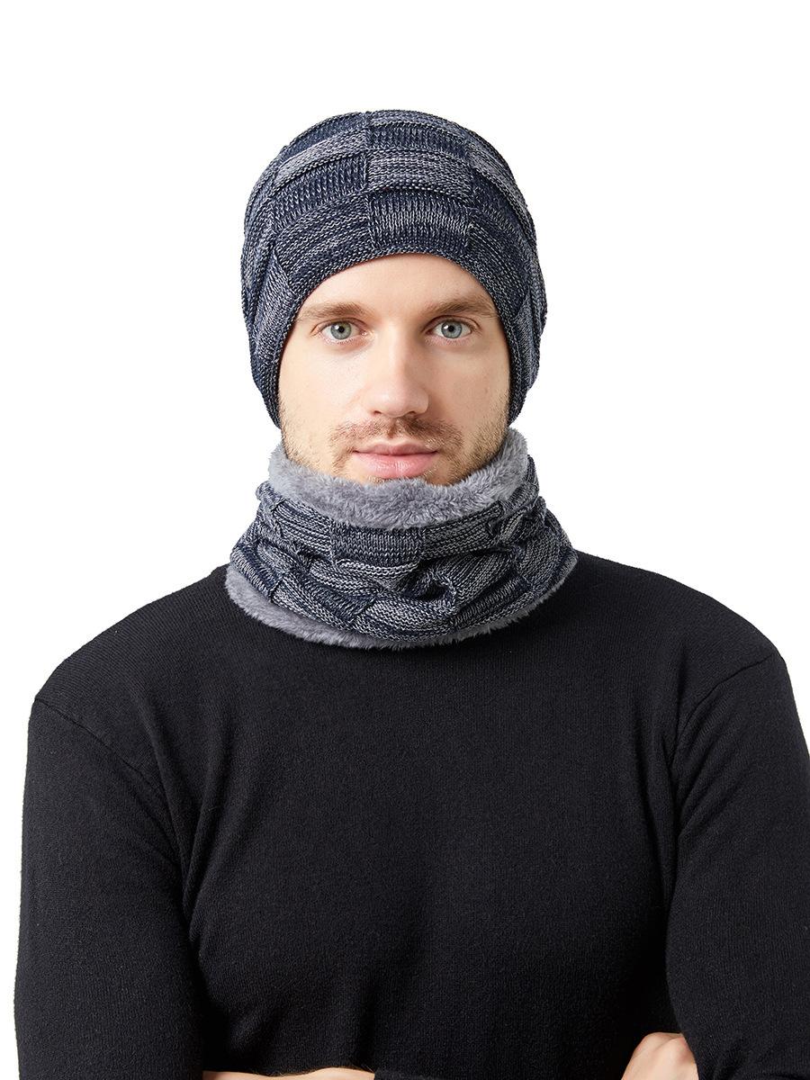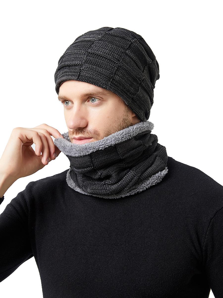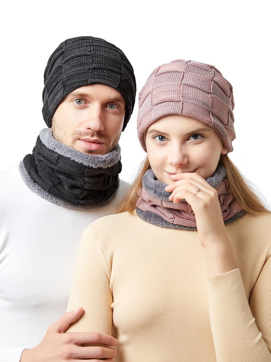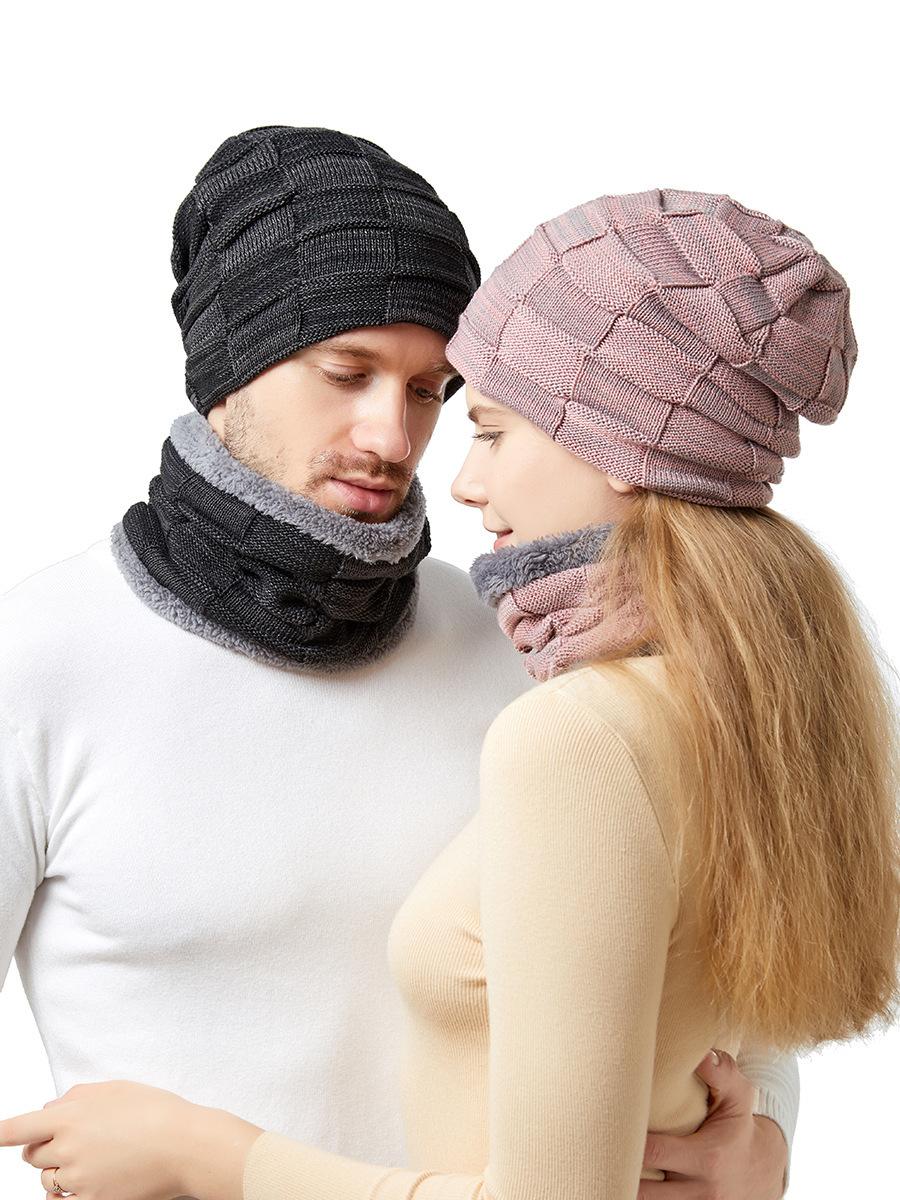 Gorro de hombre de otoño e invierno de Amazon, bicolor, cuadrado, forrado de vellón, gorro de punto, bufanda, conjunto de dos piezas, gorro de pila para pareja