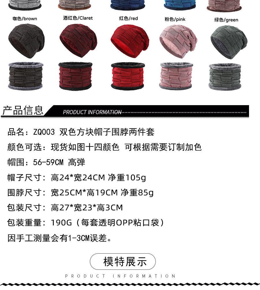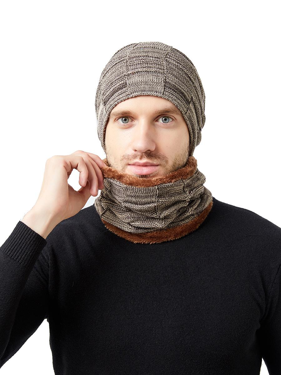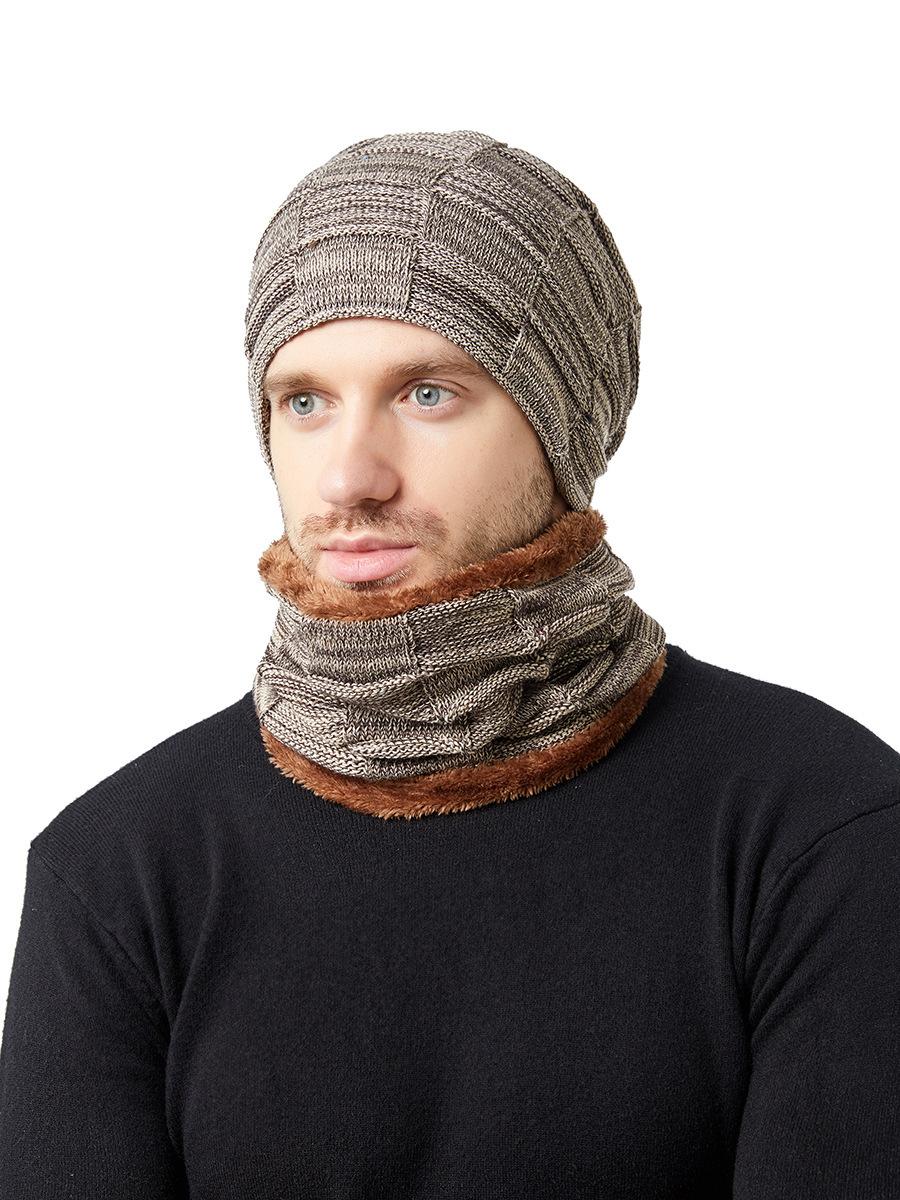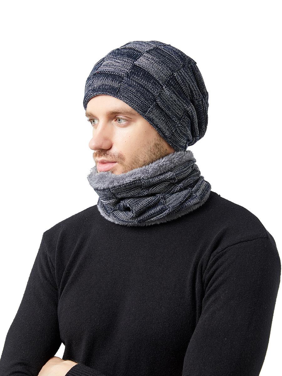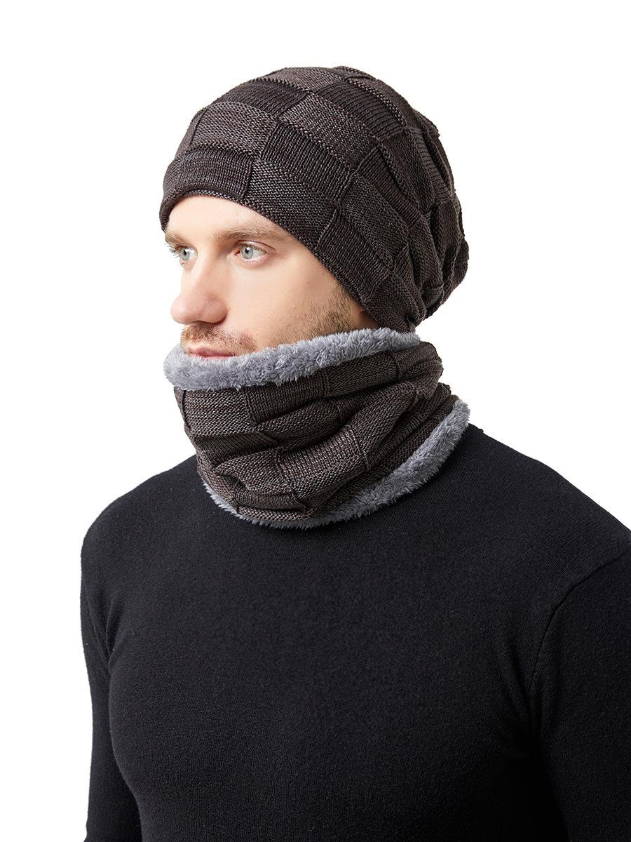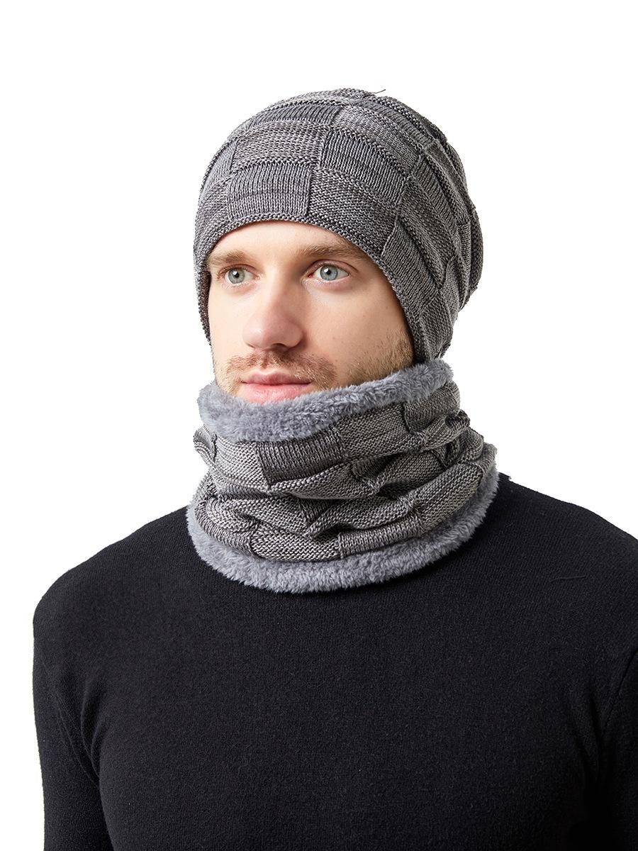 Gorro de hombre de otoño e invierno de Amazon, bicolor, cuadrado, forrado de vellón, gorro de punto, bufanda, conjunto de dos piezas, gorro de pila para pareja