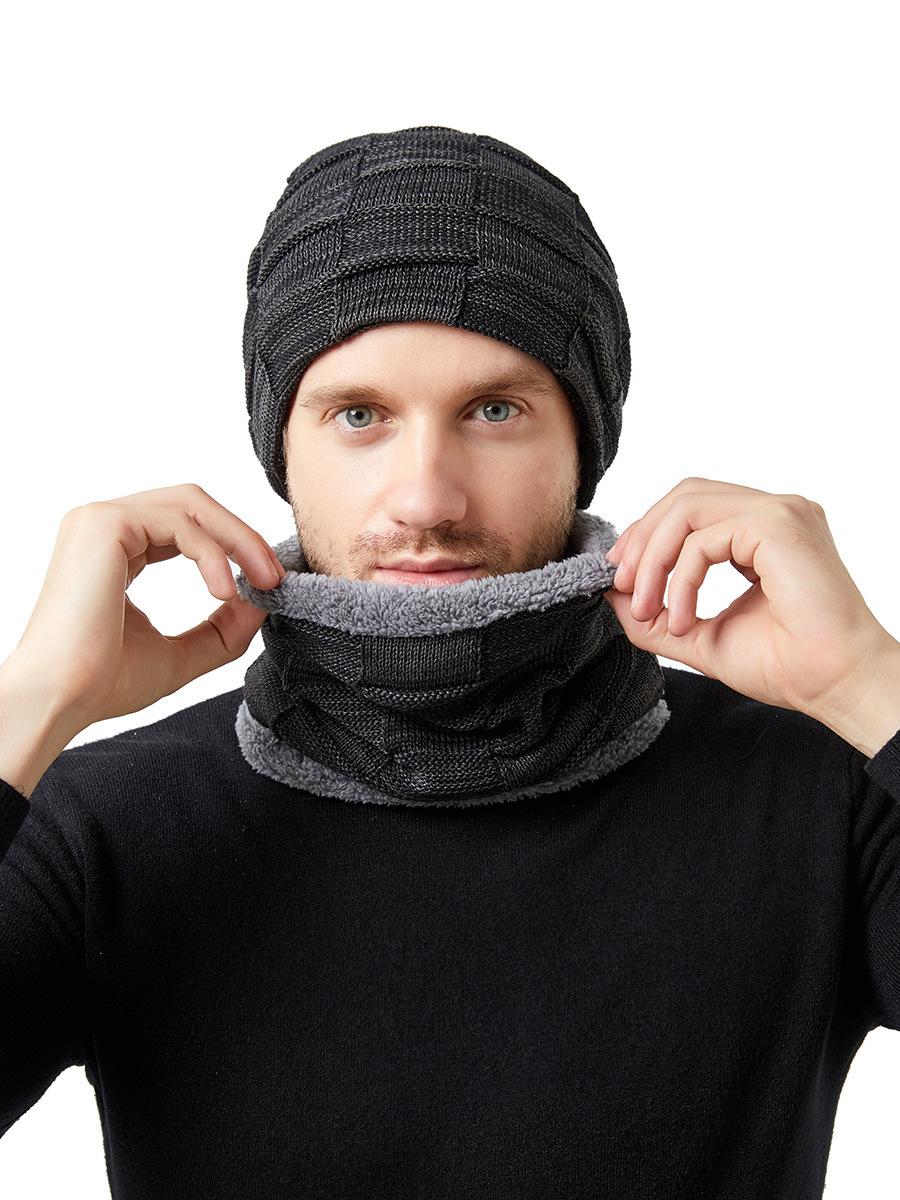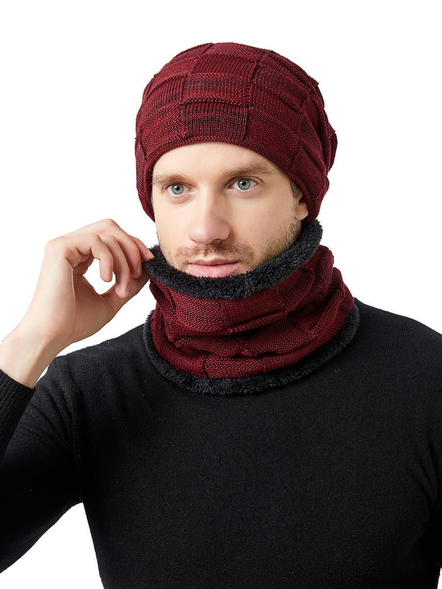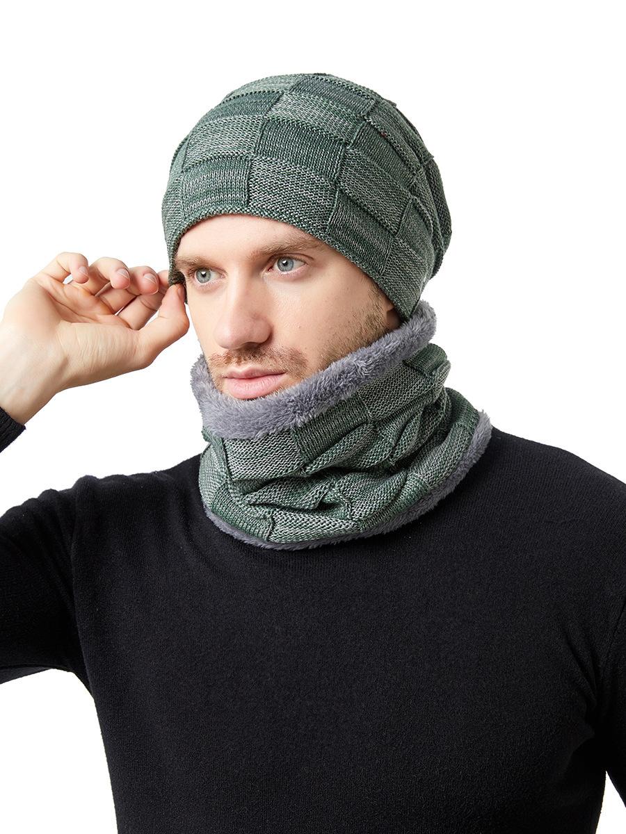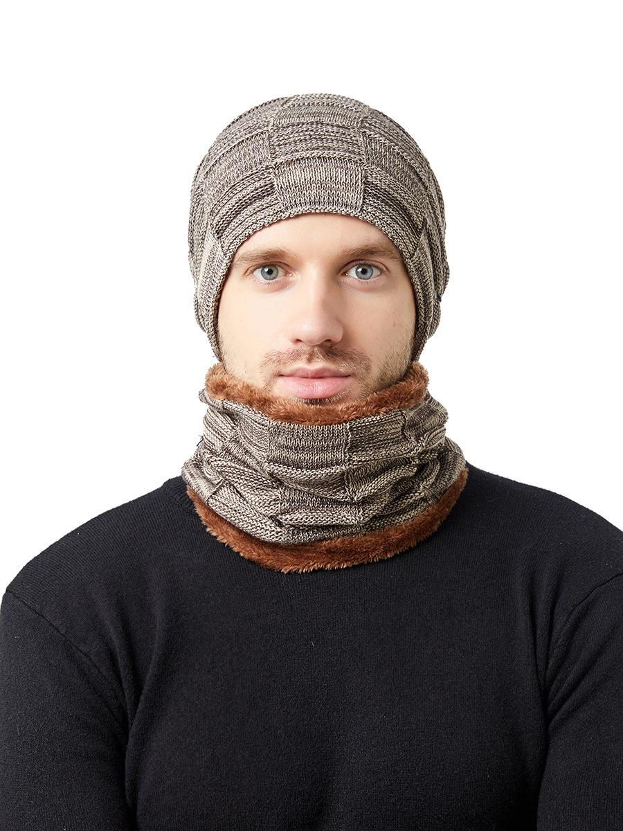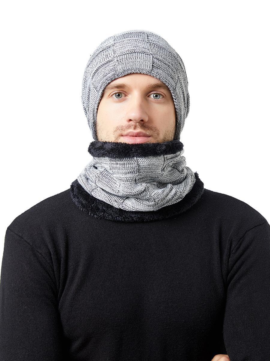 Gorro de hombre de otoño e invierno de Amazon, bicolor, cuadrado, forrado de vellón, gorro de punto, bufanda, conjunto de dos piezas, gorro de pila para pareja