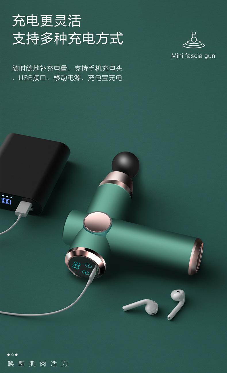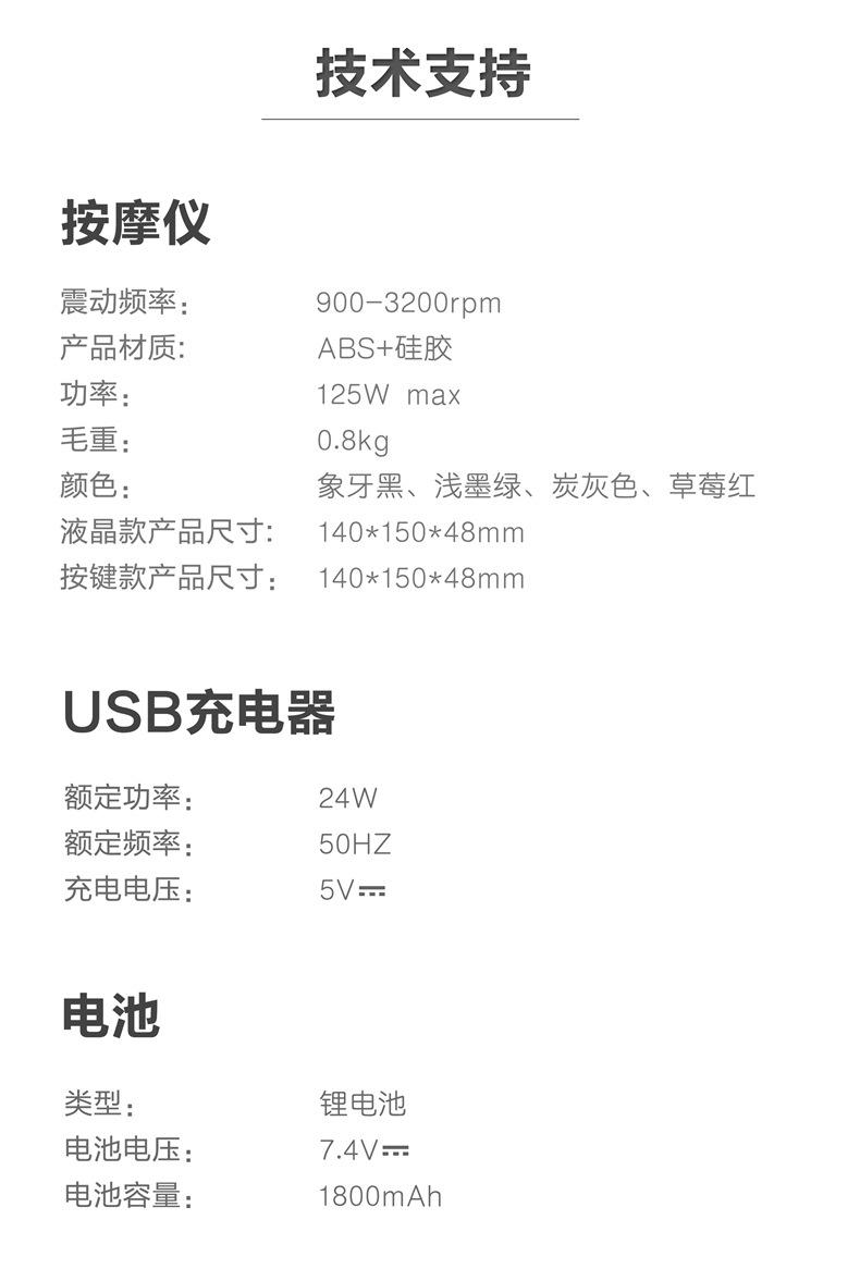 Características del producto: Carga USB, interfaz tipo C, 4 cabezales de masaje, pantalla táctil: 32 niveles, botones: 6 niveles,