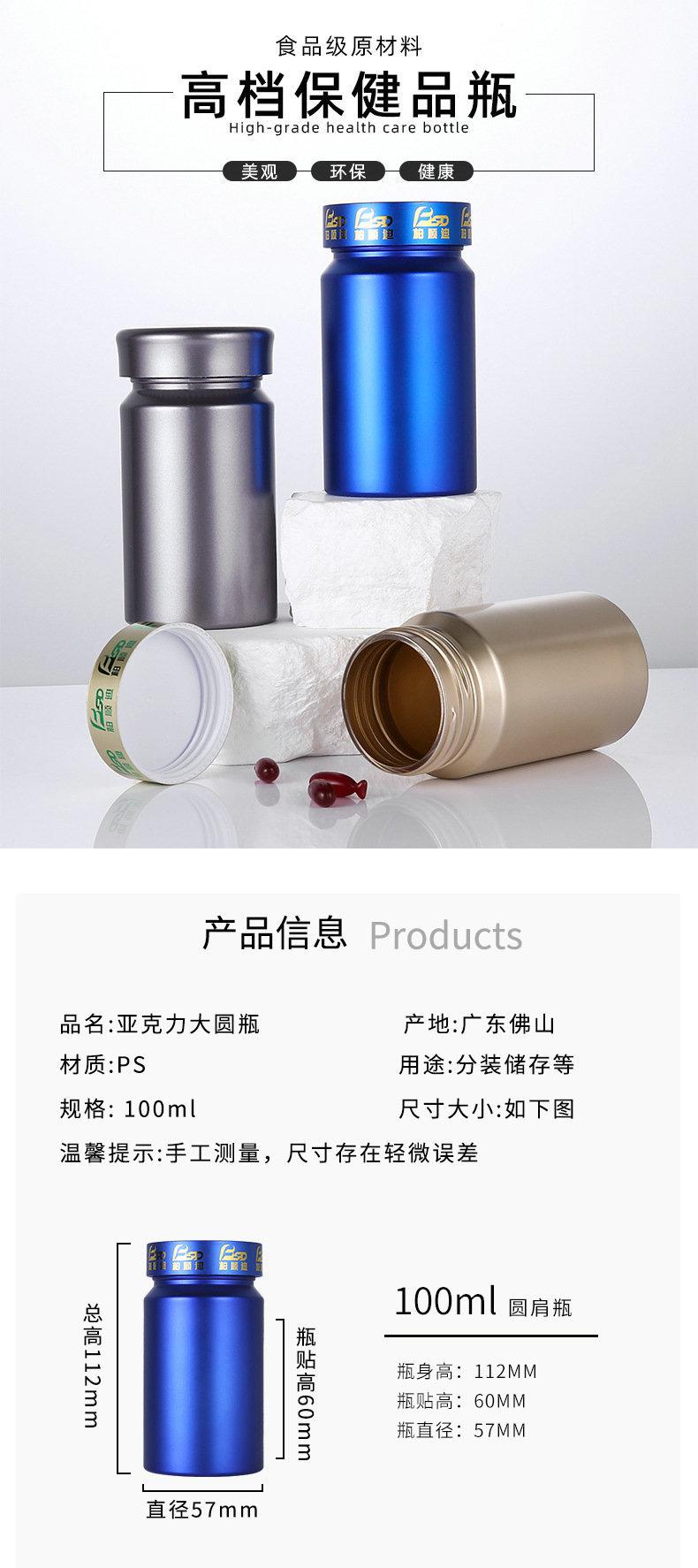 Productos acrílicos para el cuidado de la salud, botella redonda, botella de cápsula de 100 ml, NMN60, tabletas, botella de medicamento, botella vacía, botella de embalaje, venta al por mayor
