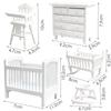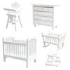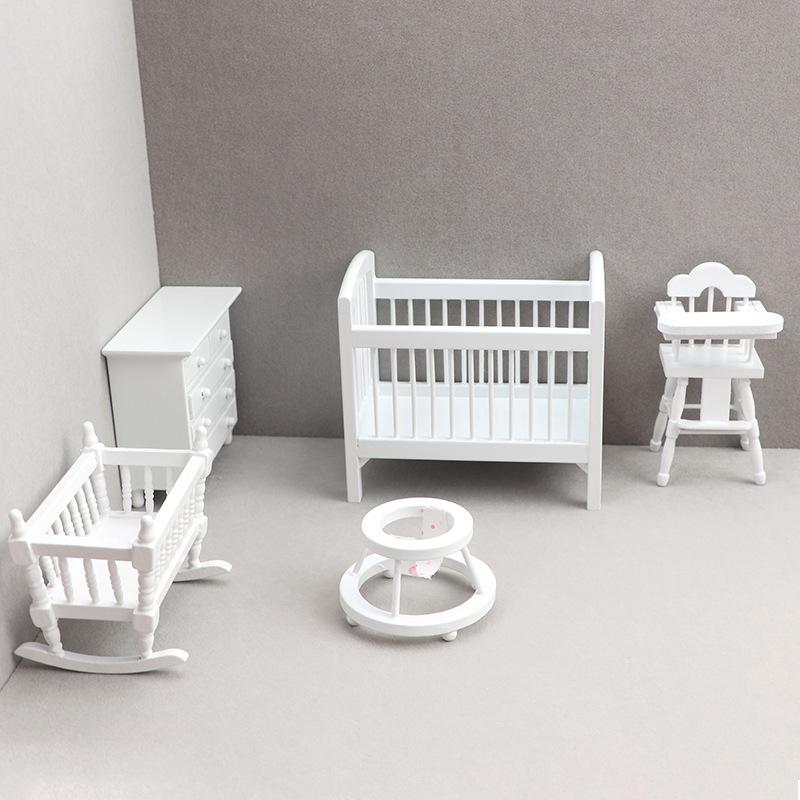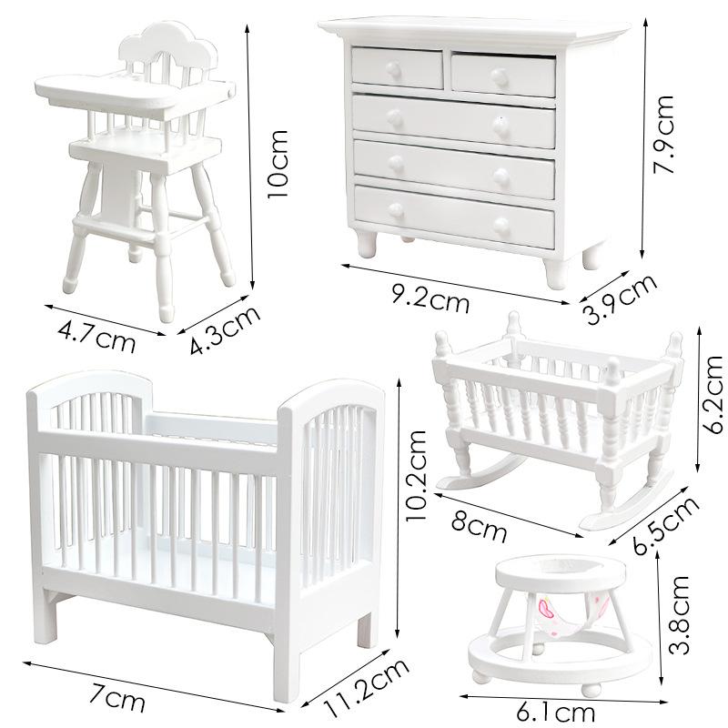 Incluye: 1 cama pequeña, 1 silla de comedor, 1 cama mecedora, 1 andador, 1 armario