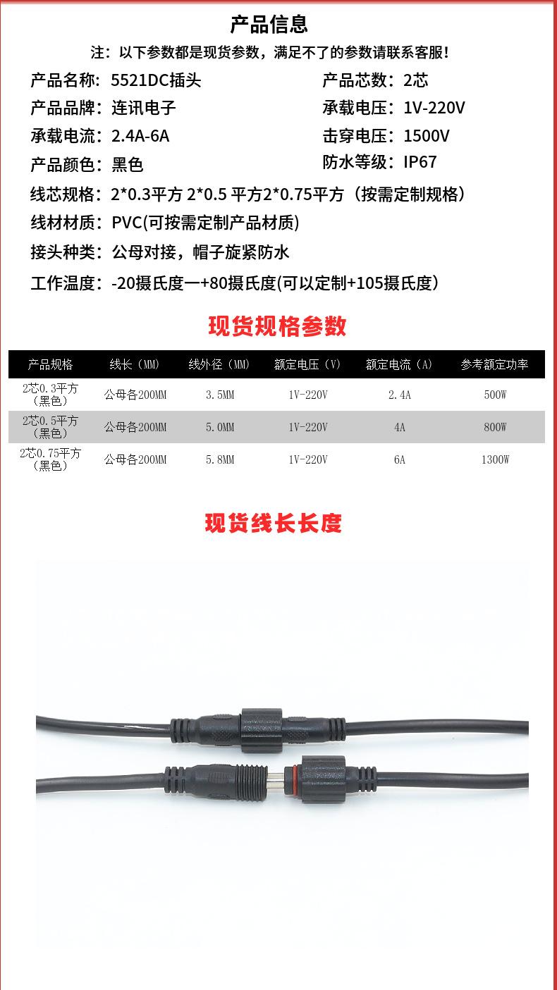 Enchufe de CC de 2 núcleos DC5521, macho y hembra, negro, cable de carga de 5 metros, cable alargador.