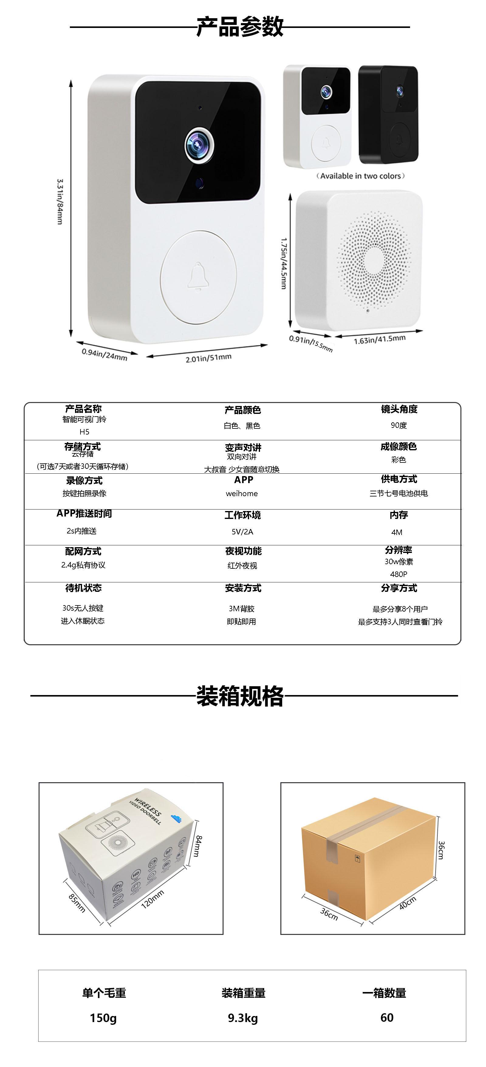 Timbre de video inteligente H5 para comercio electrónico transfronterizo, inalámbrico, remoto, monitoreo doméstico, videointercomunicador, visión nocturna de alta definición, captura