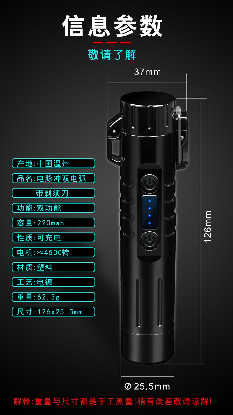 1:Nombre del producto: Encendedor de doble arco con navaja:2:Material del producto: ABS,3:Color del producto: galvanoplastia,4:Tamaño del producto: 126X25.5cm,5:Tamaño de la caja del producto: 43,5 x 28,5 x 42 cm.6:Embalaje de cartón independiente 1 pieza,7:Peso bruto por pieza: 145.8:Peso neto por pieza: 78