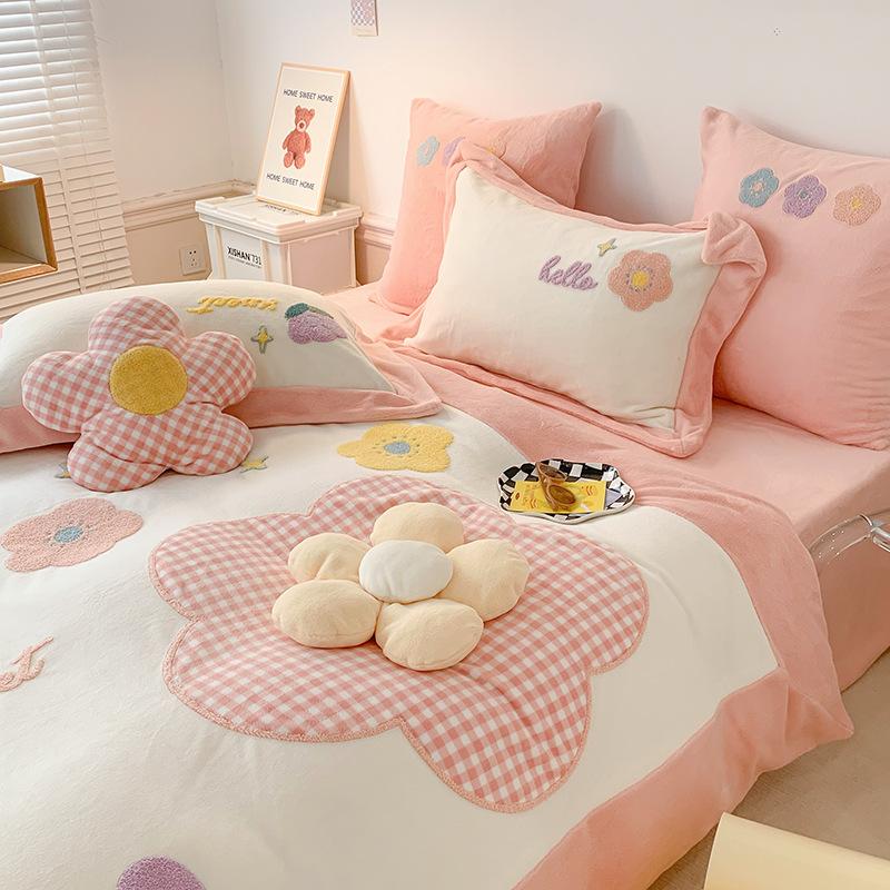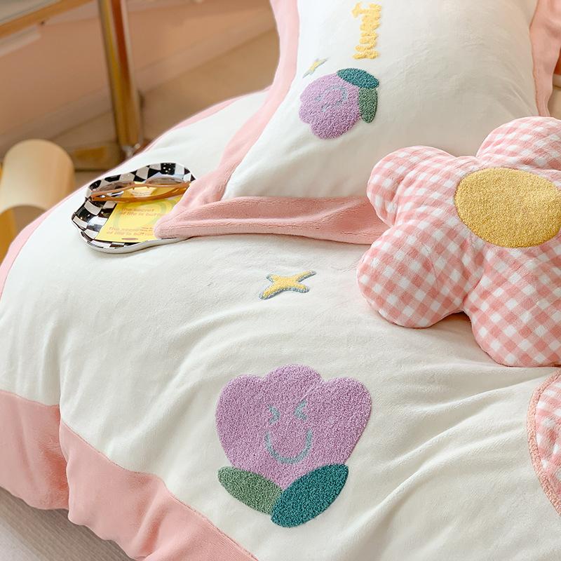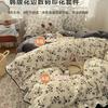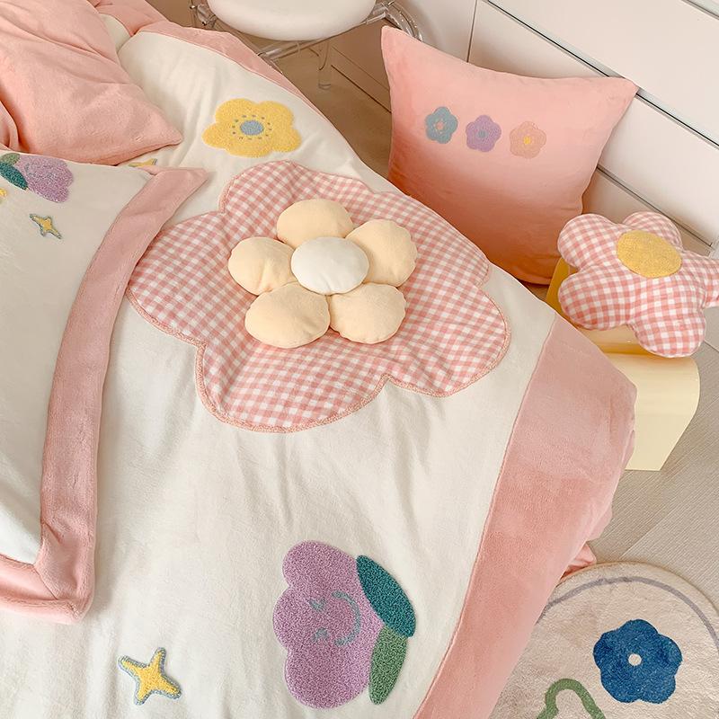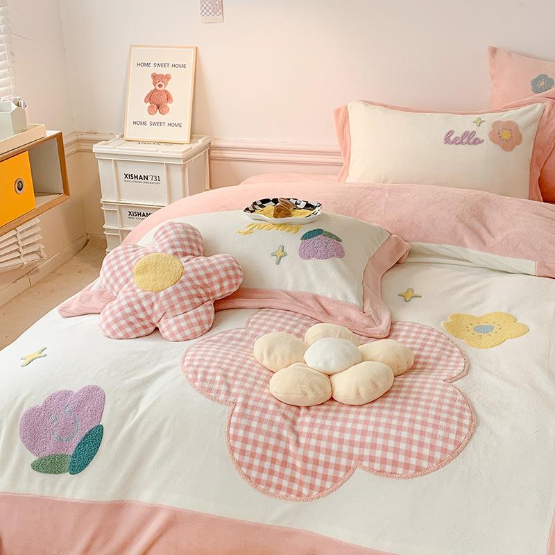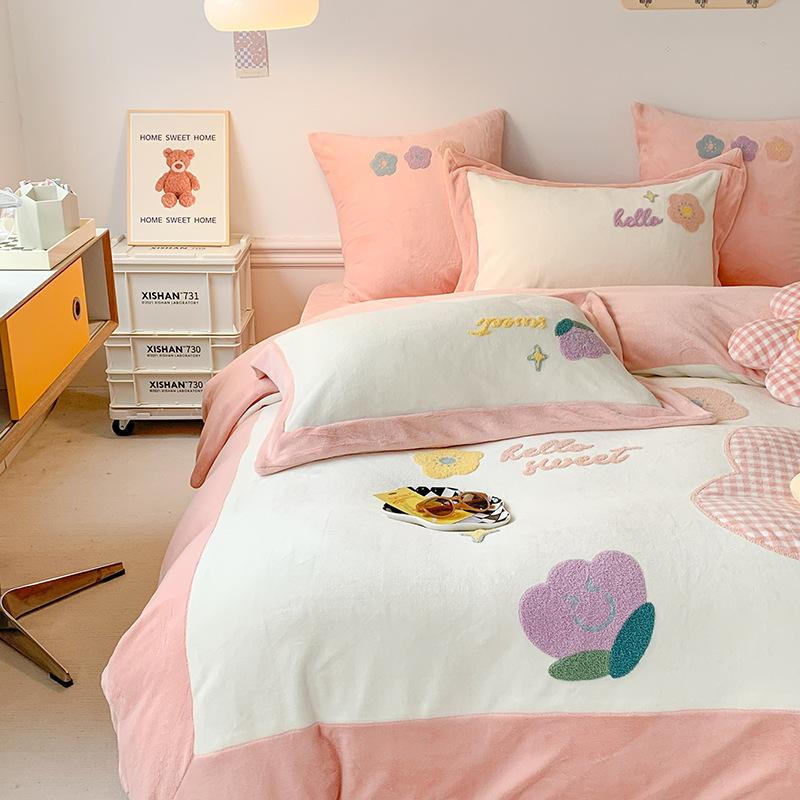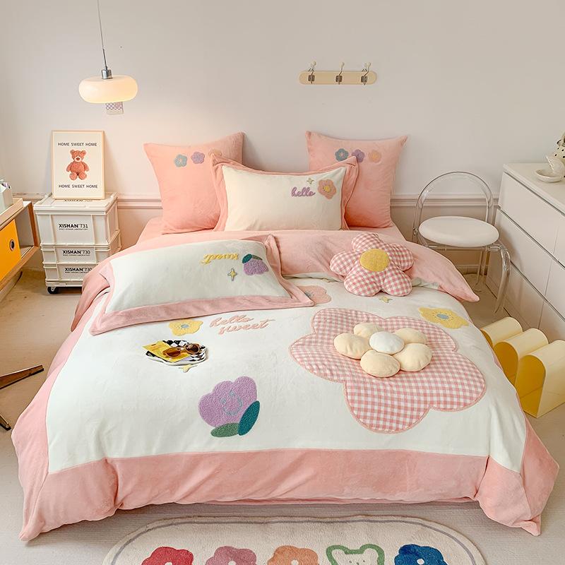 Edredón de terciopelo coral de cuatro piezas con diseño de princesa coreana, tridimensional, con flores y leche, de franela gruesa, para otoño e invierno